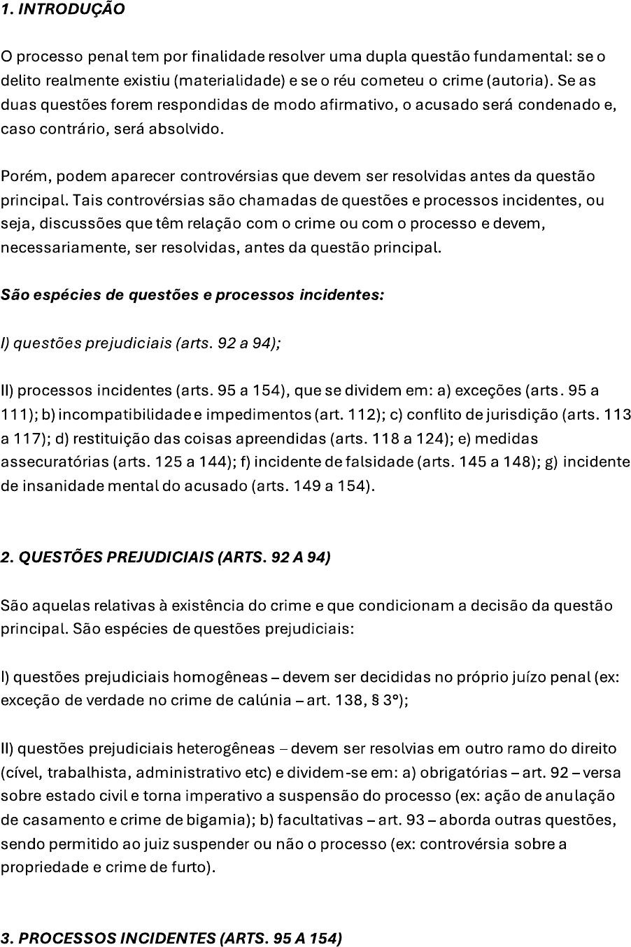 <p>1. INTRODUÇÃO processo penal tem por finalidade resolver uma dupla questão fundamental: se o delito realmente existiu (materialidade) e se o réu cometeu o crime (autoria). Se as duas questões forem respondidas de modo afirmativo, o acusado será condenado e, caso contrário, será absolvido. Porém, podem aparecer controvérsias que devem ser resolvidas antes da questão principal. Tais controvérsias são chamadas de questões e processos incidentes, ou seja, discussões que têm relação com o crime ou com o processo e devem, necessariamente, ser resolvidas, antes da questão principal. São espécies de questões e processos incidentes: I) questões prejudiciais (arts. 92 a 94); II) processos incidentes (arts. 95 a 154), que se dividem em: a) exceções (arts. 95 a 111); b) incompatibilidade e impedimentos (art. 112); c) conflito de jurisdição (arts. 113 a 117); d) restituição das coisas apreendidas (arts. 118 a 124); e) medidas assecuratórias 125 a 144); f) incidente de falsidade (arts. 145 a 148); g) incidente de insanidade mental do acusado (arts. 149 a 154). 2. QUESTÕES PREJUDICIAIS (ARTS. 92 A 94) São aquelas relativas à existência do crime e que condicionam a decisão da questão principal. São espécies de questões prejudiciais: I) questões prejudiciais homogêneas - devem ser decididas no próprio juízo penal (ex: exceção de verdade no crime de calúnia - art. 138, § II) questões prejudiciais heterogêneas - devem ser resolvias em outro ramo do direito (cível, trabalhista, administrativo etc) e dividem-se em: a) obrigatórias - art. 92 - versa sobre estado civil e torna imperativo a suspensão do processo (ex: ação de anulação de casamento e crime de bigamia); b) facultativas art. 93 - aborda outras questões, sendo permitido ao juiz suspender ou não o processo (ex: controvérsia sobre a propriedade e crime de furto). 3. PROCESSOS INCIDENTES (ARTS. 95 A 154)</p><p>São eventualidades que podem aparecer no decorrer do processo e devem ser resolvidas no próprio juízo criminal. 3.1 EXCEÇÕES O acusado pode se defender de duas formas: a) diretamente, quando ataca a imputação que lhe é feita pela acusação (negando a autoria, por exemplo); ou b) indiretamente, quando ataca o próprio processo, com o objetivo de extingui-lo sem o julgamento do mérito ou de, simplesmente, retardar o seu prosseguimento. Essa defesa indireta é denominada exceção e se divide em: a) peremptória, que impede o processo e julgamento do fato (coisa julgada e litispendência); b) dilatória, que prorroga a duração do processo, possibilitando, ainda, o julgamento do fato (suspeição, incompetência e ilegitimidade de parte). 3.1.1 EXCEÇÕES PEREMPTÓRIAS Uma pessoa não pode ser processada ou julgada mais de uma vez pelo mesmo fato (proibição do bis in idem). Assim, se dois ou mais processos correrem simultaneamente dar-se-á a litispendência e o que se iniciou por último deve ser extinto. Da mesma forma, se um processo chegou ao fim, isto é, a sentença transitou em julgado, impedindo qualquer recurso, a pessoa não pode mais ser julgada com relação fato. Esse fenômeno é denominado coisa julgada e também impede a instauração de novo processo sobre o crime já julgado. 3.1.2 EXCEÇÕES DILATÓRIAS (ARTS. 95 A 111) Podem ser de: a) suspeição - os órgãos responsáveis pela condução do processo penal devem ser imparciais, assim, se o juiz, o Ministério Público (MP) ou mesmo o perito incidirem tiverem relação com alguma das partes (art. 254) devem ser afastados do processo e os atos praticados serão considerados nulos (art. 564, I); b) incompetência todo juiz tem o poder de "dizer o direito", isto é, aplicar o direito ao caso concreto (jurisdição). Porém, esse poder não é absoluto, devendo ser observadas</p><p>algumas regras que o delimitam. Essa delimitação é denominada competência. A exceção é dirigida ao próprio juiz, que pode aceitá-la, remetendo os autos ao juiz competente, ou recusá-la, continuando no feito (art. 108). Da decisão que aceitar, cabe recurso em sentido estrito (art. 581, e da decisão que recusar a exceção, cabe habeas corpus; c) ilegitimidade de parte para atuar nos pólos passivo (réu) ou ativo (acusador) do processo penal é preciso que sejam preenchidos determinados requisitos (ex: nas ações penais privadas, apenas o ofendido ou o CADI podem figurar no pólo ativo). fato pode voltar a ser julgado se as partes legítimas estiverem em seus pólos. 3.2 INCOMPATIBILIDADES E IMPEDIMENTOS (ART. 112) impedimento, tal qual a suspeição, afeta a parcialidade dos órgãos responsáveis pela condução do processo. Porém, é mais grave, pois o juiz não pode exercer jurisdição no processo, por estar interessado em determinada solução da causa. As hipóteses de impedimento estão previstas no art. 252 e 253 e tornam o ato inexistente. Já a incompatibilidade cuida dos casos de parcialidade não previstos para a suspeição e impedimento e geralmente são previstas nas leis de organização judiciária. 3.3 CONFLITO DE JURISDIÇÃO (ARTS. Como visto, a competência é a delimitação da jurisdição. Se o réu considerar que determinado juiz é incompetente para o julgamento da causa, essa incompetência pode ser argüida por meio de exceção. Porém, essa não é a única forma de resolver as controvérsias relativas à competência, o que pode ser feito também por meio do chamado "conflito de jurisdição" (art. 113). conflito de jurisdição pode ocorrer nos seguintes casos (art. 114): a) dois ou mais juizes se consideram competentes (conflito positivo) ou incompetentes (conflito negativo) para julgar a causa; b) quando aparecer controvérsia sobre junção ou separação de processos. Ao contrário da exceção de suspeição, em que só o réu pode suscitar o incidente, no conflito de jurisdição, podem fazê-lo (art. 115): a) qualquer das partes (autor e réu); b) o MP, mesmo quando não for part