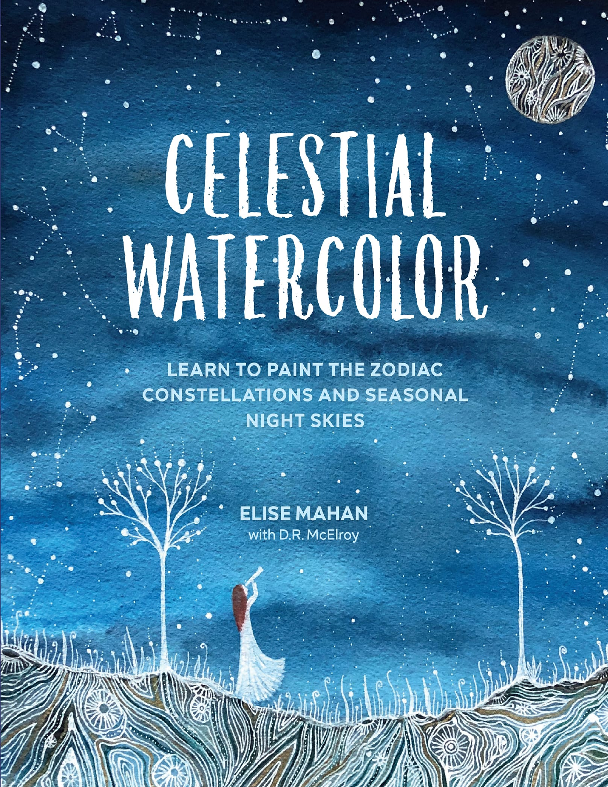 <p>CELESTIAL WATERCOLOR</p><p>LEARN TO PAINT THE ZODIAC CONSTELLATIONS AND SEASONAL</p><p>NIGHT SKIES</p><p>Elise Mahan with D.R. McElroy</p><p>CONTENTS</p><p>Introduction</p><p>1</p><p>Tools & Techniques</p><p>Watercolor Papers</p><p>Watercolor Paints</p><p>Paintbrushes</p><p>Pens & Pencils</p><p>Work Area</p><p>Themes</p><p>Painting with Watercolors</p><p>Washes</p><p>Wet-on-Wet Technique</p><p>Wet-on-Dry Technique</p><p>Colors & Effects</p><p>2</p><p>Astrological Signs</p><p>Fire Signs</p><p>Earth Signs</p><p>Air Signs</p><p>Water Signs</p><p>Painting Astrological Watercolors</p><p>An Astrological Watercolor</p><p>Astrological Variation</p><p>3</p><p>The Moon</p><p>Moon Lore</p><p>Painting Moon Watercolors</p><p>Painting a Moon Watercolor</p><p>Moon Variation</p><p>4</p><p>Seasonal Night Sky Landscapes</p><p>Painting Seasonal Night Sky Watercolors</p><p>Painting a Spring Waterclor</p><p>Summer Variation</p><p>Fall Variation</p><p>Winter Variation</p><p>Acknowledgments</p><p>About the Authors</p><p>I</p><p>Introduction</p><p>grew up in the lush and verdant forests of Northern California in a family</p><p>of artists, musicians, and writers. My love for art and nature began there</p><p>among the starry nights and majestic redwood trees that towered above the</p><p>place we called home. They stood as a constant reminder of the beauty and</p><p>power of the natural world and served as a source of reflection for me.</p><p>Even as a child I was always making artwork influenced by my adoration</p><p>of nature. I could often be found working in my sketchbook, making still-life</p><p>drawings using the flowers and botanical elements I found growing on our</p><p>land. Some of my favorite childhood memories were the nights my family</p><p>would gather our coziest blankets and lay them in the field near our home to</p><p>stargaze. We would listen to the sound of the wind move through the trees,</p><p>make up new constellations, learn about ancient ones, and sing songs about</p><p>the moon. The wild environment, along with those starry nights, always</p><p>remain with me as my muse as well as a source of inspiration when I paint.</p><p>I studied art history in college, where most of my classes were focused on</p><p>learning the names of artists and writing long essays about them. As much as</p><p>I adore art history and am constantly inspired by the artists I learn about, I</p><p>found myself drawn to creating art rather than writing about it. I work with</p><p>watercolor because I love the layered quality it gives my paintings; their</p><p>range of colors; their quick-drying nature; and the fact that it is possible to</p><p>purchase nontoxic watercolors, which helps a great deal because I share my</p><p>studio with a curious two-year-old who constantly wants to explore all of my</p><p>art materials.</p><p>In this book you can find a guide to the various techniques I use to create</p><p>my celestial paintings, as well as my preferred art materials and my artistic</p><p>process. You may use this book to create your own sky inspired by the four</p><p>seasons, learn about the constellations and astrological signs, and practice</p><p>different techniques to achieve a luminous moon painting. Thank you for</p><p>looking and I hope you enjoy my celestial corner of the universe.</p><p>—Elise Mahan</p><p>H ave you ever gazed at the night sky in wonder and awe, and felt a need to</p><p>somehow capture or contain its vast splendor into something more intimate</p><p>and understandable? It is not uncommon for us humans to feel overwhelmed</p><p>by the enormity of the universe and our tiny place in it. Millennia of artists,</p><p>philosophers, and storytellers have drawn inspiration from the stars, and</p><p>over time we have tried to grasp the vastness of the heavens by identifying</p><p>and naming familiar clusters of light that we could repeatedly locate and</p><p>refer to.</p><p>Nearly everyone has heard of the Big and Little Dippers in the Northern</p><p>Hemisphere. Some cultures refer to them as Ursa Major (The Great Bear)</p><p>and Ursa Minor (The Little Bear). Other familiar constellations were noted</p><p>by the ancient Greeks, and bear Greek names: Orion, Cassiopeia, and the</p><p>Pleiades, for example. Arguably, however, it is the zodiac constellations that</p><p>have had the greatest impact on humanity.</p><p>The study of the physical universe—its stars, planets, and space—is</p><p>called astronomy. The study of the movements of heavenly bodies as they</p><p>affect the world and human affairs is called astrology. Astronomy is science;</p><p>astrology is more of an art or philosophy. The field of knowledge in both</p><p>practices is as enormous as the cosmos itself. An astronomist may spend her</p><p>life studying a tiny fraction of the galaxy, while an astrologist can spend a</p><p>lifetime pursuing the subtleties of polarity, mutability, modality, and dignity</p><p>in his art.</p><p>This book is not about either discipline. It is an art book about painting</p><p>constellations, and as such the entire scope and depth of the philosophy and</p><p>practice of astrology in particular is beyond our ability to explore here.</p><p>It is our intent in this book to help you capture the wonder of the night sky</p><p>by learning to paint the constellations of the zodiac. Each constellation will</p><p>be demonstrated by Elise, and she will provide tips and techniques for</p><p>placing these constellations on your canvas, as well as where to locate them</p><p>in the sky. Background information on the signs and their characteristics in</p><p>astrology will also be provided. We will end with a discussion of the moon</p><p>and its phases in different cultures as well.</p><p>—D.R. McElroy</p><p>1</p><p>Tools & Techniques</p><p>Watercolor is an incredibly diverse medium, and with just a few materials</p><p>you can create your own celestial paintings inspired by the beauty and</p><p>power of the cosmos. In the 