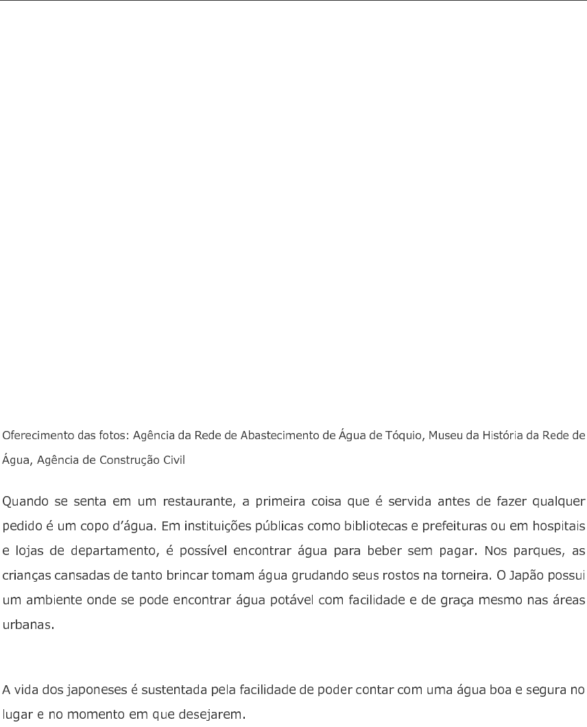 <p>Japão, a terra da água</p><p>1</p><p>A água do Japão</p><p>A água é uma dádiva que sempre esteve ao lado dos japoneses e que ajuda a lhes dar um colorido</p><p>na vida.</p><p>Basta girar a torneira para sair uma água limpa, um fato natural no Japão.</p><p>Isso, no entanto, é resultado de muito trabalho por trás dos bastidores.</p><p>Oferecimento das fotos: Agência da Rede de Abastecimento de Água de Tóquio, Museu da História da Rede de Água, Agência de Construção Civil Quando se senta em um restaurante, a primeira coisa que é servida antes de fazer qualquer pedido é um copo d’água. Em instituições públicas como bibliotecas e prefeituras ou em hospitais e lojas de departamento, é possível encontrar água para beber sem pagar. Nos parques, as crianças cansadas de tanto brincar tomam água grudando seus rostos na torneira. O Japão possui um ambiente onde se pode encontrar água potável com facilidade e de graça mesmo nas áreas urbanas. A vida dos japoneses é sustentada pela facilidade de poder contar com uma água boa e segura no lugar e no momento em que desejarem.</p><p>A água encanada do Japão é tão segura a ponto de poder beber direto da torneira (1ª foto, créditos: Aflo); inclusive, em Tóquio, existe um produto curioso que é a água da torneira de Tóquio engarrafada (2ª foto).</p><p>Água gostosa através da tecnologia avançada</p><p>Verificação de vazamento na madrugada. A identificação é feita escutando-se o som da água vazando do cano.</p><p>O sistema de água encanada do Japão, um dos melhores do mundo tanto em volume quanto em</p><p>qualidade, é responsável por possibilitar essa facilidade. Por exemplo, só na capital Tóquio, o</p><p>comprimento total do encanamento subterrâneo tem aproximadamente 27.000 km, o equivalente</p><p>a 2/3 da circunferência do planeta.</p><p>“Na verdade, não podemos dizer que Tóquio tenha condições favoráveis para a fabricação de água.</p><p>Por isso, para que possamos entregar uma água boa e segura, é necessário um esforço constante e</p><p>trabalho minucioso, desde a manutenção e plantio de uma vasta área florestal em torno dos</p><p>mananciais até a administração e operação dos canos de água”, diz o encarregado da Agência da</p><p>Rede de Abastecimento de Água de Tóquio (Bureau of Waterworks Tokyo Metropolitan</p><p>Government).</p><p>Como Tóquio é uma cidade bastante populosa, seu abastecimento também precisa ser</p><p>astronômico, e o rio que a abastece não é exatamente límpido. Assim, na capital, somado ao</p><p>método de purificação tradicional, todas as estações de tratamento que captam a água do rio Tone</p><p>contam com um sistema de ponta que aplica ozônio e carvão ativado biológico para decompor e</p><p>remover o mau odor e a sujeira da água.</p><p>A água de Tóquio assim produzida é de alto calibre. Em um teste comparativo feito com cidadãos,</p><p>quase a metade disse que a água encanada era melhor que a água mineral vendida no comércio.</p><p>A qualidade da água muda também de acordo com o cuidado dos equipamentos do sistema de</p><p>distribuição, por isso, a sua manutenção é feita com extremo rigor. Canalizações antigas são</p><p>substituídas estrategicamente, e durante a madrugada o barulho da água é escutado por ouvidos</p><p>humanos através de uma espécie de “estetoscópio” posicionado no asfalto para investigar</p><p>vazamentos por toda a cidade. Graças a isso, o índice de vazamento de água em Tóquio nos últimos</p><p>anos mantém a marca dos 2%, um índice de primeiríssima qualidade a nível mundial, tendo em</p><p>vista a média de 10% a 20% entre as principais capitais do mundo. 1</p><p>2</p><p>Em Tóquio, é utilizado um método de purificação através do ozônio. 1) Gerador de ozônio; 2) piscina com ozônio. O forte poder oxidante do ozônio decompõe as matérias orgânicas da água.</p><p>O início da rede de abastecimento na Modernidade</p><p>A rede de abastecimento de água em Tóquio teve sua origem em 1590, quando foi inaugurada a</p><p>rede de água de Koishikawa (atual rede de Kanda). O sistema consistia em enviar água aos poços</p><p>por canos feitos de pedra e madeira. Assim, na época, em Edo (atual Tóquio), foi montada uma</p><p>verdadeira teia de canos que transportavam água utilizando tecnologias avançadas como</p><p>transportar água de um nível baixo para outro mais alto utilizando o princípio do sifão ou passando</p><p>os canos no fundo dos rios.</p><p>Poços que captavam a água encanada foram instalados em diversos cantos da cidade, e a</p><p>população pegava a água deles e a utilizava para beber ou atender os afazeres cotidianos; os poços</p><p>eram as torneiras da época. Há 400 anos, as pessoas já começavam a ter uma vida em que podiam</p><p>usufruir da água quando e onde quisesse.</p><p>E o costume de ter a água sempre em mão continua até hoje. De manhã, ao acordar, umedece-se a</p><p>garganta com um copo d’água tirada da torneira, e ao final do dia, entra-se em uma banheira</p><p>transbordando água quente. A vida no Japão é agraciada com a dádiva da água em abundância.</p><p>Canalização de pedra para transportar água de Kanda (realocado e restaurado). Era instalada no subsolo e usada para transportar água.</p><p>Cano de madeira usado em Edo. É uma madeira rígida e maciça, altamente impermeável.</p><p>Poço de água que era instalado em Edo. Cerca de 2/3 ficava enterrado, captava e armazenava a água que vinha dos canos.</p><p>2</p><p>Defendendo as cidades da água</p><p>Reservatório de detenção do rio Kanda no subsolo da Linha Kanjo</p><p>Nana-go</p><p>Interior do túnel. Ele retém até 540 mil toneladas de água.</p><p>Um imenso túnel se comporta logo abaixo da Linha Kanjo Nana-go (Anel Viário Nº 7), autoestrada</p><p>que dá a volta nos 23 distritos de Tóquio. Localizada a 40 m abaixo do solo em uma profundidade</p><p>mai