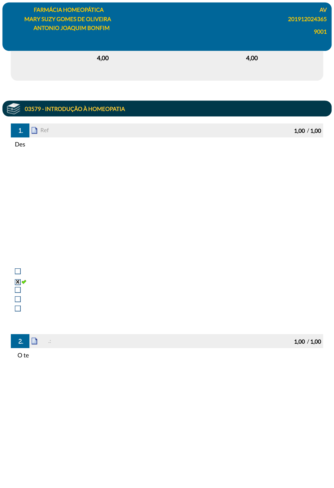 <p>25/11/2023, 14:02 EPS</p><p>https://simulado.estacio.br/alunos/ 1/5</p><p>Disciplina: FARMÁCIA HOMEOPÁTICA AV</p><p>Aluno: MARY SUZY GOMES DE OLIVEIRA 201912024365</p><p>Professor: ANTONIO JOAQUIM BONFIM</p><p>Turma: 9001</p><p>DGT1156_AV_201912024365 (AG) 20/10/2023 14:21:13 (F)</p><p>Avaliação: 4,00 pts Nota SIA: 4,00 pts</p><p>Dispositivo liberado pela Matrícula 201912024365 com o token 46915 em 20/10/2023 14:21:02.</p><p>03579 - INTRODUÇÃO À HOMEOPATIA</p><p>1. Ref.: 7663385 Pontos: 1,00 / 1,00</p><p>Desde o estabelecimento da homeopatia por Hahnemann até os dias atuais, a complexidade das doenças e sintomas,</p><p>bem como a experiência clínica dos homeopatas, levou à criação de diferentes escolas de pensamento homeopático.</p><p>AnaliseI as seguintes a�rmativas e marque a alternativa que traz, respectivamente, a que escola homeopática</p><p>correspondem.</p><p>I - Prescrição de dois ou mais medicamentos que cobrem a gama de sintomas do paciente, administrados em</p><p>momentos diferentes para que ajam de forma sinérgica;</p><p>II - Prescrição de dois ou mais medicamentos que devem ser administrados ao mesmo tempo;</p><p>III - Prescrição de um único medicamento que cobre a totalidade dos sintomas do paciente;</p><p>IV - Foco nos órgãos e sistemas e não no paciente como um todo, desconsiderando os sintomas mentais e</p><p>emocionais.</p><p>Marque a alternativa que relaciona corretamente as a�rmativas com as 4 escolas da homeopatia nomeadas</p><p>respectivamente abaixo.</p><p>Complexismo, Pluralismo, Organicismo e Unicismo.</p><p>Pluralismo, Complexismo, Unicismo e Organicismo.</p><p>Pluralismo, Complexismo, Organicismo e Unicismo.</p><p>Organicismo, Complexismo, Unicismo e Pluralismo.</p><p>Complexismo, Pluralismo, Unicismo e Organicismo.</p><p>2. Ref.: 7663435 Pontos: 1,00 / 1,00</p><p>''O termo ''racionalidade médica'' foi criado por Madel nos anos de 1991 e 1992 num estudo comparativo de quatro</p><p>sistemas médicos: a medicina ocidental contemporânea ou biomedicina e as medicinas homeopática, tradicional</p><p>chinesa e a ayurvédica.''</p><p>Sobre a racionalidade médica e medicina convencional, analise as a�rmações abaixo no que tange suas diferenças.</p><p>I - Enquanto a medicina convencional adota um modelo humanístico/biomédico e a racionalidade médica um modelo</p><p>bio-psico-espiritual-social/holístico</p><p>II - Em tema de saúde, a racionalidade médica possui uma visão centrada na busca pelo resultado da atividade</p><p>externa como meio para restabelecer a harmonia das funções do corpo.</p><p>III - Quanto a doença, a medicina convencional olha a quebra da máquina, desvio das normas biológicas e não</p><p>acredita que há signi�cado intrínseco.</p><p>IV - O foco do diagnóstico aplicado pela medicina foca no nível de grupo e a racionalidade médica o nível individual,</p><p>nível de sistema.</p><p>javascript:alert('C%C3%B3digo da quest%C3%A3o: 7663385.');</p><p>javascript:alert('C%C3%B3digo da quest%C3%A3o: 7663385.');</p><p>javascript:alert('C%C3%B3digo da quest%C3%A3o: 7663435.');</p><p>javascript:alert('C%C3%B3digo da quest%C3%A3o: 7663435.');</p><p>25/11/2023, 14:02 EPS</p><p>https://simulado.estacio.br/alunos/ 2/5</p><p>V - Sobre o tratamento a medicina convencional apresenta diretrizes/protocolos orientados para o grupo, luta contra</p><p>doenças, requer recursos externos, utiliza farmacoterapia com efeitos predominantemente especí�cos e alto uso de</p><p>tecnologia. Por outro lado, a racionalidade médica age com Intervenções individualizadas complexas, promoção de</p><p>saúde, demanda recursos internos. Corpo, mente, espírito estão inter-relacionados e todos devem ser considerados</p><p>na cura, utilizam de farmacoterapia dos SMC e terapias não medicamentosas com efeitos de sistema.</p><p>Marque a alternativa que apresenta as a�rmativas corretas.</p><p>I, III, IV e V</p><p>II, IV e V</p><p>II, III e V</p><p>I, II, III e IV</p><p>I, II e IV</p><p>03580 - SEMIOLOGIA E FARMACOLOGIA HOMEOPÁTICA</p><p>3. Ref.: 7664663 Pontos: 0,00 / 1,00</p><p>Em uma consulta homeopática o pro�ssional homeopata escuta, interroga, observa e examina o paciente a �m de</p><p>obter a totalidade da semiologia capazes de esboçar um quadro do estado do paciente. Dentre as sentenças</p><p>apresentadas, marque a correta:</p><p>O médico homeopata deverá se ater a prescrição de medicamentos homeopáticos, indicações de medidas de</p><p>higiene, alimentação e qualidade de vida devem ser dadas pelas outras especialidades.</p><p>Deve-se atribuir adjetivos que caracterizem os sinais e sintomas relatados, bem como intensidade, época,</p><p>horário do surgimento.</p><p>A parcialidade de dos sintomas traduz o modo do agir do paciente frente às adversidades, independente do</p><p>diagnostico patológico.</p><p>A pergunta indireta: "como você se sente antes, durante e após a menstruação" deve ser substituída pela:</p><p>"apresenta dor de cabeça durante a menstruação?".</p><p>O médico homeopata deverá fazer perguntas diretas e objetivas, a �m de minimizar equívocos no</p><p>entendimento dos sinais e sintomas.</p><p>4. Ref.: 7664832 Pontos: 0,00 / 1,00</p><p>Os medicamentos homeopáticos não são descritos pela concentração de ativos, mas sim por sua potência, ou seja,</p><p>pela força que atuará no organismo. Sobre a relação potência e diluição dos medicamentos homeopáticos, analise as</p><p>a�rmativas abaixo.</p><p>I. A diluição das drogas homeopáticas tem o objetivo de minimizar as agravações.</p><p>II. Quanto mais concentrado as drogas homeopáticas, mais potentes elas serão.</p><p>III. Em drogas homeopáticas de baixa potência serão notados efeitos patogenéticos decorrentes da concentração</p><p>maior de insumo ativo.</p><p>IV. Em drogas de baixa potência, há menor quantidade de princípio ativo.</p><p>V. Quanto mais diluído as drogas homeopáticas, mais potentes el
