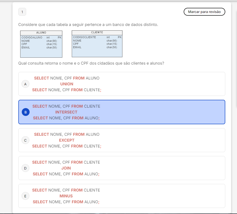 <p>1 Marcar para revisão Considere que cada tabela a seguir pertence a um banco de dados distinto. ALUNO CLIENTE CODIGOALUNO int PK CODIGOCLIENTE int PK NOME char(90) NOME char(90) CPF char(15) CPF char(15) EMAIL char(50) EMAIL char(50) Qual consulta retorna nome e O CPF dos cidadãos que são clientes e alunos? SELECT NOME, CPF FROM ALUNO A UNION SELECT NOME, CPF FROM CLIENTE; SELECT NOME, CPF FROM CLIENTE INTERSECT SELECT NOME, CPF FROM ALUNO; SELECT NOME, CPF FROM ALUNO C EXCEPT SELECT NOME, CPF FROM SELECT NOME, CPF FROM CLIENTE D JOIN SELECT NOME, CPF FROM ALUNO; SELECT NOME, CPF FROM CLIENTE E MINUS SELECT NOME, CPF FROM ALUNO;</p>