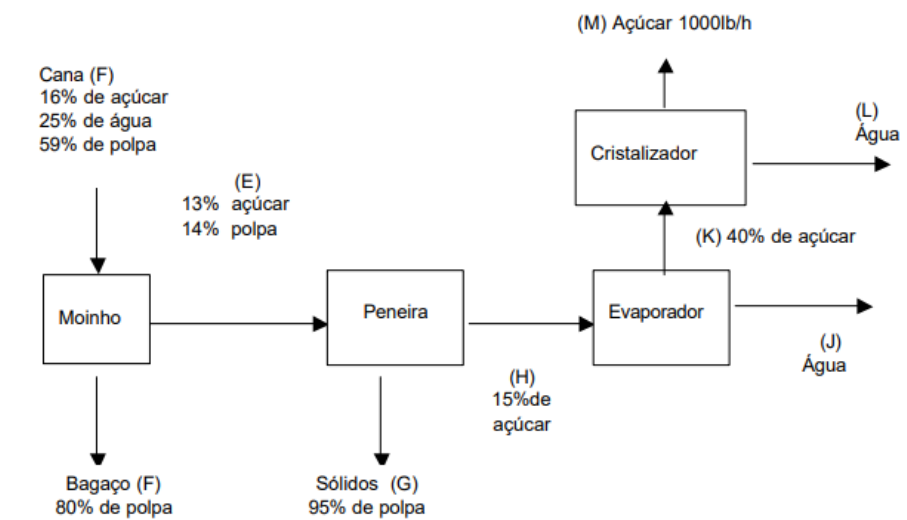 <p>Prof. José Diego Magalhães Soares</p><p>Disciplina: Operações Unitárias</p><p>LISTA DE EXERCÍCIOS 1 – Balanço de Massa</p><p>1. Para preparar uma solução de 50% de ácido sulfúrico, um rejeito ácido diluído contendo 28%</p><p>de H2SO4 é reforçado com um ácido sulfúrico comprado contendo 96% de H2SO4. Quantos</p><p>quilogramas de ácido devem ser comprados para cada 100 kg de ácido diluído?</p><p>R: 47,8kg de ácido</p><p>2. Uma solução aquosa de decapagem (retirada de película metálica deposita) contendo 8,8% de</p><p>KI está sendo preparada para decapar ouro em placas de circuito impresso. A solução desejada</p><p>deve ser preparada pela combinação de uma solução forte (12% de KI e 3% de I2 em H2O) com</p><p>uma solução fraca (2,5% de KI e 0,625% de I2 em H2O). Qual deve ser o valor de R, a razão</p><p>entre as massas de solução forte e fraca para fazer a solução de decapagem desejada? Qual será</p><p>a concentração de I2 na solução final? R: valor de R=1,97, concentração de I2 =2,2%</p><p>3. Um fluxograma simplificado para a fabricação de açúcar é apresentado na figura abaixo. A</p><p>cana de açúcar é alimentada em um moinho onde o xarope é espremido e o bagaço resultante</p><p>contém 80% em massa de polpa. O xarope (E) contendo pedaços de polpa finamente divididos</p><p>é alimentado em uma peneira que remove toda a polpa e produz xarope límpido (H), contendo</p><p>(15%) de açúcar e 85% de água. O evaporador prepara um xarope “pesado” e o cristalizador</p><p>produz 1000lb/h de cristais de açúcar.</p><p>(a) Calcule a água removida no evaporador, em libras/hora;</p><p>(b) Calcule as frações mássicas dos componentes na corrente de rejeito G;</p><p>(c) Calcule taxa de alimentação da cana, em libras/hora;</p><p>(d) Do açúcar contido na cana, qual a percentagem que é perdida no bagaço?</p><p>R: L=1500 lbm/h; J=4167 lbm/h; H=6667 lbm/h; E=7819 lbm/h; G=1152 lbm/h</p><p>Rejeito: açúcar=0,015; água=0,035 e polpa=0,95 – F=24596 lbm/h, perda=73,9%</p><p>Prof. José Diego Magalhães Soares</p><p>Disciplina: Operações Unitárias</p><p>4. Uma solução ácida com 60% de H2SO4, 20% de HNO3 e 20% de H2O deve ser obtida pela</p><p>mistura das seguintes soluções: S1 = 10% de HNO3, 60% de H2SO4 e 30% de H2O; S2 = 90% de</p><p>HNO3 e 10% de H2O; S3 = 95% de H2SO4 e 5% de H2O. Calcule a massa de cada solução a ser</p><p>misturada para se obter 1000 kg da solução. R.: S1 = 568,2 kg, S2 = 159,1 kg, S3 = 272,7kg.</p><p>5. Uma mistura líquida de benzeno (58,20%), tolueno (20,40%) e xileno (21,40%) é carga de</p><p>um processo de destilação. A recuperação de benzeno no destilado deve ser de 98,0% e a de</p><p>xileno no resíduo deve ser de 95,0%. A fração mássica de benzeno no destilado (líquido) deve</p><p>ser de 90,0%. Calcule a composição mássica do destilado e do resíduo. R.: D: 90,0%, 8,3%,</p><p>1,7% B: 3,17%, 41,32%, 55,51%</p><p>6. Água do mar contendo 3,5% (massa) passa por uma série de 10 evaporadores.</p><p>Aproximadamente quantias iguais de água são evaporadas em cada uma das 10 unidades, que</p><p>são então condensadas para formam uma corrente de água limpa. O produto de fundo do último</p><p>evaporador contém 5% de sal. Se 30 000 kg/h de água do mar forem alimentadas no processo,</p><p>calcule a fração de água limpa produzida e a porcentagem de sal no produto de fundo do quarto</p><p>evaporador. R: fração=0,3 e sal=3,98%</p><p>7. Uma coluna de destilação separa 10000 kg/h de uma mistura de benzeno-tolueno (50%-50%).</p><p>O produto recuperado no condensador, no topo da coluna, contém 95% de benzeno e a corrente</p><p>de fundo da coluna contém 96% de tolueno. A corrente de vapor que entra no condensador pelo</p><p>topo da coluna registra 8000 kg/h. Uma parte do produto é retornada como refluxo. Suponha</p><p>que as composições das correntes V, D e R sejam idênticas. Encontre a razão de quantidade de</p><p>produto reciclada em relação ao produto D.</p>