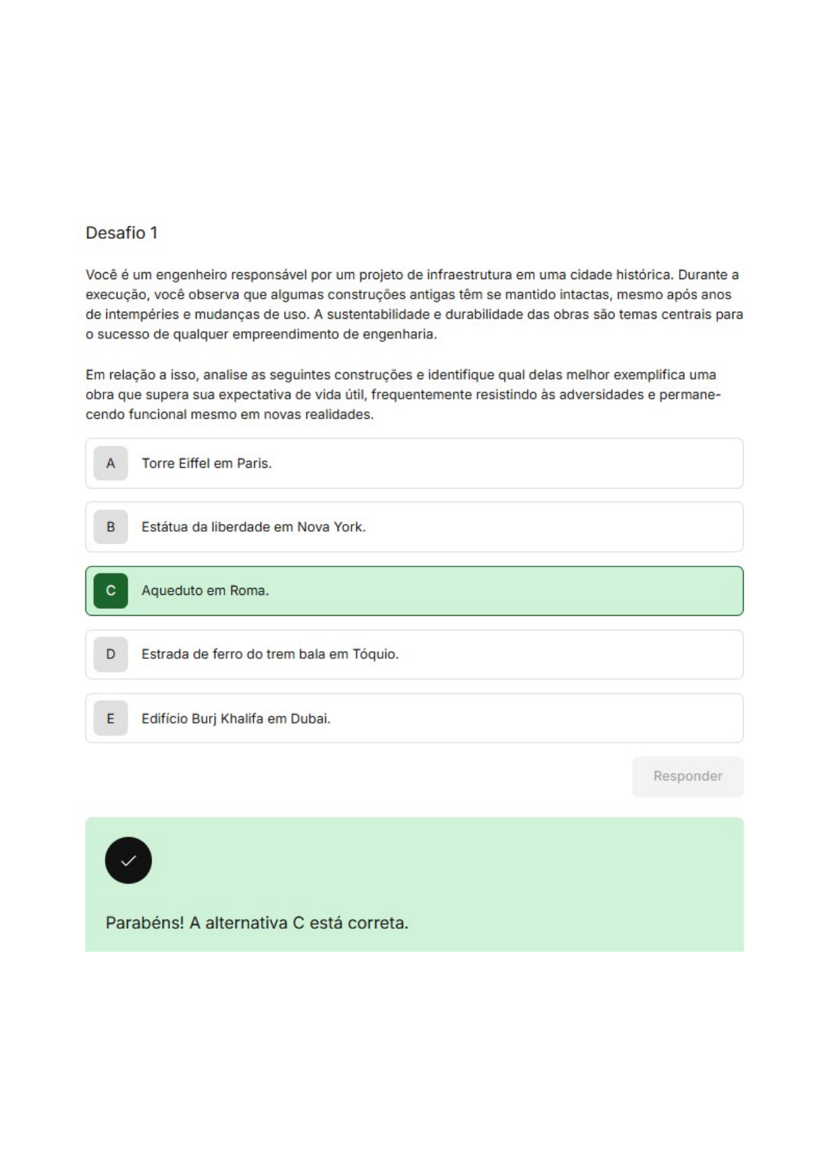 <p>Desafio 1 Você é um engenheiro responsável por um projeto de infraestrutura em uma cidade histórica. Durante a execução, você observa que algumas construções antigas têm se mantido intactas, mesmo após anos de intempéries e mudanças de uso. A sustentabilidade e durabilidade das obras são temas centrais para o sucesso de qualquer empreendimento de engenharia. Em relação a isso, analise as seguintes construções e identifique qual delas melhor exemplifica uma obra que supera sua expectativa de vida útil, frequentemente resistindo às adversidades e permane- cendo funcional mesmo em novas A Torre Eiffel em Paris. B Estátua da liberdade em Nova York. C Aqueduto em Roma. D Estrada de ferro do trem bala em Tóquio. E Edifício Burj Khalifa em Responder Parabéns! A alternativa C está correta.</p>
