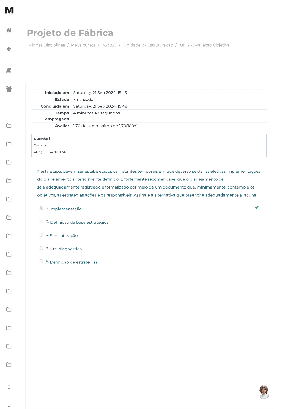<p>M Projeto de Fábrica Minhas Disciplinas / Meus cursos / 423827 / Unidade 2 - Estruturação / UN 2 - Avaliação Objetiva Iniciado em Saturday, 21 Sep 2024, 15:43 Estado Finalizada Concluída em Saturday, 21 Sep 2024, 15:48 Tempo 4 minutos 47 segundos empregado Avaliar 1,70 de um máximo de 1,70(100%) Questão 1 Correto Atingiu 0,34 de 0,34 Nesta etapa, devem ser estabelecidos os instantes temporais em que deverão se dar as efetivas implementações do planejamento anteriormente definido. É fortemente recomendável que planejamento de seja adequadamente registrado e formalizado por meio de um documento que, minimamente, contemple os objetivos, as estratégias ações e os responsáveis. Assinale a alternativa que preenche adequadamente a lacuna. a. Implementação. b. Definição da base estratégica. C. Sensibilização. d. Pré-diagnóstico. e. Definição de estratégias.</p><p>Questão 2 M Correto Atingiu 0,34 de 0,34 Um dos elementos fundamentais da fase de estruturação da metodologia PFL é que contempla: resumo executivo, as linhas de produtos, a pesquisa de mercado, a capacidade empresarial, a estratégia de negócios, o plano de marketing, o planejamento e desenvolvimento do projeto e plano financeiro. Assinale a alternativa que preenche adequadamente a lacuna. a. projeto de implantação. b. plano de negócio. C. projeto de fábrica. d. projeto de layout. e. A estruturação. Questão 3 Correto Atingiu 0,34 de 0,34 Esta etapa se refere à(ao) dos colaboradores da organização em relação à importância do planejamento, de modo a promover o engajamento e comprometimento de todos. Esta etapa é a(o): a. Implementação. b. Definição de estratégias. C. Sensibilização. d. Pré-diagnóstico. e. Definição da base estratégica.</p><p>Questão 4 M Correto Atingiu 0,34 de 0,34 Trata-se da definição da identidade da organização e do consequente desdobramento de conceitos, a partir dos quais são estabelecidos os objetivos da organização. Esse conceito remete à(ao): a. sensibilização. b. pré-diagnóstico. C. definição da base estratégica. d. implementação. e. definição de estratégias. Questão 5 Correto Atingiu 0,34 de 0,34 Todo projeto visa a uma implementação em atendimento a um objetivo ou a uma demanda, o que, invariavelmente, envolve investimentos antes, durante e depois da efetiva entrega do projeto. Nesse sentido, os investimentos, bem como só a lucratividade e o retorno sobre eles, são aspectos fundamentais tratados na fase de estruturação da metodologia PFL, por meio da(o): a. Desempenho organizacional. b. Plano financeiro. C. Monitoramento. d. Eficiência organizacional. e. Plano de marketing. Conteúdo Online Seguir para... Conteúdo Online</p>