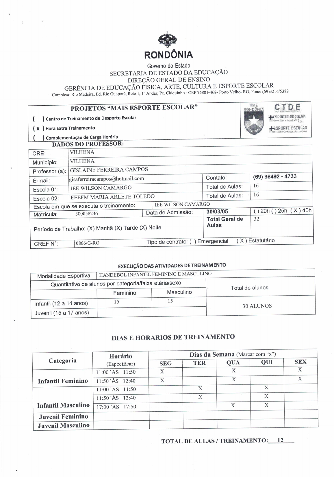 <p>RONDÔNIA Governo do Estado SECRETARIA DE ESTADO DA EDUCAÇÃO DIREÇÃO GERAL DE ENSINO GERÊNCIA DE EDUCAÇÃO FÍSICA, ARTE, CULTURA E ESPORTE ESCOLAR Complexo Rio Madcira, Ed. Rio Guaporé, Reto 1, 1° Andar, Pc. Chiquinho - CEP 76801-468- Porto Velho- RO, (69)3216/5389 PROJETOS "MAIS ESPORTE ESCOLAR" TIME RONDONIA CTDE ( ) Centro de Treinamento de Desporto Escolar ESPORTE ESCOLAR ( ) Hora Extra Treinamento ESPORTE ESCOLAR ( ) Complementação de Carga Horária DADOS DO PROFESSOR: CRE: VILHENA Município: VILHENA Professor (a): GISLAINE FERREIRA CAMPOS E-mail: gisaferreiracampos@hotmail.com Contato: (69) 98492 - 4733 Escola 01: IEE WILSON CAMARGO Total de Aulas: 16 Escola 02: EEEFM MARIA ARLETE TOLEDO Total de Aulas: 16 Escola em que se executa o treinamento: IEE WILSON CAMARGO Matrícula: 300058246 Data de Admissão: 30/03/05 ( ) 20h 25h (X) 40h Total Geral de 32 Período de Trabalho: (X) Manhã (X) Tarde (X) Noite Aulas CREF 0866/G-RO Tipo de contrato: ( ) Emergencial (X) Estatutário EXECUÇÃO DAS ATIVIDADES DE TREINAMENTO Modalidade Esportiva HANDEBOL INFANTIL FEMININO E MASCULINO Quantitativo de alunos por categoria/faixa etária/sexo Total de alunos Feminino Masculino Infantil (12 a 14 anos) 15 15 30 ALUNOS Juvenil (15 a 17 anos) DIAS E HORARIOS DE TREINAMENTO Horário Dias da Semana (Marcar com "x") Categoria (Especificar) SEG TER QUA QUI SEX 11:00 'AS 11:50 X X X Infantil Feminino 11:50 12:40 X X X 11:00 11:50 X X 11:50 12:40 X X Infantil Masculino 17:00 17:50 X X Juvenil Feminino Juvenil Masculino TOTAL DE AULAS / TREINAMENTO: 12</p><p>RONDÔNIA Governo do Estado SECRETARIA DE ESTADO DA EDUCAÇÃO DIREÇÃO GERAL DE ENSINO GERÊNCIA DE EDUCAÇÃO FÍSICA, ARTE, CULTURA E ESPORTE ESCOLAR Complexo Rio Madcira, Ed. Rio Guaporé, Reto 1, 1° Andar, Pc. Chiquinho - CEP 76801-468- Porto Velho- RO, Fonc: (69)3216/5389 DA EQUIPE NO JOER Citar e marcar (x) nos (EX: 1°, 2°, etc.) FASE últimos 3 anos Ex. 2021 Ex.2022 Ex. 2023 INF/FEM INF/MASC JUV/FEM JUV/MASC MUNICIPAL X X X X REGIONAL X X X X ESTADUAL NACIONAL PARTICIPAÇÃO DA EQUIPE EM OUTROS EVENTOS ANO EVENTO PERÍODO LOCAL CLASSIFICAÇÃO OBJETIVO GERAL Preparar equipes de Handebol infantil feminino e masculino para participar dos Jogos Escolares de Rondônia - JOER em todas as suas fases (Municipal, Regional e Estadual), dando-lhes possibilidade de participar de forma competitiva visando a classificação para os Jogos Escolares Brasileiros - edição 2024.</p><p>RONDÔNIA Governo do Estado SECRETARIA DE ESTADO DA EDUCAÇÃO DIREÇÃO GERAL DE ENSINO GERÊNCIA DE EDUCAÇÃO FÍSICA, ARTE, CULTURA E ESPORTE ESCOLAR Complexo Rio Ed. Rio Guaporé, 1, 1° Andar, Pc. Chiquinho CEP 76801-468- Porto Velho- RO, Fonc: (69)3216/5389 OBJETIVOS ESPECÍFICOS Propiciar o conhecimento e prática do desporto Handebol; Oportunizar o desenvolvimento técnico e tático específico da modalidade; Proporcionar uma vida ativa aos participantes através do exercício físico por meio do desporto Handebol; Aprimorar a Coordenação motora, ritmo, percepção espacial e controle da bola; Desenvolver a liderança, o espírito de equipe e bem como a conduta desportiva para a prática do esporte em competição, aplicando disciplina e respeito como princípios; Oportunizar a preparação para os Jogos Escolares de Rondônia; A ocupação dos alunos em períodos ociosos de risco; Auxiliar no processo pedagógico através da disciplina e comportamento; PÚBLICO ALVO: Alunos matriculados no IEE Wilson Camargo na faixa etária de 11 à 14 anos.</p><p>RONDÔNIA Governo do Estado SECRETARIA DE ESTADO DA EDUCAÇÃO DIREÇÃO GERAL DE ENSINO GERÊNCIA DE EDUCAÇÃO FÍSICA, ARTE, CULTURA E ESPORTE ESCOLAR Complexo Rio Ed. Rio Reto 1, 1° Andar, Pc. Chiquinho CEP 76801-468- Porto Velho- RO, Fonc: (69)3216/5389 CONTEÚDO A SER TRABALHADO Fundamentos técnicos - Empunhadura, recepção, passe, arremesso, progressão e drible. Armação Tática - Setores defensivos - Técnicas de defesa - desesa 6 X 0 Defesa 5 X 1 Defesa 4 2 Defesa Sistema de ataque - Fluxo de ataque Jogadas sem bola Engajamento Ataques com dois pivôs - Jogadores de ponta transformam-se Em segundo pivô. Armadores, esquerdo e direito, transformam-se em segundo pivô. METODOLOGIA DE TREINAMENTO Treinos teóricos e práticos específicos da modalidade de Handebol, dando ênfase nos Fundamentos técnicos, treinamento de goleiro, esquemas táticos, resistência orgânica geral, sistemas energéticos, bem como Jogos práticos e amistosos. espaço utilizado será a quadra esportiva da Escola Wilson Camargo. As atividades serão desenvolvidas com metodologia tecnicista aliada ao embasamento pedagógico, com utilização de materiais esportivos e mídias existentes na escola.</p><p>RONDÔNIA Governo do Estado SECRETARIA DE ESTADO DA EDUCAÇÃO DIREÇÃO GERAL DE ENSINO GERÊNCIA DE EDUCAÇÃO FÍSICA, ARTE, CULTURA E ESPORTE ESCOLAR Complexo Rio Madcira, Ed. Rio Guaporé, 1, Andar, Pc. Chiquinho CEP 76801-468- Porto Velho- RO, Fone: (69)3216/5389 CRONOGRAMA DAS ATIVIDADES AÇÕES MAR ARE our NON Treinamento específico X X X X X Jogos da Fase Municipal X Jogos da Fase Regional X Jogos da Fase Estadual Mod X Coletivas Jogos Fase Regional Nacional Jogos Escolares Brasileiros X PERIODIZAÇÃO DE TREINAMENTO PERÍODO PREPARATÓRIO PERÍODO PERÍODO PARTICULARIDADES ETAPA PREP. ETAPA PREP. COMPETITIVO TRANSITÓRIO GERAL ESPECIAL Atividades com Valências o foco nas físicas motoras: Exercícios Correção de habilidades 1. Orientação do força, agilidade, funcionais de deficiências, cognitivas treinamento resistência, manutenção da revitalização do motoras, de velocidade e forma física motora. treinamento e atenção e lateralidade. jogos educativos execução. Circuito de treinamento, volume e carga Jogos Atividades Exercícios de 2. Preparação de exercícios cooperativos dos coordenativas recuperação neuro física para os sistemas táticos motoras muscular membros e técnicos superiores e in
