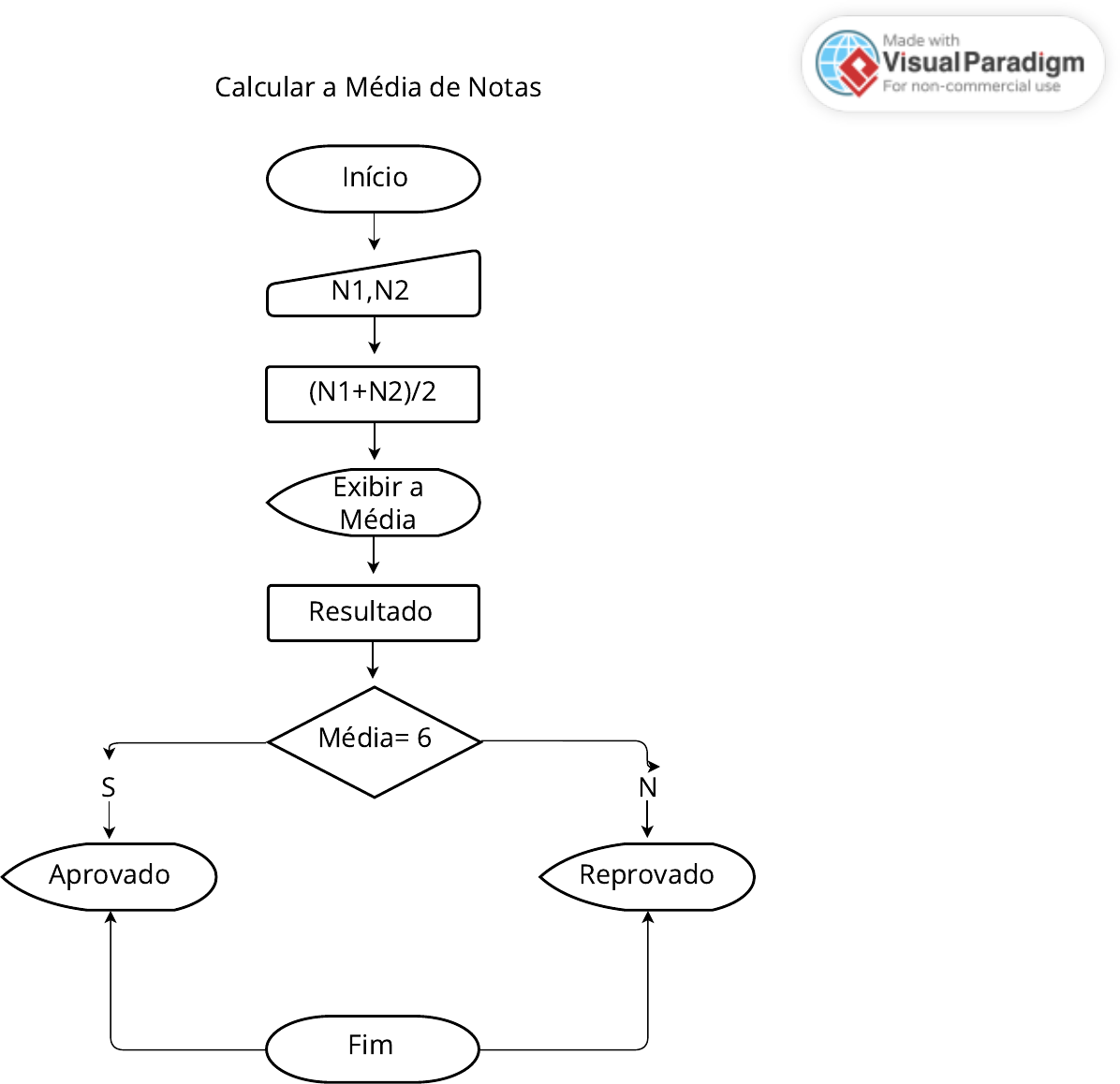 <p>Calcular a Média de Notas</p><p>Início</p><p>N1,N2</p><p>Exibir a</p><p>Média</p><p>(N1+N2)/2</p><p>Resultado</p><p>Média= 6</p><p>S N</p><p>Aprovado Reprovado</p><p>Fim</p>