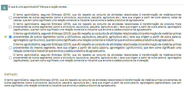 <p>3. que é uma agroindustria? Marque a opção termo segundo Embrapa que diz respeito conjunto de atividades relacionadas à transformação de matérias-primas provenientes de outros segmentos (como a agricultura etc.). teve sua origem a partir de outra bolsa de valores. que tem como significado uma relação comercial e industrial que envolve a cadeia produtiva da termo segundo Embrapa que diz respeito conjunto de atividades relacionadas à transformação de produtos finais provenientes de outros segmentos (como a agricultura etc.). teve sua origem a partir de outra (agribusiness). que tem como significado uma relação comercial e industrial que envolve a cadeia produtiva da termo segundo Embrapa (2019). que diz respeito ao conjunto de atividades relacionadas à transformação de matérias-primas provenientes de outros segmentos (como a silvicultura, aquicultura, agricultura teve sua origem a partir de outra palavra, agronegócio que tem como significado uma relação comercial e industrial que envolve a cadeia produtiva da agropecuária. termo segundo Embrapa que diz respeito ao conjunto de atividades relacionadas à transformação de matérias-primas provenientes do mesmo teve sua origem a partir de outra palavra, agronegócio que tem como significado uma relação comercial e industrial que envolve a cadeia produtiva da agropecuária. termo segundo Embrapa que diz respeito conjunto de atividades relacionadas à transformação de matérias-primas provenientes de outros segmentos (como a agricultura etc.). teve sua origem a partir de outra palavra, (agribusiness) que tem como significado uma relação comercial e industrial que envolve a cadeia produtiva da mineração. Explicação: termo segundo Embrapa que diz respeito ao conjunto de atividades relacionadas à transformação de matérias-primas provenientes de outros segmentos (como a agricultura teve sua origem a partir de outra agronegócio que tem como significado uma relação comercial e industrial que envolve a cadeia produtiva da</p>
