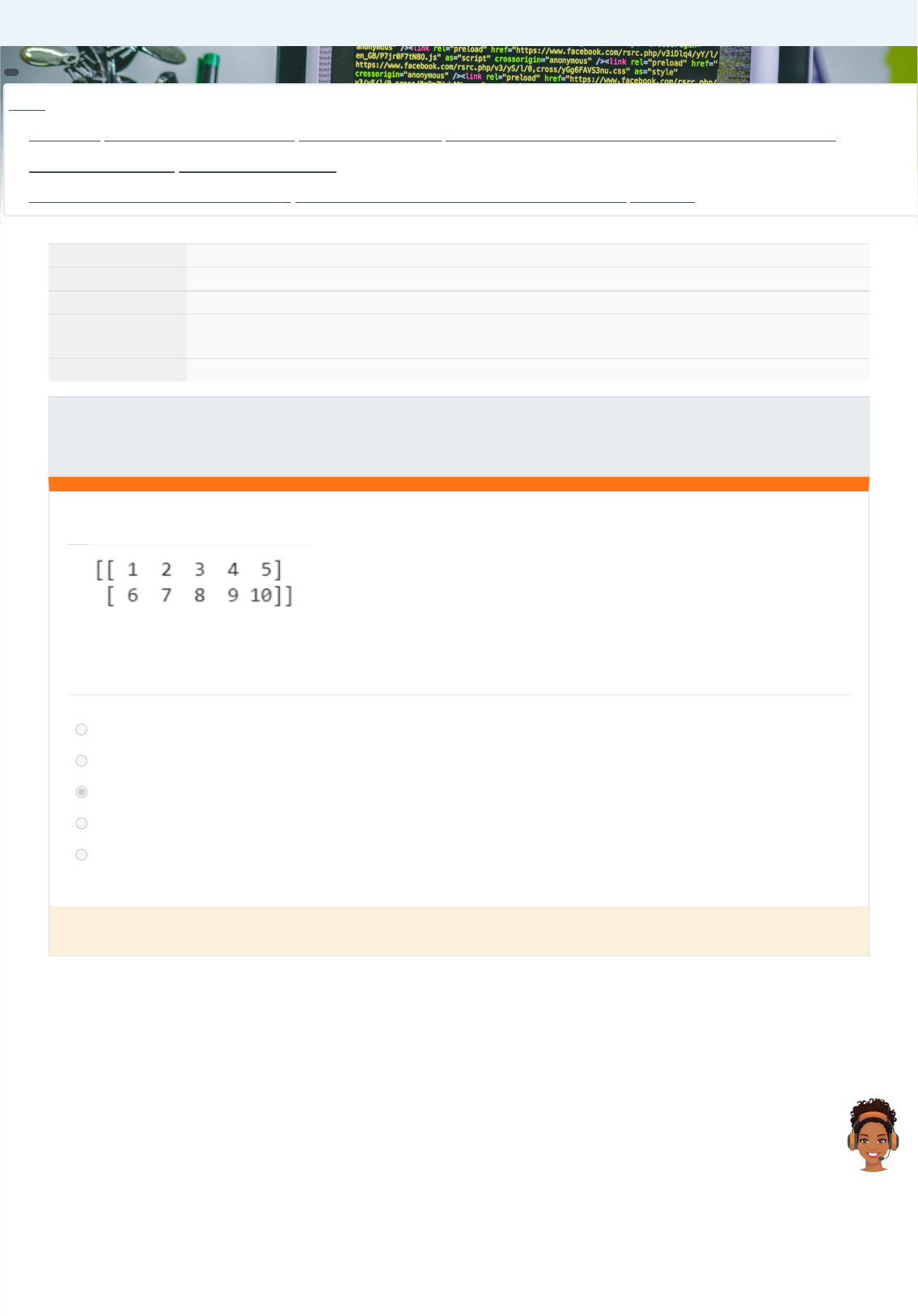 <p>Iniciado em terça, 1 out 2024, 00:12</p><p>Estado Finalizada</p><p>Concluída em terça, 1 out 2024, 00:17</p><p>Tempo</p><p>empregado</p><p>5 minutos 14 segundos</p><p>Avaliar 1,80 de um máximo de 2,00(90%)</p><p>Questão 1</p><p>Completo</p><p>Atingiu 0,20 de 0,20</p><p>Para que seja exibido a matriz abaixo:</p><p>Qual a biblioteca e atributo devem ser utilizados:</p><p>a. Pandas e shape.</p><p>b. Numpy e tensor.</p><p>c. Numpy e shape.</p><p>d. Pandas e Numpy.</p><p>e. Pandas e tensor.</p><p>Sua resposta está correta.</p><p>Painel / Minhas Disciplinas</p><p>/ 2ºGRADUAÇÃO EM CIÊNCIA DA COMPUTAÇÃO-disc. 13- INTRODUÇÃO A CIÊNCIA DE DADOS/ALGORITIMOS E LÓGICA DE PROGRA</p><p>/ DISCIPLINA - INTRODUÇÃO À CIÊNCIA DE DADOS</p><p>/ AB30 - ATIVIDADE DE ESTUDO - INTRODUÇÃO À CIÊNCIA DE DADOS - ATÉ 27/10/2024 - VALOR 2,0 PONTOS</p><p>https://www.eadunifatecie.com.br/course/view.php?id=48893</p><p>https://www.eadunifatecie.com.br/course/view.php?id=48893</p><p>https://www.eadunifatecie.com.br/my/</p><p>https://www.eadunifatecie.com.br/course/view.php?id=48893</p><p>https://www.eadunifatecie.com.br/course/view.php?id=48893#section-1</p><p>https://www.eadunifatecie.com.br/mod/quiz/view.php?id=1578729</p><p>Questão 2</p><p>Completo</p><p>Atingiu 0,20 de 0,20</p><p>Questão 3</p><p>Completo</p><p>Atingiu 0,20 de 0,20</p><p>Sabemos que o termo biblioteca em programação, é utilizado para representar uma coleção de subprogramas que auxiliam no</p><p>desenvolvimento de softwares. Sobre a biblioteca NumPy a questão correta é:</p><p>a. É usado para a criação de redes neurais artificiais.</p><p>b. É utilizada principalmente para realizar cálculos em Arrays, sejam eles comuns ou multidimensionais.</p><p>c. Possui Dataframes.</p><p>d. Explora a manipulação, leitura e visualização de dados.</p><p>e. Esse método encontra padrões e os dados são agrupados de acordo com as relações encontradas entre as variáveis.</p><p>Sua resposta está correta.</p><p>Marque a alternativa que apresenta uma vantagem de se utilizar a Linguagem Python</p><p>a. Multiplataforma.</p><p>b. Todas as alternativas estão corretas.</p><p>c. Python é usado para “Scripting and Automation”.</p><p>d. Python é usado no desenvolvimento da Web.</p><p>e. Python é usado para criar interfaces gráficas de usuário (GUI).</p><p>Sua resposta está correta.</p><p>Questão 4</p><p>Completo</p><p>Atingiu 0,20 de 0,20</p><p>Questão 5</p><p>Completo</p><p>Atingiu 0,20 de 0,20</p><p>Vários métodos estatísticos são utilizados para o Machine Learning alcançar o desempenho esperado. Sobre o método</p><p>clustering é correto afirmar:</p><p>a. É útil quando o custo associado à rotulação é muito baixo para possibilitar um processo de treinamento totalmente</p><p>rotulado.</p><p>b. É feito um mapeamento das apenas de variáveis de saída.</p><p>c. É útil quando o custo associado à rotulação é muito alto para possibilitar um processo de treinamento totalmente</p><p>rotulado.</p><p>d. Todas as alternativas estão corretas.</p><p>e. Esse método encontra padrões e os dados são agrupados de acordo com as relações encontradas entre as variáveis.</p><p>Sua resposta está correta.</p><p>Análise de dados é um processo que a partir de dados brutos é realizada a inspeção, limpeza, transformação e modelagem de</p><p>dados. As etapas de processamento desses dados são as seguintes:</p><p>I - Observação, questionamento, hipóteses;</p><p>II - Experimentação, análise dos resultados e conclusão;</p><p>III - Observação, carregamento dos dados, análise dos resultados;</p><p>IV - Experimentação e análise e limpeza dos dados.</p><p>a. Alternativas III e IV estão corretas.</p><p>b. Somente a alternativa IV está correta.</p><p>c. Alternativas I e II estão corretas.</p><p>d. Somente a alternativa I está correta.</p><p>e. Alternativas I e III estão corretas.</p><p>Sua resposta está correta.</p><p>Questão 6</p><p>Completo</p><p>Atingiu 0,00 de 0,20</p><p>Questão 7</p><p>Completo</p><p>Atingiu 0,20 de 0,20</p><p>Regressão linear é uma das técnicas utilizadas para o planejamento do modelo analítico de dados. Podemos afirmar que:</p><p>( ) É utilizada para entender e comparar dados, possibilitando a identificação do comportamento do dado analisado</p><p>( ) É uma técnica estatística que pode ser utilizada para efetuar uma análise preditiva.</p><p>( ) A modelagem gráfica da regressão linear consiste de folhas, também chamadas de nós, e ramos.</p><p>( ) Realiza projeções e estudos dos dados, classificando matematicamente quais são os mais relevantes para o estudo</p><p>a. V; V; F; F.</p><p>b. V; F; F; F.</p><p>c. V; V; V; V.</p><p>d. V; V; F; V.</p><p>e. V; F; F; V.</p><p>Sua resposta está incorreta.</p><p>Sobre o aprendizado não-supervisionado é correto afirmar:</p><p>I - O objetivo é de identificar os padrões existentes nos dados sob análise, suas similaridades (conforme critério estabelecido),</p><p>suas diferenças e efetuar um agrupamento consistente das informações analisadas.</p><p>II- No aprendizado não-supervisionado, o algoritmo não recebe os rótulos de entrada e, portanto, não conhece os rótulos de</p><p>saída que devem ser gerados</p><p>III - Têm o objetivo de fazer previsões baseados no conjunto de dados que estão sendo analisados, sejam eles dados históricos</p><p>ou não, eles são treinados por meio de exemplos rotulados, como uma entrada na qual a saída desejada é conhecida.</p><p>IV - Os resultados desse tipo de algoritmo são geralmente marcados como classificação e regressão.</p><p>a. Apenas as alternativas I e III estão corretas.</p><p>b. Apenas as alternativas I e II estão corretas.</p><p>c. Apenas as alternativas II e III estão corretas.</p><p>d. Apenas a alternativa I está correta.</p><p>e. Apenas a alternativa IV está correta.</p><p>Sua resposta está correta.</p><p>Questão 8</p><p>Completo</p><p>Atingiu 0,20 de 0,20
