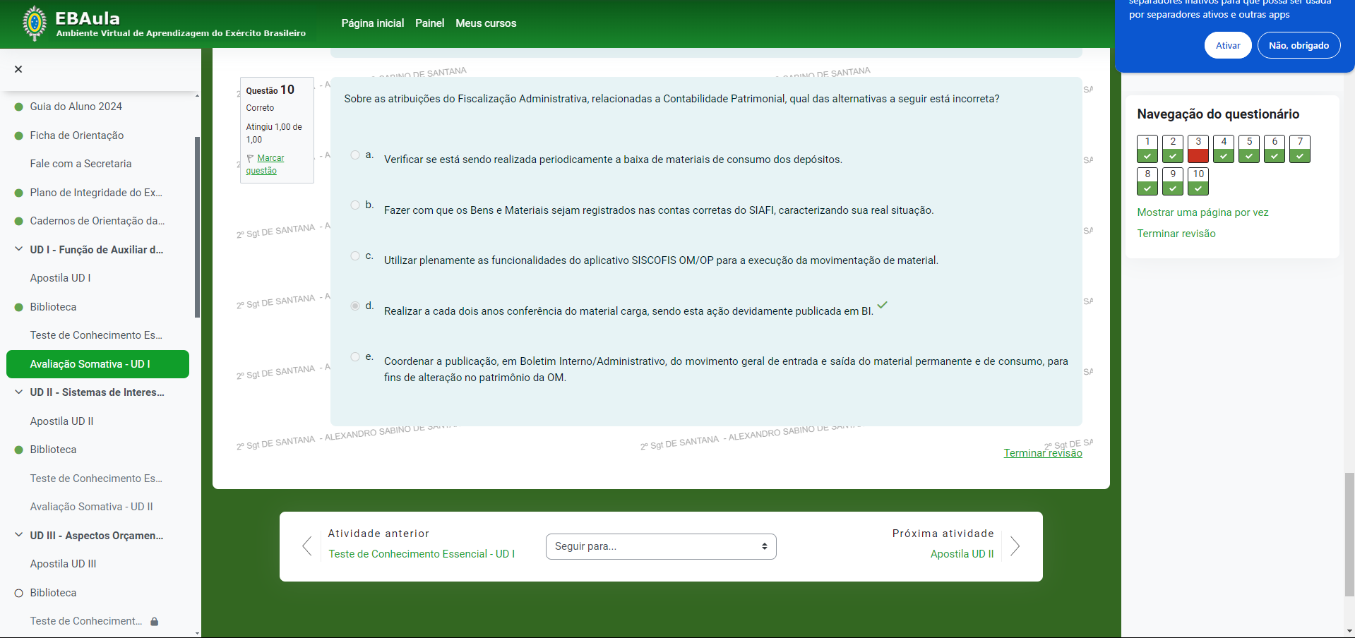 <p>EBAula por separadores ativos e outras Página inicial Painel Meus cursos Ambiente Virtual de Aprendizagem do Exército Brasileiro Ativar DE SANTANA DE SANTANA 2 Questão 10 A SA Guia do Aluno 2024 Sobre as atribuições do Fiscalização Administrativa, relacionadas a Contabilidade Patrimonial, qual das alternativas a seguir está incorreta? Correto Navegação do questio Atingiu 1,00 de Ficha de Orientação 1,00 1 2 3 4 5 P Marcar A a. Fale com a Secretaria 2 Verificar se está sendo realizada periodicamente a baixa de materiais de consumo dos depósitos. SA questão 8 9 10 Plano de Integridade do Ex... b. Fazer com que os Bens e Materiais sejam registrados nas contas corretas do SIAFI, caracterizando sua real situação. Mostrar uma página por vez Cadernos de Orientação 2° Sgt DE SANTANA A SA Terminar revisão UD Função de Auxiliar d... Utilizar plenamente as funcionalidades do aplicativo SISCOFIS OM/OP para a execução da movimentação de material. Apostila UD Biblioteca DE SANTANA A d. SA Realizar a cada dois anos conferência do material carga, sendo esta ação devidamente publicada em Teste de Conhecimento e. Avaliação Somativa - UD I Coordenar a publicação, em Boletim do movimento geral de entrada e saída do material permanente e de consumo, para Sgt DE SANTANA A SA fins de alteração no patrimônio da OM. UD II Sistemas de Interes.. Apostila UD Sgt DE SANTANA ALEXANDRO SABINO 2° Sgt DE SANTANA ALEXANDRO SABINO Biblioteca DE SA Terminar revisão Teste de Conhecimento Avaliação Somativa UD UD III - Aspectos Orçamen.. Atividade anterior Próxima atividade Seguir para... Teste de Conhecimento Essencial UD Apostila UD Apostila UD III Biblioteca Teste de Conheciment.</p>