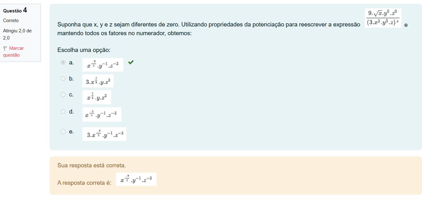 <p>Questão 4 Correto Suponha que X, y e Z sejam diferentes de zero. Utilizando propriedades da potenciação para reescrever a expressão e Atingiu 2,0 de mantendo todos os fatores no numerador, obtemos: 2,0 Marcar Escolha uma opção: questão a. b. C. d. e. Sua resposta está correta. A resposta correta é:</p>
