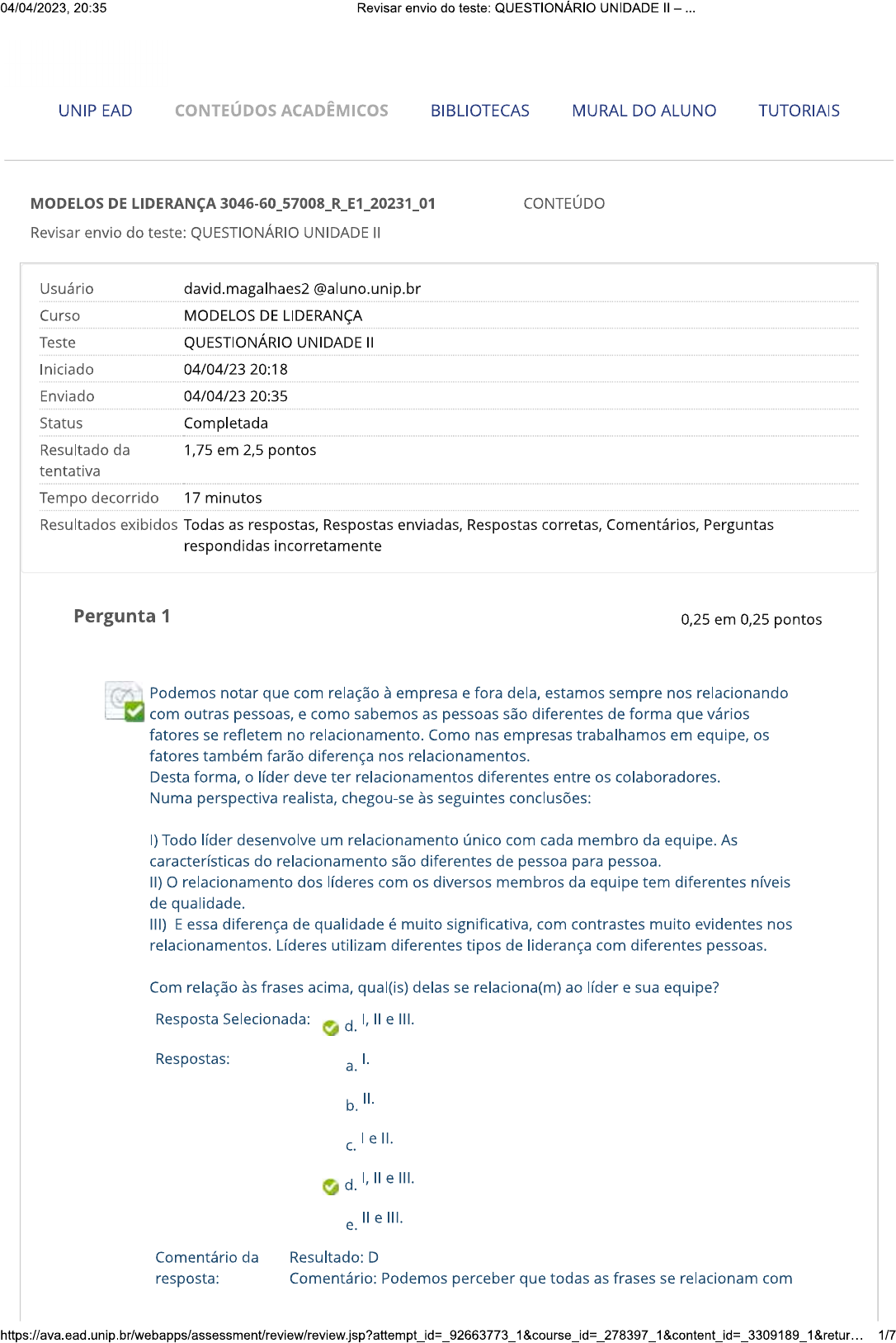 <p>04/04/2023, 20:35 Revisar envio do teste: QUESTIONÁRIO UNIDADE UNIP EAD CONTEÚDOS ACADÊMICOS BIBLIOTECAS MURAL DO ALUNO TUTORIAIS MODELOS DE LIDERANÇA 3046-60_57008_R_E1_20231_01 CONTEÚDO Revisar envio do teste: QUESTIONÁRIO UNIDADE Usuário Curso MODELOS DE LIDERANÇA Teste QUESTIONÁRIO UNIDADE Iniciado 04/04/23 20:18 Enviado 04/04/23 20:35 Status Completada Resultado da 1,75 em 2,5 pontos tentativa Tempo decorrido 17 minutos Resultados exibidos Todas as respostas, Respostas enviadas, Respostas corretas, Comentários, Perguntas respondidas incorretamente Pergunta 1 0,25 em 0,25 pontos Podemos notar que com relação à empresa e fora dela, estamos sempre nos relacionando com outras pessoas, e como sabemos as pessoas são diferentes de forma que vários fatores se refletem no relacionamento. Como nas empresas trabalhamos em equipe, os fatores também farão diferença nos relacionamentos. Desta forma, o líder deve ter relacionamentos diferentes entre os colaboradores. Numa perspectiva realista, chegou-se às seguintes conclusões: Todo líder desenvolve um relacionamento único com cada membro da equipe. As características do relacionamento são diferentes de pessoa para pessoa. II) O relacionamento dos líderes com os diversos membros da equipe tem diferentes níveis de qualidade. III) E essa diferença de qualidade é muito significativa, com contrastes muito evidentes nos relacionamentos. Líderes utilizam diferentes tipos de liderança com diferentes pessoas. Com relação às frases acima, qual(is) delas se relaciona(m) ao líder e sua equipe? Resposta Selecionada: d. I, e III. Respostas: a. d. I, e III. e. Comentário da Resultado: D resposta: Comentário: Podemos perceber que todas as frases se relacionam com 1/7</p><p>04/04/2023, 20:35 Revisar envio do teste: QUESTIONÁRIO UNIDADE o líder e sua equipe, existem vários tipos de relacionamentos entre o líder e a equipe. Pergunta 2 0,25 em 0,25 pontos Sabemos que a relação líder e equipe deve ser de confiança, em que se procuram sempre relações positivas. Desta forma, lembrando nosso estudo, sabemos que existem três tipos de confiança: por intimidação, por conhecimento e por identificação. Vejamos algumas frases com relação à confiança: I) Neste tipo de relação de confiança, o liderado faz o que lhe é imposto devido ao medo das consequências de não realizar o que foi solicitado. II) Este tipo de relação de confiança prevê atitudes e comportamentos baseados naquilo que conhecemos da outra pessoa. III) Este tipo de relação de confiança envolve o emocional das pessoas e ocorre quando existe uma conexão forte e uma afinidade de interesses grande. Analisando estas frases, qual(is) delas se refere(m) à relação por conhecimento? Resposta Selecionada: b. II. Respostas: C. lell. d. I, e III. e. e III. Comentário Resposta: B da resposta: Comentário: fato de conhecer a pessoa e poder prever o que ela fará em determinada situação substitui penalidades e punições. Quanto mais se conhece maior é a previsibilidade de suas ações e maior é o grau de confiança estabelecido no relacionamento, desta forma podemos identificar que a resposta B é a correta. Pergunta 3 0 em 0,25 pontos Sabemos que o papel do líder é criar oportunidades de forma que a equipe use seus talentos, incentivando cada membro da equipe a crescer na empresa e pessoalmente. Nas crises sabemos que a comunicação é alterada, o que dificulta o desempenho da equipe, temos que lembrar que a empresa não são máquinas, mas pessoas. Oliveira e Marino (2005) nos mostram três tipos de variáveis que interferem no desempenho: Variáveis causais, intervenientes e de produção. Vejamos algumas frases sobre o assunto.</p><p>04/04/2023, 20:35 Revisar envio do teste: QUESTIONÁRIO UNIDADE I. Liderança II. Condição do ambiente interno III. Realização da organização Qual(is) das opções acima se refere(m) a Variáveis Causais? Resposta Selecionada: x d. I, e III. Respostas: d. I, e III. e. II e III. Pergunta 4 0 em 0,25 pontos Os conflitos fazem parte do dia a dia, eles sempre afetam as pessoas, algumas vezes positiva e na maioria das vezes negativamente. Podemos notar que invariavelmente o conflito está presente e podemos aproveitar este conflito para refletir e chegar ao aprendizado. Os conflitos no trabalho são constantes e desta forma o líder deve aproveitar esta oportunidade para o desenvolvimento de todos. Qual(is) das frases abaixo se relaciona(m) às funções do líder quando existe uma crise? I) Pode proporcionar uma oportunidade para o desenvolvimento geral da equipe. II) A crise pode ser muito negativa, se não for bem administrada pelo líder. III) A função do líder é importante para as soluções necessárias. Resposta Selecionada: x a. Respostas: a. C. lell. d. I, e III. e. e III. Pergunta 5 0,25 em 0,25 pontos Quando falamos de mediação de conflitos, podemos pensar que se dá porque as pessoas têm entendimentos diferentes em relação ao mesmo assunto, sendo assim cada pessoa da equipe pode, mesmo sem querer, aumentar o conflito. 1&retur.. 3/7</p><p>04/04/2023, 20:35 Revisar envio do teste: QUESTIONÁRIO UNIDADE Dentro das funções do líder sobre a mediação do conflito, podemos dizer: I) Descobrir quais são os pontos em comum com relação ao conflito. II) quais são os pontos de vista que estão na origem do conflito. III) Dar ordens que devam ser cumpridas. Qual(is) das frases acima se refere(m) à mediação do líder em relação aos conflitos? Resposta Selecionada: C. II. Respostas: C. d. I, e III. e III. e. Comentário da Resultado: C resposta: Comentário: Podemos notar que estamos falando em mediação, isso quer dizer que o líder deve procurar pontos em comum para solucionar o conflito, por este motivo as frases e estão corretas. A frase III corresponde a uma imposição, desta forma a resposta C está correta. Pergunta 6 0,25 em 0,25 pontos Conflito interno é um sentimento que a pess