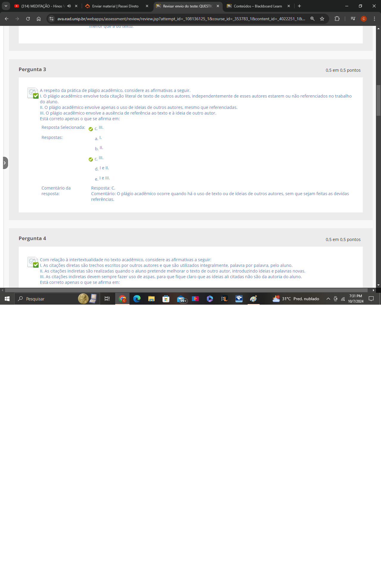 <p>(314) MEDITAÇÃO Hinos Enviar material Passei Direta x Revisar envio do QUESTI Conteúdos Blackboard x + C que Pergunta 3 0,5 em 0,5 pontos A respeito da prática de plágio considere as afirmativas a seguir. I. plágio acadêmico envolve toda citação literal de texto de outros independentemente de esses autores estarem ou não referenciados no trabalho do aluno. II. plágio acadêmico envolve apenas o uso de ideias de outros autores. mesmo que referenciadas III. plágio acadêmico envolve a ausência de referência ao texto e à ideia de outro autor. Está correto apenas o que se afirma em: Resposta Selecionada: III. Respostas: I. b. II. d. II. III. Comentário da Resposta: resposta: Comentário: plágio acadêmico ocorre quando há o uso de texto ou de ideias de outros autores. sem que sejam feitas as devidas Pergunta 4 0,5 em pontos Com relação à intertextualidade no texto considere as afirmativas a seguir: As citações diretas são trechos escritos por outros autores e que são utilizados integralmente, palavra por palavra, pelo aluno. II. As citações indiretas são realizadas quando aluno pretende melhorar texto de outro introduzindo ideias e palavras III. As citações indiretas devem sempre fazer uso de aspas, para que claro que as ideias ali citadas não são da autoria do aluno. Está correto apenas o que se afirma em: 7:31 PM Pesquisar RL 31°C Pred. nublado 10/7/2024</p>
