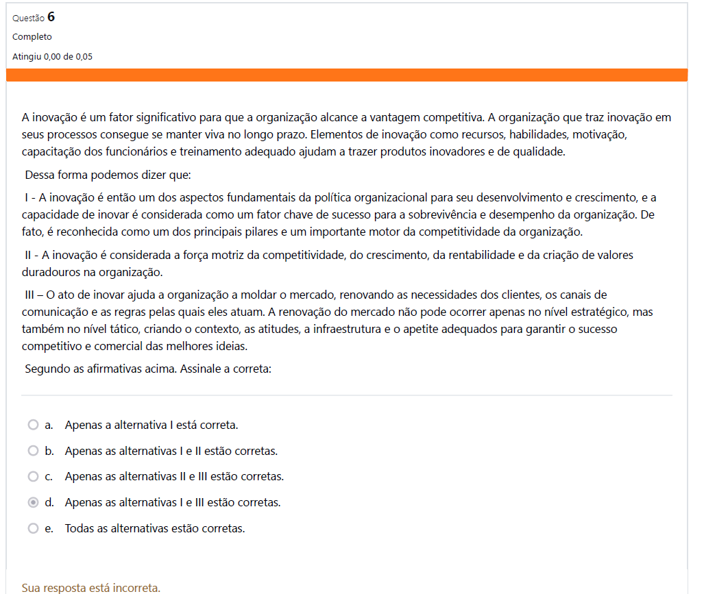 <p>Questão 6 Completo Atingiu 0,00 de 0,05 A inovação é um fator significativo para que a organização alcance a vantagem competitiva. A organização que traz inovação em seus processos consegue se manter viva no longo prazo. Elementos de inovação como recursos, habilidades, motivação, capacitação dos funcionários e treinamento adequado ajudam a trazer produtos inovadores e de qualidade. Dessa forma podemos dizer que: - A inovação é então um dos aspectos fundamentais da política organizacional para seu desenvolvimento e crescimento, e a capacidade de inovar é considerada como um fator chave de sucesso para a sobrevivência e desempenho da organização. De fato, é reconhecida como um dos principais pilares e um importante motor da competitividade da organização. - A inovação é considerada a força motriz da competitividade, do crescimento, da rentabilidade e da criação de valores duradouros na organização. III - ato de inovar ajuda a organização a moldan mercado, renovando as necessidades dos clientes, os canais de comunicação e as regras pelas quais eles atuam. A renovação do mercado não pode ocorrer apenas no nível estratégico, mas também no nível tático, criando o contexto, as atitudes, a infraestrutura e apetite adequados para garantir sucesso competitivo e comercial das melhores ideias. Segundo as afirmativas acima. Assinale a correta: a. Apenas a alternativa está correta. b. Apenas as alternativas I e II estão corretas. C. Apenas as alternativas II e III estão corretas. d. Apenas as alternativas e III estão corretas. e. Todas as alternativas estão corretas. Sua resposta está incorreta.</p>