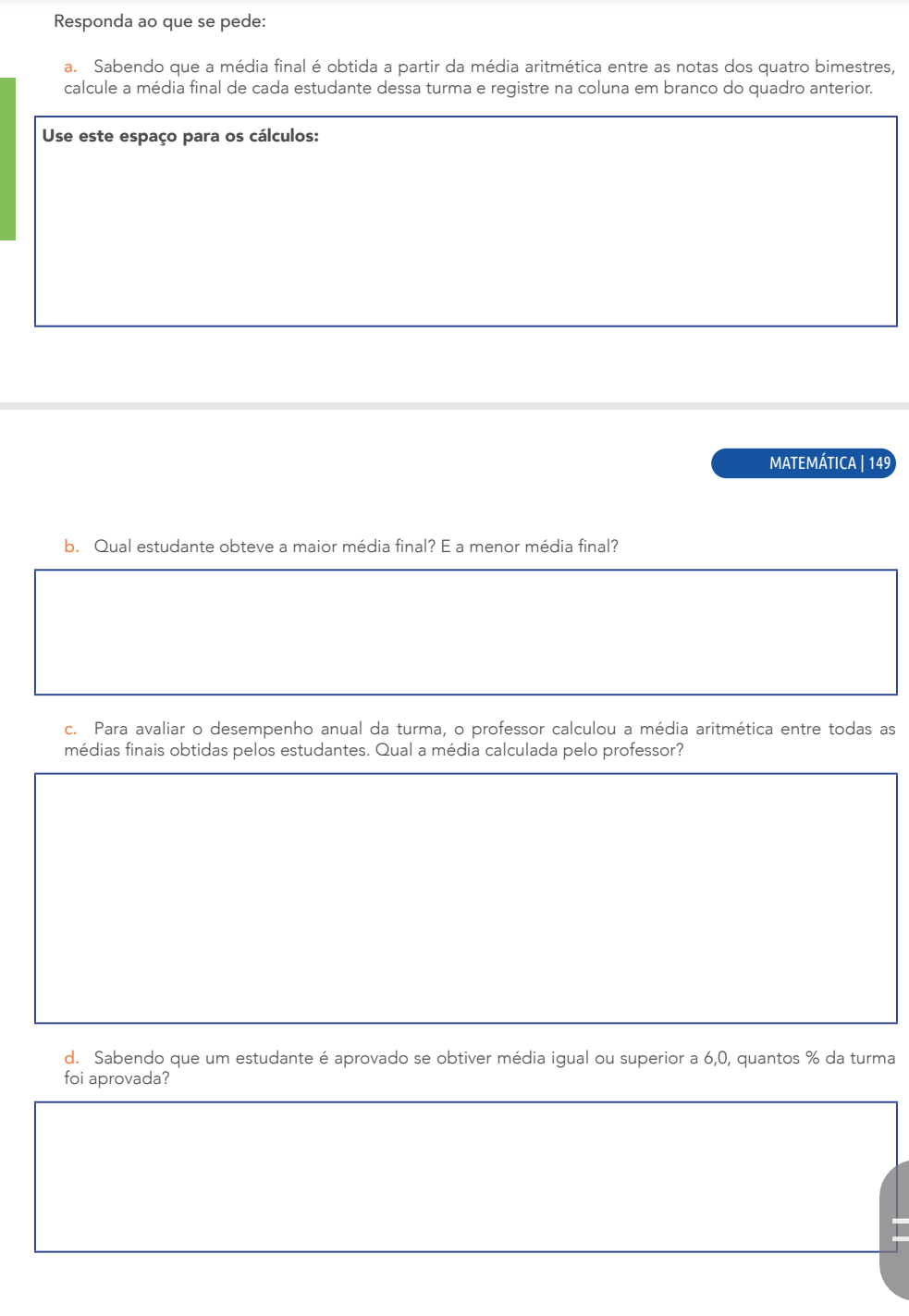 <p>Responda ao que se pede: a. Sabendo que a média final é obtida a partir da média aritmética entre as notas dos quatro bimestres, calcule a média final de cada estudante dessa turma e registre na coluna em branco do quadro anterior. Use este espaço para os cálculos: MATEMÁTICA 149 b. Qual estudante obteve a maior média final? E a menor média final? C. Para avaliar desempenho anual da turma, professor calculou a média aritmética entre todas as médias finais obtidas pelos estudantes. Qual a média calculada pelo professor? d. Sabendo que um estudante é aprovado se obtiver média igual ou superior a 6,0, quantos % da turma foi aprovada?</p>