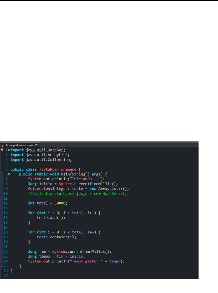 <p>Pág. 2 de 6.</p><p>AB3 - Atividade prática de aprendizagem</p><p>Curso: Tecnologia em Análise e Desenvolvimento de Sistemas</p><p>Disciplina: Programação Orientada a Objetos – Instituição: Unifatecie</p><p>Aluno: David Tobias Nunes</p><p>Enunciado:</p><p>Em um ambiente de desenvolvimento, o Gerente de Projetos chega para o líder do setor de desenvolvimento e entrega a ele uma solicitação: Desenvolver um código na linguagem de programação Orientada a Objetos Java, com uma classe TestaPerformance para a inserção de 30 mil números em um ArrayList.</p><p>Deverá usar um método System para cronometrar o tempo gasto.</p><p>Deverá usar os seguintes Arrays em sua implementação que deverão ser testadas separadamente:</p><p>Collection teste = new ArrayList();</p><p>Collection teste = new HashSet();</p><p>Depois que foi desenvolvido o programa, o gerente de projetos solicitou ao analista de teste, que testasse o código do programa que o desenvolvedor havia criado para um teste de performance. Entregou também ao analista uma tabela em branco contendo os seguintes campos: "Métodos", "Descrição" e "Melhor Performance", para que o analista preenchesse com todos os métodos relacionados ao código da classe TestaPerformance e também com a descrição do que cada método realiza dentro do programa e identificar qual dos arrays apresentará a melhor performance.</p><p>Com base no que foi estudado em Programação Orientada a Objetos, você será o desenvolvedor que fará a implementação do código, os testes do conteúdo apresentado (código do programa da classe TestaPerformance e a tabela para o preenchimento).</p><p>Replique o código apresentado na figura anterior em uma IDE de desenvolvimento como o Eclipse, Brackets, Visual Studio, etc. Faça pesquisas alterando os valores de 30 mil para 50 mil, 100 mil, 150 mil e 200 mil e verifique o tempo gasto por cada um dos arrays exigidos para a implementação separadamente, identificando assim qual deles apresentará a melhor performance.</p><p>Responda na tabela qual método dos arrays implementados no código, apresenta a melhor performance e identifique também qual é a funcionalidade de cada método (ArrayList() e HashSet()) contidos na tabela abaixo:</p><p>Método</p><p>Descrição</p><p>Melhor Performance</p><p>ArrayList()</p><p>HashSet()</p><p>Novo código com as implementações</p><p>import java.util.HashSet;</p><p>import java.util.ArrayList;</p><p>import java.util.Collection;</p><p>public class TestaPerformance {</p><p>public static void main(String[] args) {</p><p>//teste de performance com 30K até 200K em microsegundo (ms)</p><p>testarPerformance(30000);</p><p>testarPerformance(50000);</p><p>testarPerformance(100000);</p><p>testarPerformance(150000);</p><p>testarPerformance(200000);</p><p>}</p><p>private static void testarPerformance(int total) {</p><p>// Teste com vetor ArrayList</p><p>Collection arrayList = new ArrayList();</p><p>long tempoArrayList = testarInsercaoEContem(arrayList, total);</p><p>System.out.println("Tempo gasto no ArrayList com " + total + " elementos: " + tempoArrayList + " ms");</p><p>// Teste com HashSet</p><p>Collection hashSet = new HashSet();</p><p>long tempoHashSet = testarInsercaoEContem(hashSet, total);</p><p>System.out.println("Tempo gasto no HashSet com " + total + " elementos: " + tempoHashSet + " ms");</p><p>System.out.println();</p><p>}</p><p>private static long testarInsercaoEContem(Collection teste, int total) {</p><p>long inicio = System.currentTimeMillis();</p><p>for (int i = 0; i ()” como a melhor opção de implementação para a classe que foi criada “TestaPerformance”, pois nesse sentido, ele prova na prática o melhor desempenho extremamente superior em relação ao método ArrayList().</p><p>image3.emf</p><p>MétodoDescriçãoMelhor Performance (ms)</p><p>ArrayList()200.000</p><p>17732</p><p>ArrayList()150.000</p><p>9292</p><p>ArrayList()100.000</p><p>4670</p><p>ArrayList()50.000</p><p>879</p><p>ArrayList()30.000</p><p>315</p><p>HashSet()100.00012</p><p>HashSet()200.0008</p><p>HashSet()50.0005</p><p>HashSet()30.0003</p><p>HashSet()150.0003</p><p>image4.emf</p><p>MétodoDescriçãoMelhor Performance (ms)</p><p>HashSet()30.0003</p><p>HashSet()150.0003</p><p>HashSet()50.0005</p><p>HashSet()200.0008</p><p>HashSet()100.00012</p><p>ArrayList()30.000</p><p>315</p><p>ArrayList()50.000</p><p>879</p><p>ArrayList()100.000</p><p>4670</p><p>ArrayList()150.000</p><p>9292</p><p>ArrayList()200.000</p><p>17732</p><p>image5.emf</p><p>MétodoDescriçãoMelhor Performance (ms)</p><p>ArrayList()30.000</p><p>315</p><p>HashSet()30.0003</p><p>ArrayList()50.000</p><p>879</p><p>HashSet()50.0005</p><p>ArrayList()100.000</p><p>4670</p><p>HashSet()100.00012</p><p>ArrayList()150.000</p><p>9292</p><p>HashSet()150.0003</p><p>ArrayList()200.000</p><p>17732</p><p>HashSet()200.0008</p><p>image1.png</p><p>image2.png</p><p>Pág.</p><p>1</p><p>de</p><p>6</p><p>.</p><p>A</p><p>B</p><p>3</p><p>-</p><p>Atividade prática de aprendizagem</p><p>Curso:</p><p>Tecnologia em Análise e Desenvolvimento de Sistemas</p><p>Disciplina:</p><p>Programação Orientada a Objetos</p><p>–</p><p>Instituição:</p><p>Unifatecie</p><p>Aluno:</p><p>David Tobias Nunes</p><p>Enunciado:</p><p>Em um ambiente de</p><p>desenvolvimento, o Gerente de Projetos chega para o líder do setor de</p><p>desenvolvimento e entrega a ele uma solicitação: Desenvolver um código na linguagem de</p><p>programação Orientada a Objetos</p><p>Java</p><p>, com uma classe</p><p>TestaPerformance</p><p>para a inserção de 30 mil</p><p>números em um</p><p>ArrayList</p><p>.</p><p>Deverá usar um método</p><p>System</p><p>para cronometrar o tempo gasto.</p><p>Deverá usar os seguintes</p><p>Arrays</p><p>em sua implementação que deverão ser testadas separadamente:</p><p>Collection</p><p>teste</p><p>=</p><p>new</p><p>ArrayList</p><p>();</p><p>Collection teste = ne</p><p>w HashSet</p><p>();</p><p>Depois que foi desenvolvido o programa, o gerent