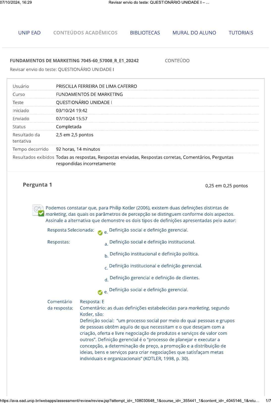 <p>07/10/2024, 16:29 Revisar envio do teste: QUESTIONÁRIO UNIDADE UNIP EAD CONTEÚDOS ACADÊMICOS BIBLIOTECAS MURAL DO ALUNO TUTORIAIS FUNDAMENTOS DE MARKETING 7045-60_57008_R_E1_20242 CONTEÚDO Revisar envio do teste: QUESTIONÁRIO UNIDADE Usuário PRISCILLA FERREIRA DE LIMA CAFERRO Curso FUNDAMENTOS DE MARKETING Teste QUESTIONÁRIO UNIDADE Iniciado 03/10/24 19:42 Enviado 07/10/24 15:57 Status Completada Resultado da 2,5 em 2,5 pontos tentativa Tempo decorrido 92 horas, 14 minutos Resultados exibidos Todas as respostas, Respostas enviadas, Respostas corretas, Comentários, Perguntas respondidas incorretamente Pergunta 1 0,25 em 0,25 pontos Podemos constatar que, para Philip Kotler (2006), existem duas definições distintas de marketing, das quais os parâmetros de percepção se distinguem conforme dois aspectos. Assinale a alternativa que demonstre os dois tipos de definições apresentadas pelo autor: Resposta Selecionada: Definição social e definição gerencial. e. Respostas: Definição social e definição institucional. a. b. Definição institucional e definição política. Definição institucional e definição gerencial. C. d. Definição gerencial e definição de clientes. Definição social e definição gerencial. e. Comentário Resposta: E da resposta: Comentário: as duas definições estabelecidas para marketing, segundo Kotler, são: Definição social: "um processo social por meio do qual pessoas e grupos de pessoas obtêm aquilo de que necessitam e o que desejam com a criação, oferta e livre negociação de produtos e serviços de valor com outros". Definição gerencial é o "processo de planejar e executar a concepção, a determinação de preço, a promoção e a distribuição de ideias, bens e serviços para criar negociações que satisfaçam metas individuais e organizacionais" (KOTLER, 1998, p. 30). 1/7</p><p>07/10/2024, 16:29 Revisar envio do teste: QUESTIONÁRIO UNIDADE Pergunta 2 0,25 em 0,25 pontos Para Philip Kotler, existem duas definições de marketing que estruturam todo o saber da disciplina. Quando estamos nos referindo à definição social, estamos falando de: I. Proporcionar à sociedade uma qualidade de vida superior. II. Proporcionar às organizações uma lucratividade maior para que possam distribuir os rendimentos com os colaboradores. III. Atender as necessidades e os desejos de pessoas e grupos de pessoas, por meio da criação de ofertas de produtos e serviços que tenham valor para esses grupos. Resposta Selecionada: e III estão corretas. e. Respostas: está correta. a. b. II está correta. C. III está correta. e II estão corretas. d. e III estão corretas. e. Comentário da Resposta: E resposta: Comentário: falar em marketing pela perspectiva social é falar em atender necessidades e desejos das pessoas por meio de produtos e serviços, visando a proporcionar uma melhor qualidade de vida. Pergunta 3 0,25 em 0,25 pontos Existem diversos equívocos em relação à palavra marketing. Sabemos que a tradução literal é mercadologia, o que, por definição, podemos dizer que significa: Resposta Selecionada: Estudo de mercado. e. Respostas: a. Mercado. b. Pessoas. Vendas. C. d. Produtos e serviços. Estudo de mercado. e. Comentário da Resposta: E resposta: Comentário: não podemos esquecer que a tradução literal de marketing deveria ser mercadologia, ou seja, mercado + logia = estudo; sendo, portanto, estudo de mercado. 2/7</p><p>07/10/2024, 16:29 Revisar envio do teste: QUESTIONÁRIO UNIDADE Pergunta 4 0,25 em 0,25 pontos Para o alcance dos objetivos organizacionais, as empresas precisam compreender que são afetadas direta ou indiretamente pelos ambientes das quais fazem parte. Segundo Philip Kotler, esses ambientes podem ser divididos, de forma mais ampla, em: I. Ambiente publicitário. II. Ambiente externo ou macroambiente. III Ambiente tecnológico. IV. Ambiente interno ou microambiente. Resposta Selecionada: e IV estão corretas. e. Respostas: e estão corretas. a. b. II e III estão corretas. C. III e IV estão corretas. d. III estão corretas. e IV estão corretas. e. Comentário Resposta: E da resposta: Comentário: os ambientes pelos quais as empresas fazem parte são: macroambiente ou ambiente externo, composto por todas as forças incontroláveis que podem afetar direta ou indiretamente as organizações e o ambiente microambiente ou ambiente externo, composto pelas forças controláveis pelas organizações, como funcionários, fornecedores e clientes. Pergunta 5 0,25 em 0,25 pontos Quando estamos falando do macroambiente, existem forças diversas que estruturam esse ambiente externo à empresa e sobre o qual ela não tem poder. Ao estudarmos a força da moeda vigente, estamos falando de qual força? 3/7</p><p>07/10/2024, 16:29 Revisar envio do teste: QUESTIONÁRIO UNIDADE Resposta Selecionada: C. Econômica. Respostas: Demográfica. a. b. Político-legal. C. Econômica. d. Cultural. Natural. e. Comentário da Resposta: C resposta: Comentário: a força econômica diz respeito às estruturas determinadas pelo governo de cada país para estabelecer uma moeda forte na economia. Pergunta 6 0,25 em 0,25 pontos As forças culturais e sociais têm grande influência nos hábitos e nas preferências das pessoas. Sendo assim, é correto afirmarmos que: I. É por meio das forças socioculturais que a decisão de compra das pessoas será direcionada para determinado produto e/ou serviço em detrimento de outro. II. É por meio das forças socioculturais que o profissional de marketing conseguirá estabelecer a visão que as pessoas têm de si, das outras pessoas, das instituições, da sociedade e do universo como um todo. III. É preciso que as vendas de produtos girem em torno dos valores de determinada sociedade a fim de obterem sucesso. IV. Para internacionalizar é fundamental que o profissional de marketing conheça profundamente a cultura e os valores do país em que quer ingressar com seus produtos ou serviços. 