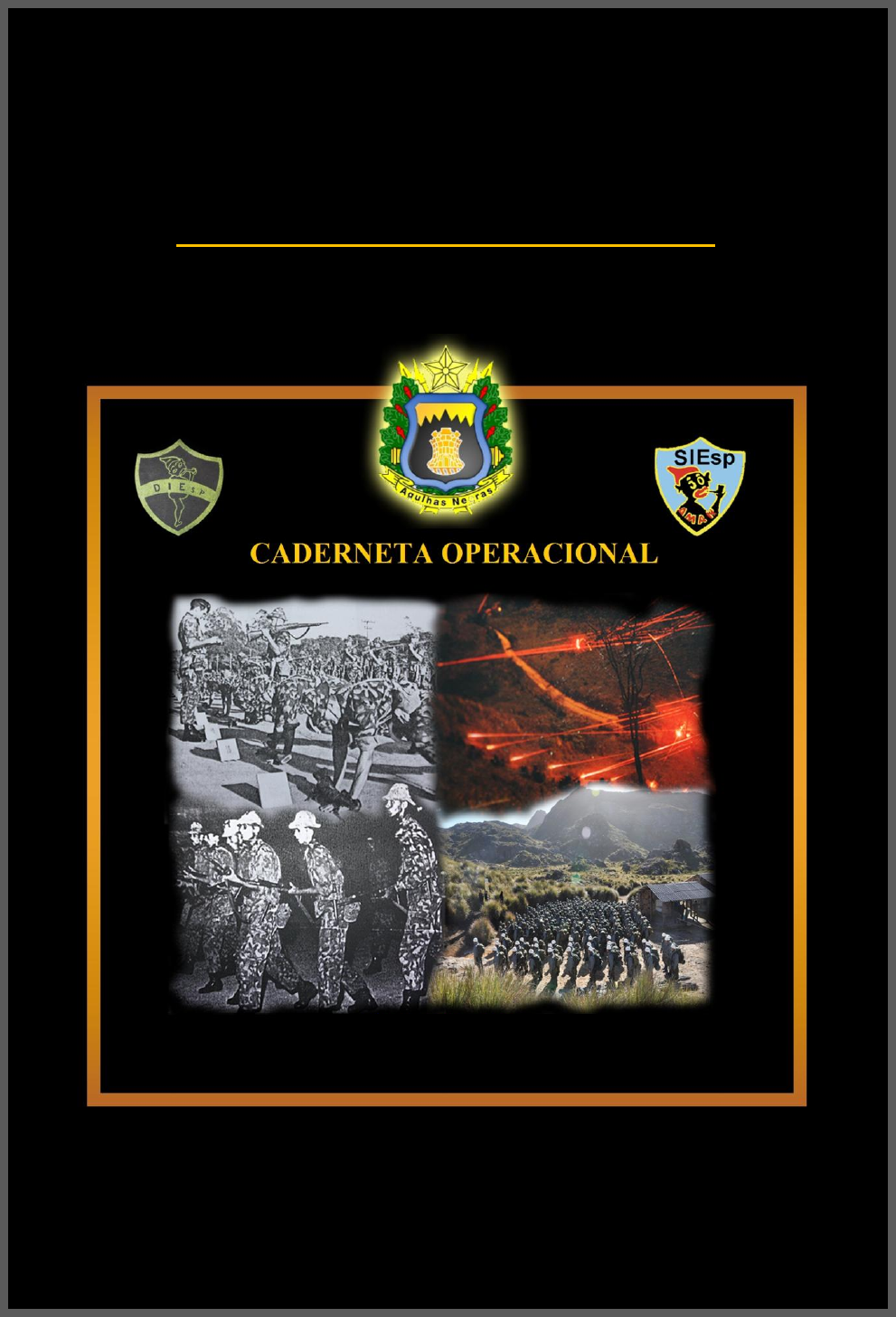 <p>MINISTÉRIO DA DEFESA</p><p>EXÉRCITO BRASILEIRO</p><p>DECEx - DFA – DESMil - AMAN - CC</p><p>SEÇÃO DE INSTRUÇÃO ESPECIAL</p><p>2013 1967</p><p>5ª Edição (Jan 2013)</p><p>46ª Aniversário da SIEsp</p><p>Caderneta Operacional da SIEsp/AMAN 5ª Edição - Jan / 2013 2</p><p>OS PIONEIROS</p><p>1967 – Ten Cel JOFFRE, Cap SIQUEIRA, Cap NOGUEIRA, Ten WALTEMBERG, Ten</p><p>CÂMARA SENNA, Sgt EVARISTO e Sgt MARTON.</p><p>Caderneta Operacional da SIEsp/AMAN 5ª Edição - Jan / 2013 3</p><p>“O soldado, o combatente, o</p><p>guerreiro não se molda apenas na</p><p>teoria, talvez o amador. O</p><p>profissional é forjado e lapidado no</p><p>desconforto, no frio, na chuva, sob</p><p>pressão, com a mochila às costas,</p><p>com a arma nas mãos e com firme</p><p>convicção de vencer os obstáculos e</p><p>vencer a si mesmo. Sua têmpera de</p><p>militar é algo para ser trabalhado</p><p>na dureza e no rigor do treinamento</p><p>intenso, dando-lhe a exata noção da</p><p>realidade e da dificuldade do</p><p>combate, mesmo que não haja aí o</p><p>cheiro de pólvora e morte”.</p><p>BRASIL ACIMA DE TUDO!</p><p>Caderneta Operacional da SIEsp/AMAN 5ª Edição - Jan / 2013 4</p><p>1. HISTÓRICO DA SIEsp</p><p>12 Ago 66 - BI 155 - AMAN - Nomeação da comissão especial de estudos que iniciou a</p><p>estruturação do DIEsp.</p><p>1967 - Início das atividades escolares, quando foram ministradas instruções</p><p>de Patrulha, Guerra Revolucionária, Guerra na Selva e Fuga e Evasão.</p><p>08 Dez 69 - Portaria Nr 54 Res - EME - oficializou, em caráter definitivo, a criação da</p><p>Seção de Instrução Especial.</p><p>2000 - Foram nomeados pela 1ª vez monitores - sargentos especializados na SIEsp/AMAN.</p><p>2007 - Por ocasião do Jubileu de 40 anos da SIEsp/AMAN, a SIEsp/EsSA, criada em</p><p>2005, inicia as suas atividades, ministrando os primeiros estágios de instrução especial.</p><p>2. DESCRIÇÃO DO DISTINTIVO DA SIEsp</p><p>a. Escudo triangular metálico com friso dourado em campo azul, representando a nobreza</p><p>da missão escolar de formar guerreiros para a defesa da pátria.</p><p>b. Figura lendária do SACI nas cores preta e vermelha, simbolizando o estagiário</p><p>camuflado que, a exemplo do personagem da lenda, desenvolve suas atividades</p><p>diuturnamente pelas matas, campos e florestas, com a característica de surgir e desaparecer</p><p>de surpresa, inquietando, armando ciladas nos caminhos e levando o medo e a destruição ao</p><p>inimigo.</p><p>c. Sigla da AMAN com as 04 (quatro) letras com frisos dourados, simbolizando</p><p>a nobreza do sacrifício e o grau de exigência a ser enfrentado pelo cadete nos 4</p><p>(quatro) estágios clássicos da seção.</p><p>d. Sigla formada com as iniciais das palavras “Seção” e “Instrução”, definindo,</p><p>respectivamente, o grau hierárquico e a missão ligada a atividade fim da instituição;</p><p>abreviatura da palavra “Especial” que define a peculiaridade da instrução necessária ao</p><p>cumprimento das missões especiais.</p><p>3. A MISSÃO DA SIEsp</p><p>Planejar, organizar, montar, aplicar e avaliar os cadetes em estágios de instrução especial,</p><p>que envolvam atividades como:</p><p>- Montanhismo Militar;</p><p>- Vida na Selva e Técnicas Especiais;</p><p>- Patrulhas de Longo Alcance com Características Especiais;</p><p>- Operações contra Forças Irregulares; e outras atividades que possam contribuir</p><p>na preparação do futuro oficial, levando-o a enfrentar condições de extrema dificuldade e</p><p>ponderável pressão psicológica, quando se busca ao máximo imitação do combate em ritmo</p><p>de operações continuadas.</p><p>Caderneta Operacional da SIEsp/AMAN 5ª Edição - Jan / 2013 5</p><p>“Os nossos olhos estão voltados para a formação</p><p>dos nossos soldados, para a afirmação do</p><p>BRASIL perante as demais nações e para o</p><p>respeito à nossa soberania, sem nos dobrarmos a</p><p>interesses de quem quer que seja, individuais ou de</p><p>países estrangeiros, tendo a ousadia de combater</p><p>com todas as forças os indiferentes, que pouco ou</p><p>nada fazem por este País continente, sob pena de</p><p>sermos amanhã repudiados pelos nossos</p><p>descendentes, por não serem donos do seu território.</p><p>Assim sendo, coloquemos os interesses do</p><p>BBRRAASSIILL AACCIIMMAA DDEE TTUUDDOO, acima de</p><p>nós mesmos!”</p><p>Cel Inf J. B. Souza</p><p>Caderneta Operacional da SIEsp/AMAN 5ª Edição - Jan / 2013 6</p><p>Í N D I C E</p><p>OPERAÇÕES DE PATRULHA</p><p>Pag</p><p> Atividades do Cmt de Patrulha ................................................ 10</p><p>1. Recebimento da Missão........................................................... 11</p><p>2. Normas de Comando ........................................................... 14</p><p>a. Estudo Sumário da Missão .................................................... 14</p><p>b. Planejamento da Utilização do Tempo .................................. 15</p><p>c. Estudo de Situação Preliminar................................................ 16</p><p>d. Planejamento da Organização de Pessoal e Material............ 17</p><p>e. Planejamento do Rec................................................................ 23</p><p>f. Emissão da Ordem Preparatória ............................................ 24</p><p>g. Realização do Rec..................................................................... 26</p><p>h. Planejamento Detalhado ......................................................... 26</p><p>f. Emissão da Ordem à Patrulha ................................................ 29</p><p>g. Inspeções e Ensaios ................................................................. 35</p><p>3. Atividades Complementares ................................................ 37</p><p>a. Relatório ................. ................................................................ 38</p><p> Atribuiçõe
