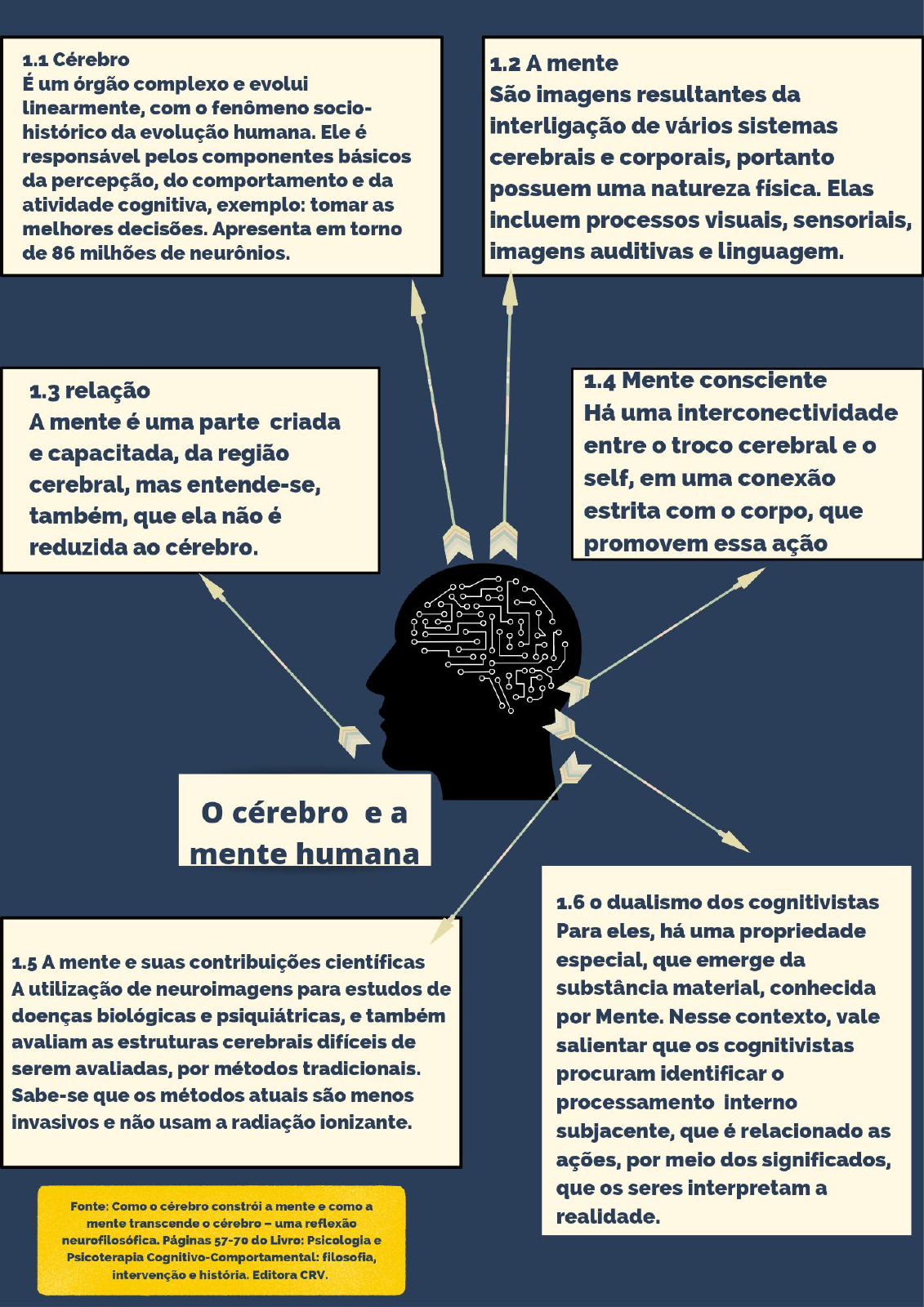 <p>1.1 Cérebro 1.2 A mente É um órgão complexo e evolui São imagens resultantes da linearmente, com o fenômeno socio- histórico da evolução humana. Ele é interligação de vários sistemas responsável pelos componentes básicos cerebrais e corporais, portanto da percepção, do comportamento e da possuem uma natureza física. Elas atividade cognitiva, exemplo: tomar as melhores decisões. Apresenta em torno incluem processos visuais, sensoriais, de 86 milhões de neurônios. imagens auditivas e linguagem. 1.3 relação 1.4 Mente consciente A mente é uma parte criada Há uma interconectividade e capacitada, da região entre o troco cerebral e o cerebral, mas entende-se, self, em uma conexão também, que ela não é estrita com o corpo, que reduzida ao cérebro. promovem essa ação cérebro e a mente humana 1.6 o dualismo dos cognitivistas Para eles, há uma propriedade 1.5 A mente e suas contribuições especial, que emerge da A utilização de neuroimagens para estudos de substância material, conhecida doenças biológicas e psiquiátricas, e também por Mente. Nesse contexto, vale avaliam as estruturas cerebrais difíceis de salientar que os cognitivistas serem avaliadas, por métodos tradicionais. procuram identificar o Sabe-se que os métodos atuais são menos processamento interno invasivos e não usam a radiação ionizante. subjacente, que é relacionado as ações, por meio dos significados, que os seres interpretam a Fonte: Como o cérebro constrói a mente e como a mente transcende o cérebro uma reflexão Páginas 57-70 do Livro: Psicologia e Psicoterapia Cognitivo-Comportamental: filosofia, intervenção e história. Editora CRV.</p>