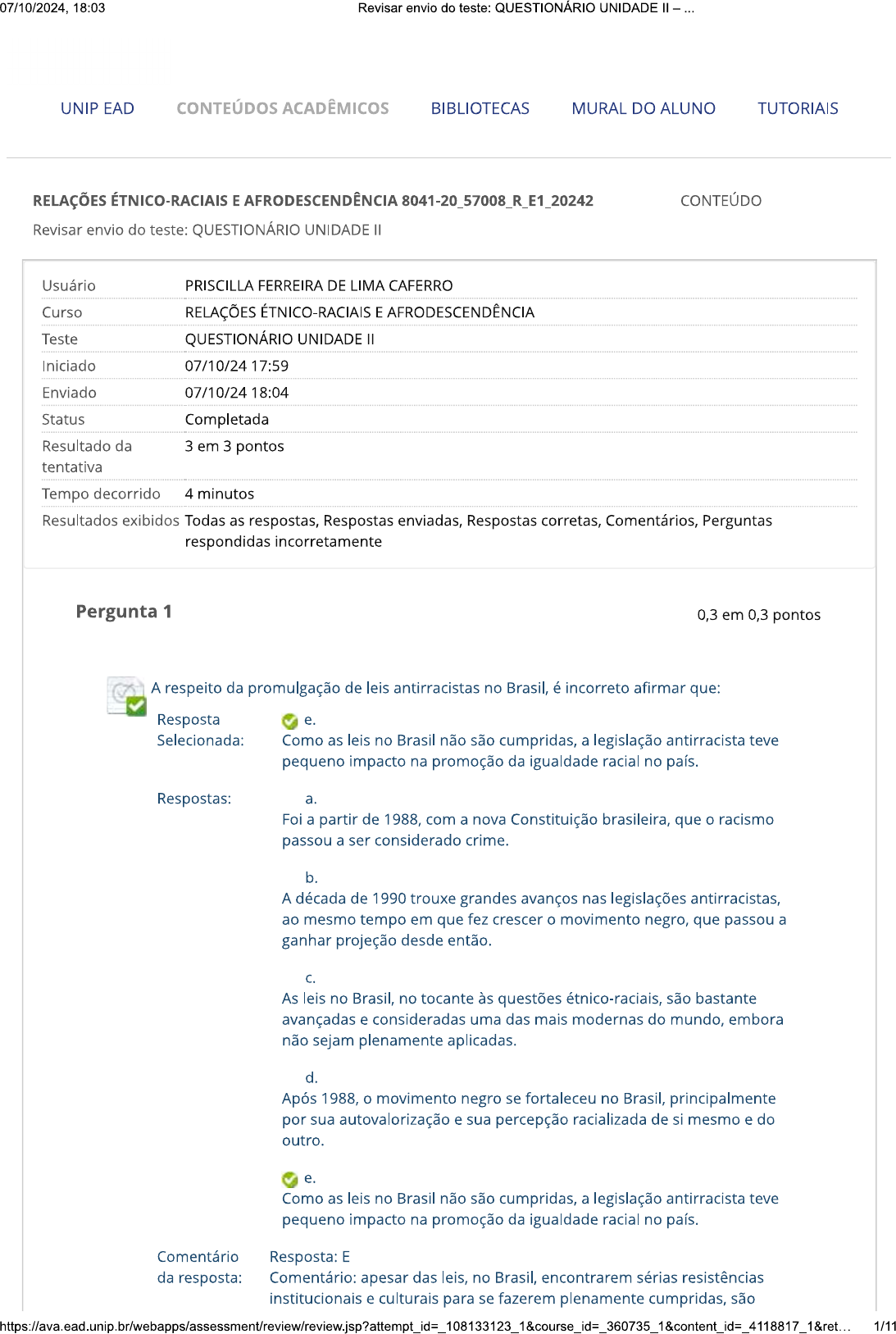 <p>07/10/2024, 18:03 Revisar envio do teste: QUESTIONÁRIO UNIDADE UNIP EAD CONTEÚDOS ACADÊMICOS BIBLIOTECAS MURAL DO ALUNO TUTORIAIS RELAÇÕES ÉTNICO-RACIAIS E AFRODESCENDÊNCIA 8041-20_57008_R_E1_20242 CONTEÚDO Revisar envio do teste: QUESTIONÁRIO UNIDADE Usuário PRISCILLA FERREIRA DE LIMA CAFERRO Curso RELAÇÕES ÉTNICO-RACIAIS E AFRODESCENDÊNCIA Teste QUESTIONÁRIO UNIDADE II Iniciado 07/10/24 17:59 Enviado 07/10/24 18:04 Status Completada Resultado da 3 em 3 pontos tentativa Tempo decorrido 4 minutos Resultados exibidos Todas as respostas, Respostas enviadas, Respostas corretas, Comentários, Perguntas respondidas incorretamente Pergunta 1 0,3 em 0,3 pontos A respeito da promulgação de leis antirracistas no Brasil, é incorreto afirmar que: Resposta e. Selecionada: Como as leis no Brasil não são cumpridas, a legislação antirracista teve pequeno impacto na promoção da igualdade racial no país. Respostas: a. Foi a partir de 1988, com a nova Constituição brasileira, que o racismo passou a ser considerado b. A década de 1990 trouxe grandes avanços nas legislações antirracistas, ao mesmo tempo em que fez crescer o movimento negro, que passou a ganhar projeção desde então. C. As leis no Brasil, no tocante às questões étnico-raciais, são bastante avançadas e consideradas uma das mais modernas do mundo, embora não sejam plenamente aplicadas. d. Após 1988, o movimento negro se fortaleceu no Brasil, principalmente por sua autovalorização e sua percepção racializada de si mesmo e do outro. e. Como as leis no Brasil não são cumpridas, a legislação antirracista teve pequeno impacto na promoção da igualdade racial no país. Comentário Resposta: E da resposta: Comentário: apesar das leis, no Brasil, encontrarem sérias resistências institucionais e culturais para se fazerem plenamente cumpridas, são 1/11</p><p>07/10/2024, 18:03 Revisar envio do teste: QUESTIONÁRIO UNIDADE notórias as repercussões positivas na melhoria da condição dos afrodescendentes no Brasil, medida pelos levantamentos estatísticos nos últimos dez anos, e na promoção da igualdade racial em nosso país. Pergunta 2 0,3 em 0,3 pontos Analise as afirmações a seguir, que abordam a relação entre o ECA (Estatuto da Criança e do Adolescente) e as populações afrodescendentes: I- Pela primeira vez, crianças e adolescentes passam a ser tratados como cidadãos de direitos. II- A partir da publicação do ECA, as crianças e os adolescentes passam a ser protegidos por lei, não podendo sofrer qualquer forma de negligência ou discriminação. III- Há estreita relação entre a aprovação do ECA e as normativas internacionais, que igualmente se colocam contra toda forma de discriminação fundada na raça, sexo, origem e cor. IV- A Declaração Universal dos Direitos Humanos, aprovada pela Assembleia Geral da Organização das Nações Unidas (ONU) em 1948, pode ser considerada o marco inicial da preocupação com as questões étnico-raciais pelos instrumentos normativos internacionais. V- ECA trouxe pouca contribuição à promoção da igualdade racial no Brasil, uma vez que apenas um de seus artigos trata especificamente da discriminação de raça, con e origem. Estão corretas as seguintes afirmações: Resposta Selecionada: b. I, II, III e IV. Respostas: a. I, II e III. b. I, II, III e IV. II, III, IV e V. C. d. I, II, IV e V. I, III, IV e V. e. Comentário Resposta: B da resposta: Comentário: apesar de um único artigo do ECA fazer alusão à discriminação, pode-se considerar que, após a promulgação da nova Constituição brasileira, em 1988, essa foi a legislação mais importante para crianças e adolescentes no Brasil, refletindo-se também nas políticas de assistência social e educacionais a partir de então Pergunta 3 0,3 em 0,3 pontos (Concurso Público IFAL Docente Copema, 2010) Dentre as iniciativas, no âmbito do poder público para as ações afirmativas de inclusão social, insere-se a publicação das Diretrizes Curriculares Nacionais para a Educação das Relações Étnico-Raciais e para o Ensino de</p><p>07/10/2024. 18:03 Revisar envio do teste: QUESTIONÁRIO UNIDADE História e Cultura Afro-Brasileira e Africana. Sobre essas Diretrizes, o princípio da consciência política e histórica da diversidade deve conduzir: I- Ao conhecimento e à valorização da história dos povos africanos e da cultura afro- brasileira na construção histórica e cultural brasileira. À crítica pelos coordenadores pedagógicos, orientadores educacionais, professores, das representações dos negros e de outras minorias nos textos, materiais didáticos, bem como providências para corrigi-las. III- Ao esclarecimento a respeito de equívocos quanto a uma identidade humana universal. IV- À desconstrução, por meio de questionamentos e análises críticas, objetivando eliminar conceitos, ideias, comportamentos veiculados pela ideologia do branqueamento, pelo mito da democracia racial, que tanto mal fazem a negros e brancos. Estão corretas as afirmações: Resposta Selecionada: d. e IV. Respostas: a. II. b. e IV. I, e III. C. d. e IV. e. II, III e IV. Comentário Resposta: D da resposta: Comentário: na afirmação II, a necessidade do uso crítico de todo material didático por professores e demais envolvidos no processo educativo não está explícita na lei, apesar de configurar um importante posicionamento na promoção da igualdade racial na escola, na sala de aula, na sociedade etc. A questão apresentada na afirmação III não é pertinente, visto que as Diretrizes não trazem uma discussão ou crítica sobre uma suposta "identidade humana universal", mas incentiva o respeito à diversidade étnico-racial, bem como as contribuições das populações afrodescendentes para a construção da história e da cultura do Brasil. Pergunta 4 0,3 em 0,3 pontos Analise as afirmativas, sobre a Lei 12.288/2010, e assinale a alternativa incorreta: Resposta C. Selecionad