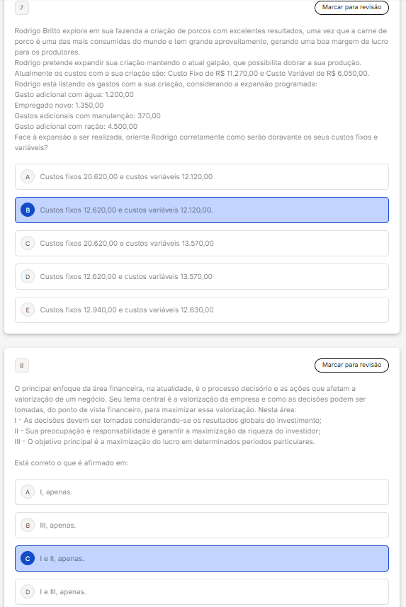 <p>Marcar para revisão Rodrigo Britto explora em sua fazenda a criação de porcos com excelentes uma vez que a carne de porco é uma das mais consumidas do mundo e grande aproveitamento, gerando uma boa margem de lucro para os Rodrigo pretende expandir sua criação mantendo atual que possibilita dobrar a sua produção. Atualmente os custos com a sua criação são: Custo Fixo de 11.270,00 e Custo Variável de R$ Rodrigo está listando os gastos com a sua considerando a expansão programada: Gasto adicional com água: 1.200,00 Empregado novo: 1.350,00 Gastos adicionais com manutenção: 370,00 Gasto adicional com ração: 4.500,00 Face à expansão a ser oriente Rodrigo corretamente como serão doravante os seus custos fixos e variáveis? A Custos fixos 20.620,00 e custos variáveis 12,120.00 Custos fixos 12.620,00 e custos variáveis Custos fixos 20.620,00 e custos variáveis 13.570,00 D Custos fixos 12.620,00 e custos variáveis 13.570,00 E Custos fixos 12.940,00 e custos variáveis 12,630.00 8 Marcar para revisão O principal enfoque da área na é processo decisório e as ações que afetam a valorização de um Seu tema central é a valorização da empresa e como as decisões podem ser do ponto de vista para maximizar essa Nesta área: As decisões devem ser tomadas considerando-se os resultados globais do Sua preocupação e responsabilidade é garantir a maximização da riqueza do investidor; III - O objetivo principal é a maximização do lucro em determinados períodos Está correto que é afirmado em: A I, B III, apenas. apenas. D e III,</p>
