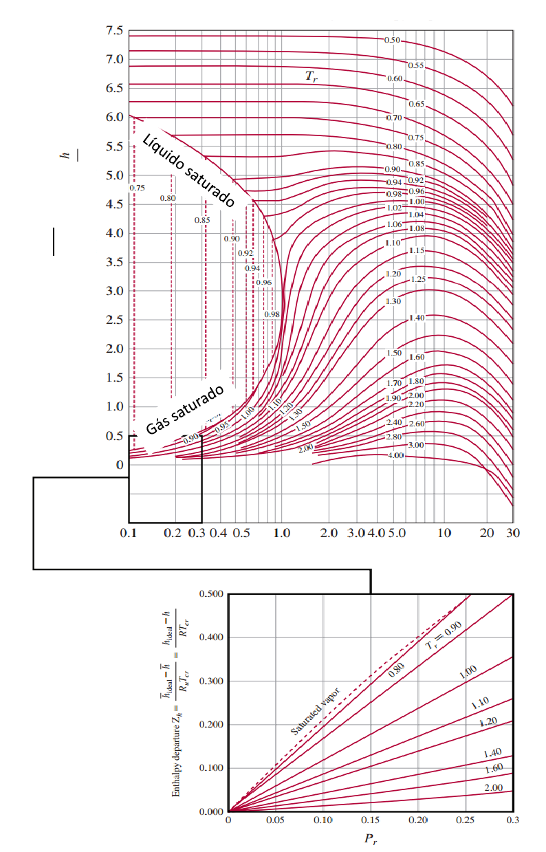 <p>Disciplina: Termodinâmica dos Materiais</p><p>Identificação da tarefa: Tarefa 3. Unidade 3. Envio de Arquivo.</p><p>Pontuação: 10 pontos</p><p>TAREFA 3</p><p>.</p><p>Fonte: http://eon.sdsu.edu/testhome/Test/solve/basics/tables/tablesRG/hNO.html</p><p>Pressão reduzida 𝑷𝒓</p><p>D</p><p>if</p><p>er</p><p>en</p><p>ça</p><p>d</p><p>e</p><p>E</p><p>n</p><p>ta</p><p>lp</p><p>ia</p><p>𝒉</p><p>∗</p><p>−</p><p>𝒉</p><p>𝑹</p><p>𝑻</p><p>𝒄</p><p>Voltemos ao exemplo do Capítulo 7. Imagine um processo de estrangulamento (por</p><p>exemplo, por uma válvula de estrangulamento) em que o gás metano passa de 2 MPa</p><p>para 0,92 MPa na temperatura de 25°C sem troca de calor (adiabático) e em regime</p><p>permanente. Determine a temperatura final do metano 𝑻𝒔</p><p>De acordo com a primeira lei, assumindo como desprezíveis a energia cinética e</p><p>potencial, sendo interações de calor e trabalho nulos, teremos ℎ𝑒 = ℎ𝑠 em que ℎ𝑒 =</p><p>ℎ(𝑇𝑒 , 𝑃𝑒) e ℎ𝑠 = ℎ(𝑇𝑠, 𝑃𝑠) sendo 𝑻𝒔 o termo desconhecido. Para podermos utilizar as</p><p>coordenadas generalizadas precisamos de obter os seguinte valores tabelados e fixos do</p><p>metano:</p><p>• 𝑃𝑐 = 4,60 MPa</p><p>• 𝑇𝑐 = 190,4 K</p><p>• 𝐶𝑃0 = 2,2537 kJ/kg. K</p><p>• 𝑅 = 0,51832 kJ/kg. K</p><p>E com esses valores podemos determinar a temperatura e pressão reduzida:</p><p>𝑇𝑟,𝑒 =</p><p>298,15 K</p><p>190,4 K</p><p>= 1,566 ; 𝑃𝑟,𝑒 =</p><p>2,0 MPa</p><p>4,60 MPa</p><p>= 0,4347 ; 𝑃𝑟,𝑠 =</p><p>0,92 MPa</p><p>4,60 MPa</p><p>= 0,20</p><p>Por outro lado, expandido a entalpia teremos:</p><p>ℎ𝑒 − ℎ𝑠 = (ℎ𝑠</p><p>∗ − ℎ𝑠) + (ℎ𝑒</p><p>∗ − ℎ𝑠</p><p>∗) − (ℎ𝑒</p><p>∗ − ℎ𝑒) = 0</p><p>em que o termo (ℎ𝑠</p><p>∗ − ℎ𝑠) é função de 𝑇𝑟,𝑠 e 𝑃𝑟,𝑠, (ℎ𝑒</p><p>∗ − ℎ𝑠</p><p>∗) é a integral do calor</p><p>específico de 𝑇𝑒 até 𝑇𝑠 enquanto o último termo (ℎ𝑒</p><p>∗ − ℎ𝑒) é função de 𝑇𝑟,𝑒 e 𝑃𝑟,𝑒.</p><p>Embora a única incógnita seja 𝑇𝑟,𝑠 (ou equivalentemente 𝑇𝑠), a solução deve ser</p><p>encontrada por métodos de tentativa e erro iterativos.</p><p>A solução será mostrada considerando que o estado da saíde é não saturado e que o</p><p>calor específico do gás é constante. Da Figura dada para 𝑇𝑟,𝑒 = 1,566 e 𝑃𝑟,𝑒 = 0,4347:</p><p>ℎ𝑒</p><p>∗ − ℎ𝑒</p><p>𝑅𝑇𝑐</p><p>= 0,19581 e, logo, ℎ𝑒</p><p>∗ − ℎ𝑒 = 0,19581 𝑅𝑇𝑐</p><p>= (0,19581)(0,51832 kJ/kg. K)(190,4 K) = 19,325 kJ/kg</p><p>Assim, podemos escrever a equação final como:</p><p>ℎ𝑒</p><p>∗(𝑇𝑒) − ℎ𝑠</p><p>∗(𝑇𝑠) + [</p><p>ℎ𝑠</p><p>∗ − ℎ𝑠</p><p>𝑅𝑇𝑐</p><p>] (𝑇𝑟,𝑠, 𝑃𝑟,𝑠)𝑅𝑇𝑐 − 19,325 kJ/kg = 0</p><p>Aonde</p><p>ℎ𝑒</p><p>∗(𝑇𝑒) − ℎ𝑠</p><p>∗(𝑇𝑠) = ∫ 𝐶𝑃0(𝑇) 𝑑𝑇</p><p>𝑇𝑒</p><p>𝑇𝑠</p><p>com 𝐶𝑃0(𝑇) = 𝑐𝑡𝑒 = 2,2537 kJ/kg. K</p><p>Que pode ser resolvida iterativamente por meio de “chutes” no valor de 𝑇𝑠 que zerem</p><p>essa equação. Determine 𝑇𝑠.</p>
