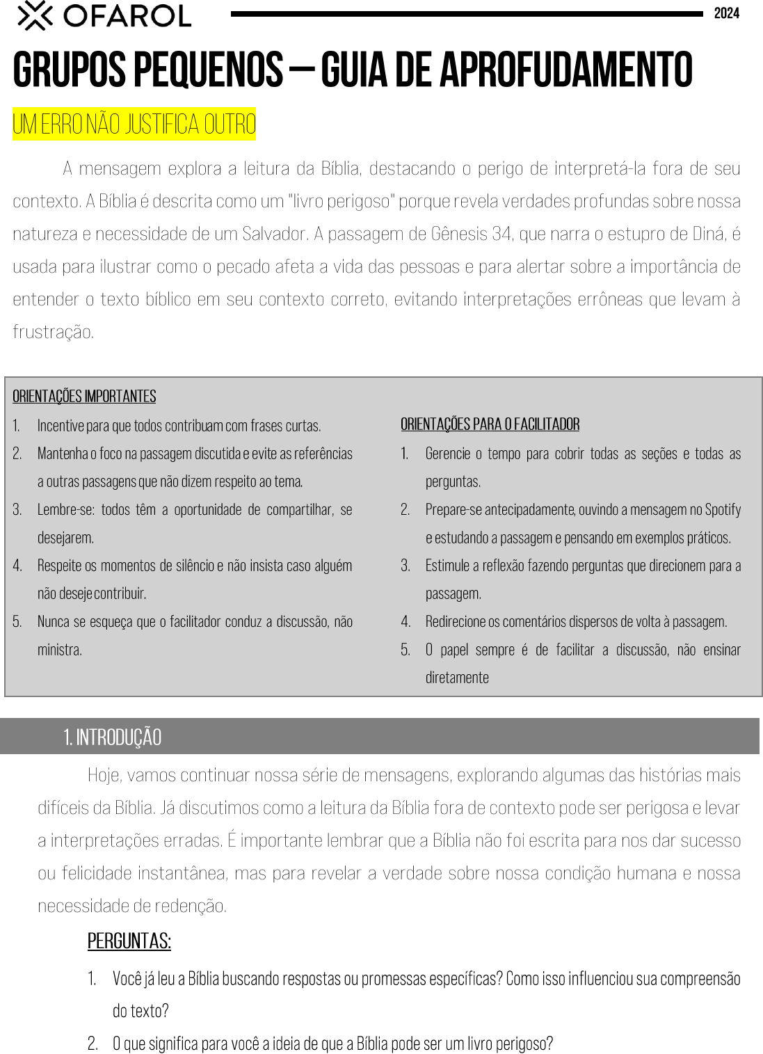 <p>OFAROL 2024 DE APROFUDAMENTO UM ERRO NÃO JUSTIFICA OUTRO A mensagem explora a leitura da Bíblia, destacando 0 perigo de interpretá-la fora de seu contexto. A Bíblia é descrita como um "livro perigoso" porque revela verdades profundas sobre nossa natureza e necessidade de um Salvador. A passagem de Gênesis 34, que narra 0 estupro de é usada para ilustrar como 0 pecado afeta a vida das pessoas e para alertar sobre a importância de entender 0 texto bíblico em seu contexto correto, evitando interpretações errôneas que levam à frustração. ORIENTAÇÕES IMPORTANTES 1. Incentive para que todos contribuam com frases curtas. ORIENTAÇÕES PARA 0 FACILITADOR 2. Mantenha 0 foco na passagem discutida e evite as referências 1. Gerencie 0 tempo para cobrir todas as seções e todas as a outras passagens que não dizem respeito ao tema. perguntas. 3. Lembre-se: todos têm a oportunidade de compartilhar, se 2. Prepare-se antecipadamente, ouvindo a mensagem no Spotify desejarem. e estudando a passagem e pensando em exemplos práticos. 4. Respeite os momentos de silêncio e não insista caso alguém 3. Estimule a reflexão fazendo perguntas que direcionem para a não deseje contribuir. passagem. 5. Nunca se esqueça que 0 facilitador conduz a discussão, não 4. Redirecione os comentários dispersos de volta à passagem. ministra. 5. 0 papel sempre é de facilitar a discussão, não ensinar diretamente 1. INTRODUÇÃO Hoje, vamos continuar nossa série de mensagens, explorando algumas das histórias mais difíceis da Bíblia. Já discutimos como a leitura da Bíblia fora de contexto pode ser perigosa e levar a interpretações É importante lembrar que a Bíblia não foi escrita para nos dar sucesso ou felicidade instantânea, mas para revelar a verdade sobre nossa condição humana e nossa necessidade de redenção. PERGUNTAS: 1. Você já leu a Bíblia buscando respostas ou promessas específicas? Como isso influenciou sua compreensão do texto? 2. 0 que significa para você a ideia de que a Bíblia pode ser um livro perigoso?</p><p>OFAROL 2024 2. RETROSPECTIVA E DISCUSSÃO Nos encontros anteriores, enfatizamos a importância de ler a Bíblia em seu contexto. Falamos sobre como 0 hábito de pinçar versículos para conforto pessoal pode nos levar a interpretações distorcidas. Muitas vezes, as pessoas se frustram ao não encontrar 0 que esperavam na Bíblia, não porque ela falhe, mas porque sua leitura foi superficial ou descontextualizada. 0 verdadeiro perigo está em não reconhecer a Bíblia como um espelho que nos revela nossa condição e necessidade de mudança. PERGUNTAS: 1. Você já se deparou com interpretações equivocadas da Bíblia? Como isso afetou sua fé ou entendimento? 2. Por que é importante considerar 0 contexto histórico e gramatical ao ler a Bíblia? 3. LEITURA E RECONTAGEM DA PASSAGEM Vamos ler Gênesis 34:1-7, que conta a história de filha de Jacó, que foi violentada por Essa passagem não é fácil de ler, mas faz parte da narrativa bíblica para nos a extensão do pecado e suas consequências devastadoras. A história nos força a confrontar realidades duras sobre 0 mal e a necessidade de uma resposta justa e redentora. PERGUNTAS: 1. Como essa história de Gênesis 34 te impactou ao ler? 2. Qual é a importância de incluir histórias difíceis como essa na Bíblia? 4. ANÁLISE DA PASSAGEM A passagem de Gênesis 34 revela a profundidade do pecado e como ele pode destruir vidas. Ao analisarmos essa história, entendemos que a Bíblia não esconde as realidades duras, mas as expõe para que possamos aprender e refletir. 0 contexto histórico e cultural dessa passagem nos ajuda a entender a gravidade do pecado e a necessidade de uma redenção que vá além da justiça humana. PERGUNTAS: 1. 0 que essa história nos ensina sobre as consequências do pecado na vida das pessoas? 2. Como podemos aplicar as lições desta passagem à nossa compreensão do pecado e da</p><p>OFAROL 2024 5. REFLEXÃO PESSOAL Refletindo sobre Gênesis 34, somos chamados a examinar como 0 pecado pode estar presente em nossas vidas e como ele afeta não apenas a mas também aqueles que amamos. A Bíblia nos confronta com essas verdades para que possamos buscar uma transformação real e dependência de Deus. Essa reflexão deve nos levar a um entendimento mais profundo da necessidade de redenção e do impacto do pecado. PERGUNTAS: 1. Como a história de Diná desafia sua compreensão sobre as consequências do pecado em sua vida? 2. Quais mudanças você sente que precisa fazer para enfrentar as verdades que a Bíblia revela sobre sua própria vida? 6. DESAFIOS PARA COMPARTILHAR E CONVIDAR Esta semana, 0 desafio é compartilhar com alguém 0 que você aprendeu sobre a leitura da Bíblia em seu contexto correto e a importância de enfrentar as verdades difíceis que ela nos apresenta. Convide essa pessoa a refletir sobre como 0 pecado afeta nossa vida e como a Bíblia pode nos guiar para a redenção. Essa conversa pode ajudar outros a entenderem melhor a profundidade e 0 propósito das Escrituras. PERGUNTAS: 1. Quem você pode convidar para discutir essas verdades profundas sobre a Bíblia e sua leitura em contexto? 2. Como você pode ajudar alguém a entender a importância de enfrentar as duras realidades que a Bíblia revela?</p>