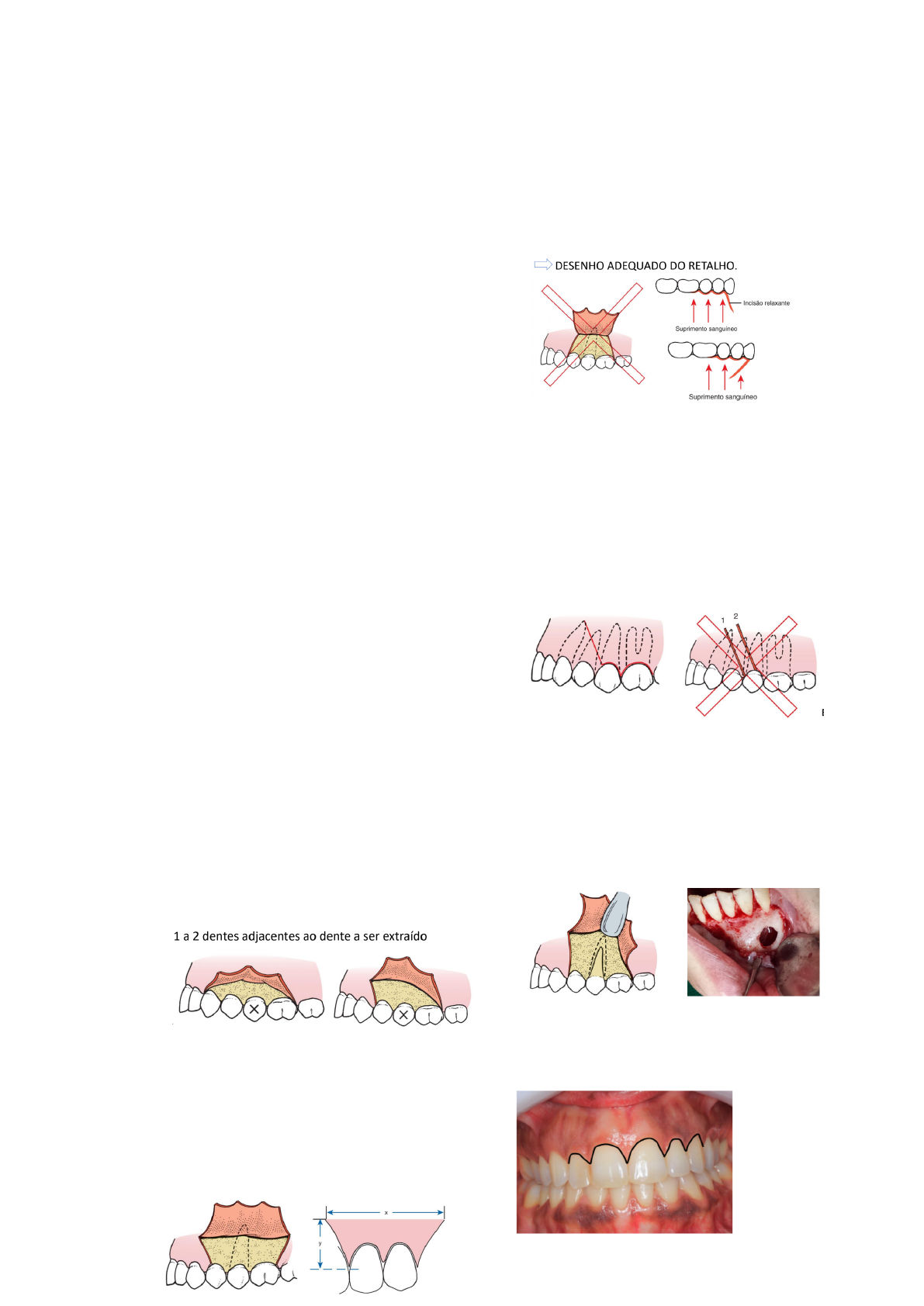 <p>Princípios de Cirurgia</p><p>Atos Operatórios Fundamentais</p><p>Diérese: Incisão da Gengiva</p><p>Exérese: Remoção do Dente</p><p>Hemostasia: Compressão com Gaze</p><p>Síntese: Sutura do Alvéolo</p><p>DIÉRESE: Representa o tempo operatório</p><p>das manobras cirúrgicas destinadas à</p><p>separação cruenta dos tecidos moles ou</p><p>duros.</p><p>Penetração tecidual. → Áreas anatômicas</p><p>de interesse.</p><p>Tecidos moles → Incisão e Divulsão</p><p>Tecido duro → Osteotomia e</p><p>Odontossecção</p><p>PRINCÍPIOS DE INCISÃO INTRA-ORAL</p><p>Evitar estruturas anatômicas importantes</p><p>● Nervo Lingual</p><p>● Nervo Mentoniano</p><p>● Artéria Palatina</p><p>● Nervo Nasopalatino*</p><p>● Tamanho adequado para boa</p><p>exposição do campo operatório</p><p>● Evitar incisões pequenas que não</p><p>expõem o campo operatório ou</p><p>promovem tensão exagerada do</p><p>retalho</p><p>DESENHO ADEQUADO DO RETALHO</p><p>● Base do retalho maior que a</p><p>margem livre.</p><p>● Formato de trapézio.</p><p>● Base maior do que a altura (x > y).</p><p>DESENHO ADEQUADO DO RETALHO</p><p>INCISÃO VERTICAL DE ALÍVIO OU</p><p>RELAXANTE.</p><p>● Forma oblíqua – base maior que o</p><p>ápice.</p><p>● Não incisar na papila.</p><p>● Não incisar no meio do colo do</p><p>dente.</p><p>MANIPULAÇÃO DO RETALHO</p><p>● Afastador repousado por dentro do</p><p>retalho sob osso .</p><p>● Sem tensão no afastamento.</p><p>Margem do retalho repousa sobre osso</p><p>sadio.</p><p>TIPOS DE INCISÃO</p><p>● Intrasulcular.</p><p>● “L” / Neumann.</p><p>• “L” / Neumann.</p><p>• Trapezoidal / Neumann Modificado.</p><p>• “L” / Neumann.</p><p>• Trapezoidal / Neumann Modificado.</p><p>• Semi Lunar / Partch.</p><p>“L” / Neumann.</p><p>• Trapezoidal / Neumann Modificado.</p><p>• Semi Lunar / Partch.</p><p>• Wasmund.</p><p>Diérese</p><p>DIVULSÃO: Separação ou divisão dos</p><p>tecidos.</p><p>INSTRUMENTAL - DIVULSÃO</p><p>Tesoura Metzembaum</p><p>Descolador Molt</p><p>DESCOLAMENTO / SINDESMOTOMIA</p><p>Iniciar o descolamento pela papila/ incisão</p><p>relaxante</p><p>INSTRUMENTAL - DIÉRESE</p><p>OSTEOTOMIA - SERRAS, BROCAS E</p><p>ALTA ROTAÇÃO E CINZÉIS E MARTELO</p><p>EXÉRESE</p><p>• Representa o tempo operatório das</p><p>manobras cirúrgicas destinadas a</p><p>retirada de parte ou todo órgão / tecido.</p><p>✓Exodontia</p><p>✓Ostectomia.</p><p>✓Curetagem.</p><p>✓Remoção de lesões patológicas.</p><p>INSTRUMENTAIS - EXÉRESE</p><p>● EXODONTIAS - Alavancas e</p><p>Fórceps, cureta de lucas ( lesões</p><p>periapicais</p><p>INSTRUMENTAIS - EXÉRESE</p><p>OSTECTOMIAS</p><p>● Corte e remoção de tecido ósseo.</p><p>● Pinça Goiva</p><p>● Brocas e alta rotação</p><p>● Cinzel e martelo</p><p>HEMOSTASIA - Um conjunto de</p><p>mecanismos que faz cessar uma</p><p>hemorragia, mantendo o</p><p>sangue dentro do vaso, sem coagular nem</p><p>extravasar, e em que se previnem</p><p>processos hemorrágicos espontâneos e</p><p>se contêm sangramentos traumáticos.</p><p>Métodos de homeostasia</p><p>● Compressão</p><p>● Pinçagem</p><p>● Ligadura</p><p>● Termocoagulação</p><p>● Substâncias Hemostáticas</p>