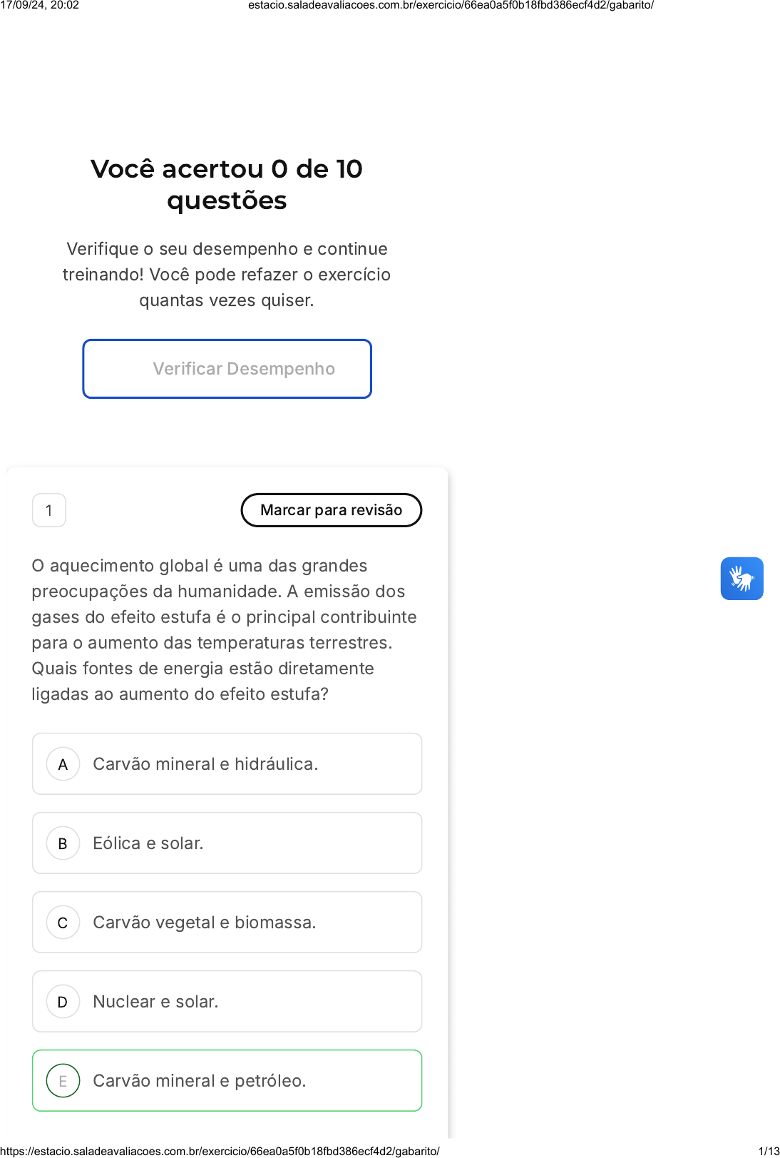 <p>Você acertou 0 de 10</p><p>questões</p><p>Verifique o seu desempenho e continue</p><p>treinando! Você pode refazer o exercício</p><p>quantas vezes quiser.</p><p>Verificar Desempenho</p><p>A</p><p>B</p><p>C</p><p>D</p><p>E</p><p>1 Marcar para revisão</p><p>O aquecimento global é uma das grandes</p><p>preocupações da humanidade. A emissão dos</p><p>gases do efeito estufa é o principal contribuinte</p><p>para o aumento das temperaturas terrestres.</p><p>Quais fontes de energia estão diretamente</p><p>ligadas ao aumento do efeito estufa?</p><p>Carvão mineral e hidráulica.</p><p>Eólica e solar.</p><p>Carvão vegetal e biomassa.</p><p>Nuclear e solar.</p><p>Carvão mineral e petróleo.</p><p>17/09/24, 20:02 estacio.saladeavaliacoes.com.br/exercicio/66ea0a5f0b18fbd386ecf4d2/gabarito/</p><p>https://estacio.saladeavaliacoes.com.br/exercicio/66ea0a5f0b18fbd386ecf4d2/gabarito/ 1/13</p><p>A</p><p>B</p><p>C</p><p>D</p><p>E</p><p>Questão não respondida</p><p>Opa! A alternativa correta é a letra</p><p>E. Confira o gabarito comentado!</p><p>Gabarito Comentado</p><p>A queima de combustíveis fósseis é o</p><p>principal contribuinte para o aquecimento</p><p>global do planeta. Dessa maneira, as fontes</p><p>de energia não renováveis, como carvão</p><p>mineral e petróleo, contribuem diretamente</p><p>para o aumento do efeito estufa e,</p><p>consequentemente, das temperaturas</p><p>terrestres.</p><p>2 Marcar para revisão</p><p>Em regiões com poucos recursos hidrográficos,</p><p>mas com boas reservas de óleo, carvão ou gás,</p><p>é possível girar as hélices das turbinas com a</p><p>força do vapor resultante da queima desses</p><p>combustíveis. Trata-se de uma geração de:</p><p>Energia solar.</p><p>Energia nuclear.</p><p>Energia hidrelétrica.</p><p>Energia eólica.</p><p>Energia termelétrica.</p><p>17/09/24, 20:02 estacio.saladeavaliacoes.com.br/exercicio/66ea0a5f0b18fbd386ecf4d2/gabarito/</p><p>https://estacio.saladeavaliacoes.com.br/exercicio/66ea0a5f0b18fbd386ecf4d2/gabarito/ 2/13</p><p>Questão não respondida</p><p>Opa! A alternativa correta é a letra</p><p>E. Confira o gabarito comentado!</p><p>Gabarito Comentado</p><p>O uso de combustíveis fósseis como o</p><p>carvão ou gás natural para geração de</p><p>energia é considerada geração termelétrica</p><p>devido ao processo de combustão para</p><p>conversão da energia química desses</p><p>compostos em energia mecânica entregue</p><p>às turbinas acopladas aos geradores.</p><p>3 Marcar para revisão</p><p>�CESGRANRIO � 2011 � Adaptada) Um dos</p><p>principais meios de suprimento de energia dos</p><p>grandes centros urbanos é a geração de</p><p>energia elétrica a partir das usinas</p><p>termelétricas. A baixa eficiência das</p><p>termelétricas, porém, é uma característica</p><p>negativa desse tipo de geração. A usina</p><p>termelétrica de ciclo combinado é uma solução</p><p>interessante que combina as tecnologias de</p><p>geração a gás e a vapor para aumentar a</p><p>eficiência total do parque de geração.</p><p>A esse respeito, analise as afirmativas a seguir.</p><p>I. Uma vantagem do ciclo</p><p>combinado é que há a possibilidade de operar</p><p>apenas com a turbina a gás, deixando a turbina</p><p>a vapor ociosa.</p><p>II. O compressor é parte constituinte</p><p>do sistema de geração a vapor, sendo</p><p>responsável por manter o vapor a alta pressão.</p><p>III. A caldeira de recuperação de calor</p><p>possibilita que o sistema de geração a vapor</p><p>Questão 3 de 10</p><p>Em branco �10�</p><p>1 2 3 4 5</p><p>6 7 8 9 10</p><p>Exercicio Geração Termelétrica Sair</p><p>17/09/24, 20:02 estacio.saladeavaliacoes.com.br/exercicio/66ea0a5f0b18fbd386ecf4d2/gabarito/</p><p>https://estacio.saladeavaliacoes.com.br/exercicio/66ea0a5f0b18fbd386ecf4d2/gabarito/ 3/13</p><p>A</p><p>B</p><p>C</p><p>D</p><p>E</p><p>aproveite o calor proveniente dos gases de</p><p>exaustão da turbina a gás.</p><p>Está correto apenas o que se afirma em:</p><p>Apenas I.</p><p>Apenas II.</p><p>Apenas III.</p><p>Apenas I e II.</p><p>Apenas I e III.</p><p>Questão não respondida</p><p>Opa! A alternativa correta é a letra</p><p>E. Confira o gabarito comentado!</p><p>Gabarito Comentado</p><p>Em centrais a ciclo combinado é possível</p><p>gerar energia utilizando apenas a turbina a</p><p>gás. A caldeira de recuperação permite</p><p>reaproveitar o calor expelido pelos gases</p><p>de exaustão para outros fins.</p><p>4 Marcar para revisão</p><p>�CESGRANRIO � 2011 � Adaptada) Na geração</p><p>de energia elétrica cada componente do</p><p>sistema empregado na geração possui uma</p><p>função. A respeito da torre de arrefecimento de</p><p>17/09/24, 20:02 estacio.saladeavaliacoes.com.br/exercicio/66ea0a5f0b18fbd386ecf4d2/gabarito/</p><p>https://estacio.saladeavaliacoes.com.br/exercicio/66ea0a5f0b18fbd386ecf4d2/gabarito/ 4/13</p><p>A</p><p>B</p><p>C</p><p>D</p><p>E</p><p>uma usina termelétrica a ciclo combinado, tem-</p><p>se que a sua:</p><p>Atuação acontece sempre que a usina</p><p>operar em ciclo aberto.</p><p>Finalidade é de refrigerar as turbinas a</p><p>gás.</p><p>Finalidade é de reduzir a temperatura</p><p>do vapor do ciclo a vapor.</p><p>Operação influencia diretamente a</p><p>potência gerada pela máquina a vapor.</p><p>Operação depende da potência</p><p>gerada por cada um dos geradores a</p><p>gás e da temperatura ambiente.</p><p>Questão não respondida</p><p>Opa! A alternativa correta é a letra</p><p>C. Confira o gabarito comentado!</p><p>Gabarito Comentado</p><p>A função da torre de arrefecimento é de</p><p>resfriar o vapor durante o ciclo.</p><p>5 Marcar para revisão</p><p>�FUNDATEC � 2022 � Adaptada) “Em 2018, a</p><p>produção de energia elétrica proveniente dos</p><p>produtos energéticos da biomassa foi 54,4 mil</p><p>gigawatt-hora �GWh�, o que representou 9% de</p><p>toda a energia elétrica produzida no Brasil. Os</p><p>17/09/24, 20: