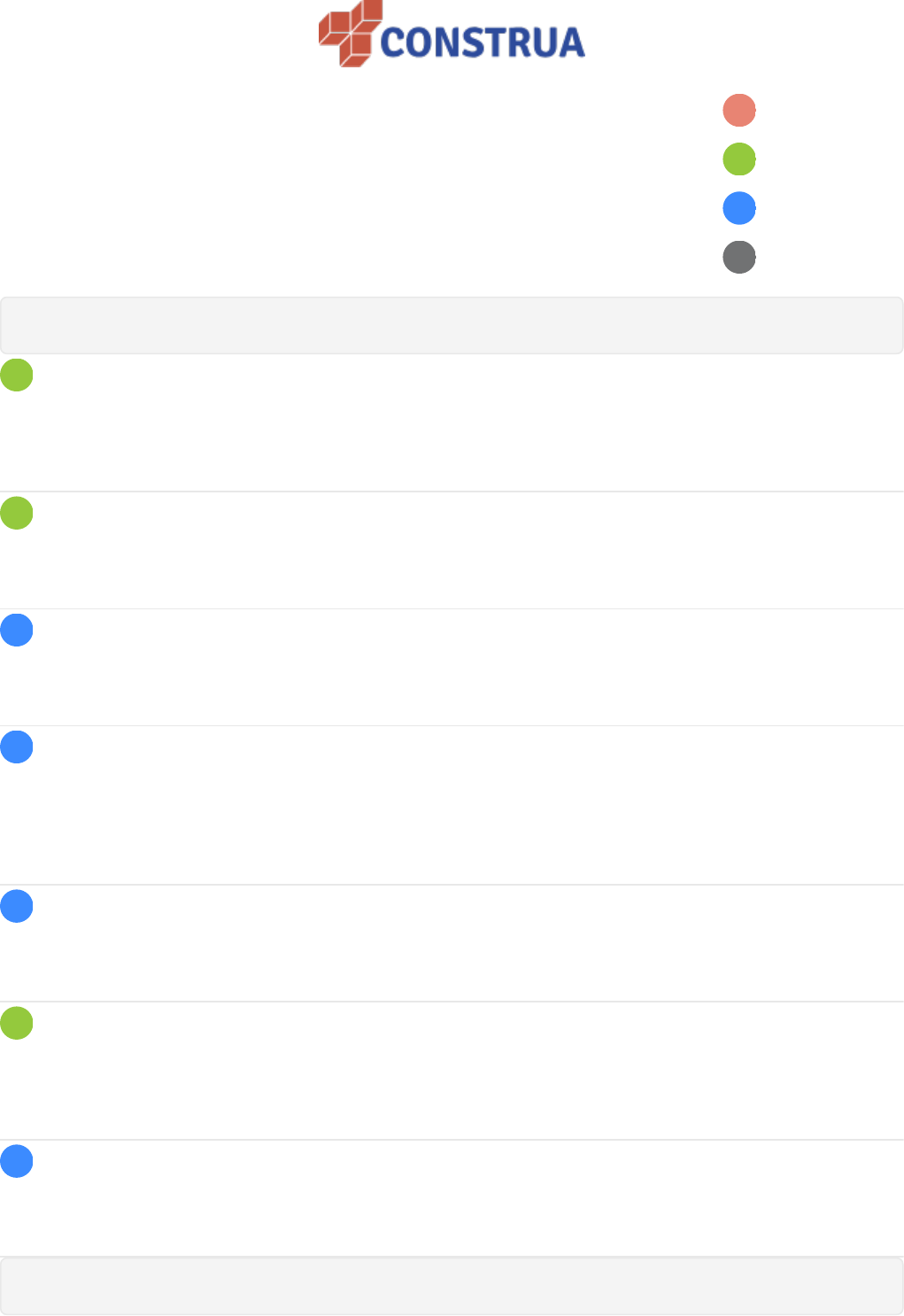 <p>Nome do Serviço: Soleira e Peitoril</p><p>Descrição do Serviço: Soleira e Peitoril</p><p>Normatizados</p><p>Boas Práticas</p><p>Bibliografia</p><p>Grupo</p><p>Assentamento da Soleira</p><p>Fazer os ajustes antes do assentamento</p><p>Antes de iniciar o assentamento deve se fazer os ajustes necessário como recortes, quando for colocar soleira entre</p><p>batentes.</p><p>Frisar a pedra</p><p>Faça pequenos frisos e umedecer a parte de baixo da pedra, isso irá garantir melhor aderência entre a massa e a pedra.</p><p>Limpar a superfície</p><p>Limpe toda a superfície tirando todos os caroços de massa ali existente.</p><p>Espelhar a massa</p><p>Espalhe a massa sobre o local que será assentando a soleira e com auxílio de um martelo de borracha bata até que esteja</p><p>alinhada ao piso sempre conferindo com régua, deixando uma leve inclinação quando for soleira de saída para área</p><p>externa.</p><p>Fazer a limpeza</p><p>Após o assentamento e ajuste limpe bem a pedra pois elas são bem fáceis de manchar.</p><p>Sinalizar o local</p><p>Fazer a sinalização para mostrando que aquela soleira foi assentada a pouco tempo e não pode ser pisada, pois se for</p><p>pisada pode movimentar ou até mesmo quebrar a pedra.</p><p>Tempo de secagem</p><p>O tempo de secagem da argamassa e de 72 h, só após esse período é permitido pisar sobre a soleira.</p><p>Assentamento de peitoril</p><p>Tirar os níveis</p><p>Tire os níveis em todas as janelas, esse nível servirá de guia para que todas as pedras fiquem na mesma altura.</p><p>Quebrar as laterais</p><p>Quebre as laterais dos vãos para fazer o engaste da pedra na parede.</p><p>Limpar a superfície</p><p>Limpe toda a superfície tirando todos os caroços de massa ali existente.</p><p>Frisar a parte de baixo da pedra</p><p>Faça pequenos frisos e umedecer a parte de baixo da pedra isso irá garantir melhor aderência entre a massa e a pedra.</p><p>Espelhar a massa</p><p>Espalhe a massa sobre o local que será assentando o peitoril e com auxílio de um martelo de borracha bata até que esteja</p><p>na altura correta, deixando sempre inclinação de 2% para fora.</p><p>Conferir pingadeira</p><p>Faça uma galga para que possa estar conferindo se as pingadeiras estão todas do mesmo tamanho.</p><p>Fazer a limpeza</p><p>Após o assentamento e ajuste limpe bem a pedra pois elas são bem fáceis de manchar.</p><p>Fazer os arremates</p><p>Após a secagem da pedra faça o arremate em baixo e nas laterais que foram quebradas.</p><p>Manuseio e armazenagem</p><p>Importante armazenar soleiras e peitoris, sobre sarrafos sempre na posição vertical, não permita que o material estocado</p><p>sirva de apoio para outras coisas, evite remanejamento desnecessário das peças, pois pode acarretar quebras.</p><p>Ferramentas</p><p>EPI’s</p><p>EPI’s.</p><p>Colher de pedreiro</p><p>Colher de pedreiro.</p><p>Masseira</p><p>Masseira.</p><p>Trena</p><p>Trena.</p><p>Lápis</p><p>Lápis.</p><p>Martelo de borracha</p><p>Martelo de borracha.</p><p>Régua</p><p>Régua.</p><p>Serra mármore</p><p>Serra mármore.</p><p>Mangueira de nível</p><p>Mangueira de nível.</p><p>Esquadro</p><p>Esquadro.</p><p>Materiais</p><p>Mármore</p><p>Mármore.</p><p>Granito</p><p>Granito.</p><p>www.construa.app</p><p>/construaapp /construa.app</p>