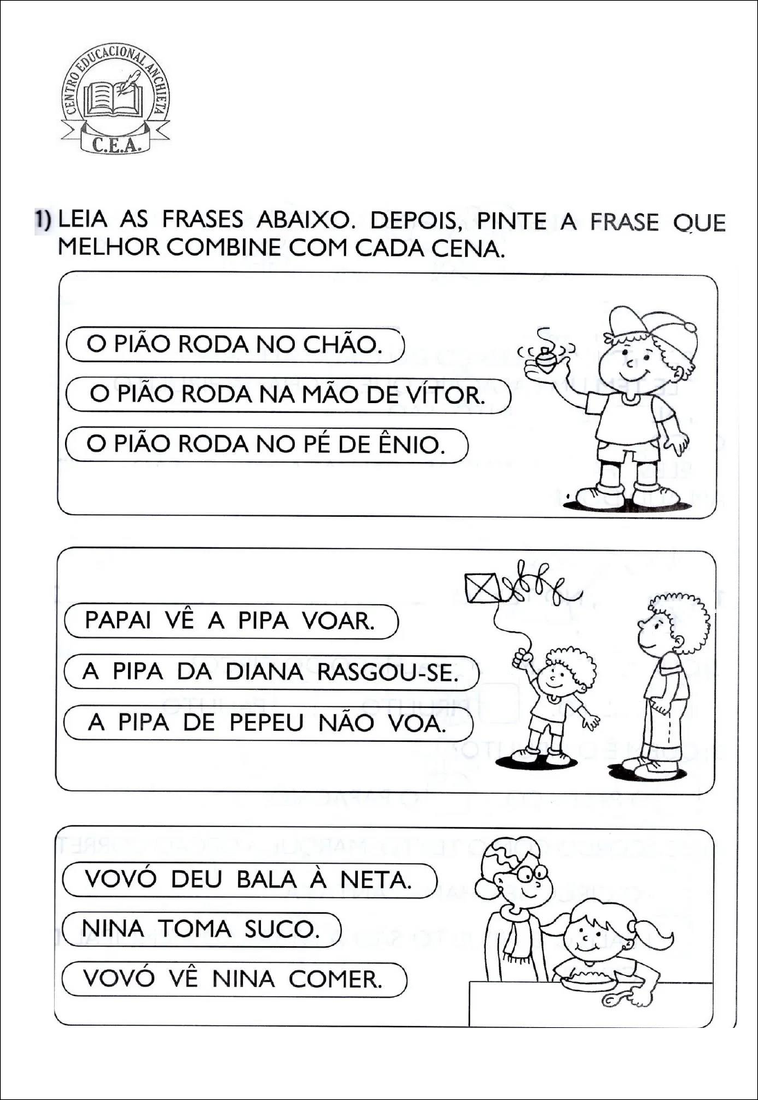 <p>Centro Educacional Anchieta</p><p>Rio de Janeiro, 21 de novembro de 202.</p><p>Revisão de Português</p><p>1º Ano</p><p>Centro Educacional Anchieta</p><p>Rio de Janeiro, 21 de novembro de 2023.</p><p>Revisão de Português</p><p>1º Ano</p><p>A vaca Mimosa</p><p>Mimosa é uma vaca que vive no sítio do vovô Zezé.</p><p>Mimosa é uma vaca muito gulosa.</p><p>Ela adora passear pelo campo e comer capim.</p><p>Kátia Texeira</p><p>1) Interpretação de texto:</p><p>a) Qual é o título do texto?</p><p>b) Mimosa é:</p><p>( ) uma formiga ( ) uma foca</p><p>( ) uma vaca ( ) uma galinha</p><p>c) Onde Mimosa vive?</p><p>d) Marque a alternativa que indica um substantivo próprio.</p><p>( ) vaca ( ) capim</p><p>( ) sítio ( ) Zezé</p><p>Centro Educacional Anchieta</p><p>Rio de Janeiro, 21 de novembro de 2023.</p><p>Revisão de Português</p><p>1º Ano</p><p>1) Dê o feminino dos substantivos abaixo:</p><p>Tio_____________________ homem_______________</p><p>Boi_____________________ papai _________________</p><p>Gato ___________________ pato ___________________</p><p>Garoto _________________ aluno ___________________</p><p>2) Substitua os desenhos pela palavra e copie as frases.</p><p>Forme frases com as figuras abaixo:</p><p>___________________________________________________</p><p>Centro Educacional Anchieta</p><p>Rio de Janeiro, 22 de novembro de 2023.</p><p>Revisão de Matemática 1º Ano</p><p>1) Algumas crianças participaram de uma pesquisa sobre o tipo de</p><p>brincadeira que mais gostam. Veja o resultado da pesquisa.</p><p>Cada = voto de 1 criança</p><p>a) Quantas crianças preferem corda? _________________________</p><p>b) Qual brincadeira teve menos voto?_________________________</p><p>c) Quantas crianças preferem brincar de boneca e pipa ao todo?</p><p>__________</p><p>d) Quantas crianças participaram da pesquisa?</p><p>_________________________</p><p>2) Efetue:</p><p>5 3 6 1 3 3 5 0 7 4 1 8</p><p>+ 2 5 + 2 8 + 4 2 + 1 7 + 1 3 + 5 0</p><p>9 4 6 8 5 9 7 3 8 5 4 9</p><p>- 3 0 - 4 8 - 1 8 - 5 2 - 3 3 - 2 5</p><p>Centro Educacional Anchieta</p><p>Rio de Janeiro, 22 de novembro de 2023.</p><p>Revisão de Matemática 1º Ano</p><p>1) Rafael resolveu representar em um gráfico, a relação de brinquedos que</p><p>possui. Leia a tabela e faça a representação dos brinquedos de Rafael no</p><p>gráfico.</p><p>BRINQUEDOS QUANTIDADES</p><p>PIPA 6</p><p>CARRINHO 10</p><p>PETECA 2</p><p>BOLA 7</p><p>BICICLETA 1</p><p>Centro Educacional Anchieta</p><p>Rio de Janeiro, 22 de novembro de 2023.</p><p>Revisão de Matemática 1º Ano</p><p>1) Pinte o brinquedo mais barato e circule o mais caro.</p><p>2) Complete a sequência numérica:</p><p>100 103</p><p>105</p><p>108 110</p><p>115</p><p>Centro Educacional Anchieta</p><p>Rio de Janeiro, 22 de novembro de 2023.</p><p>Matemática Atividade de Casa</p><p>• Atividade no caderno</p><p>1) Pinte de vermelho os números pares e de verde os números ímpares.</p><p>5 12 11 6 1 4 19 2 8 15</p><p>10 13 17 4 9 14 16 3 7 20</p><p>2) Escreva os antecessores ( o que vem antes) dos números abaixo:</p><p>125 _____________</p><p>100 ______________</p><p>95________________</p><p>35________________</p><p>29________________</p><p>185_______________</p><p>Centro Educacional Anchieta</p><p>Rio de Janeiro, 23 de novembro de 2023.</p><p>História 1º Ano</p><p>NATAL – 25 de dezembro</p><p>O Natal é uma festa em que comemora-se o nascimento de Jesus Cristo.</p><p>A partir daí, surgiram vários símbolos que representam o Natal. São eles: a</p><p>árvore, o Papai Noel, a vela, o sino, a manjedoura etc.</p><p>Centro Educacional Anchieta</p><p>Rio de Janeiro, 23 de novembro de 2023.</p><p>História 1º Ano</p><p>Centro Educacional Anchieta</p><p>Rio de Janeiro, 23 de novembro de 2023.</p><p>História e Português</p><p>Centro Educacional Anchieta</p><p>Rio de Janeiro, 23 de novembro de 2023.</p><p>História e Português 1º Ano</p><p>Centro Educacional Anchieta</p><p>Rio de Janeiro, 23 de novembro de 2023.</p><p>História e Português 1º Ano</p><p>Atividade de casa: Caderno</p><p>1) Desenhe e pinte bem bonito uma árvore de Natal.</p><p>X</p><p>X</p><p>X</p><p>X</p><p>X</p><p>X</p><p>X</p><p>X</p><p>X</p><p>X</p><p>X</p><p>X</p><p>X</p><p>X</p><p>X</p><p>X</p><p>2) Forme frases com as palavras abaixo:</p><p>Papai Noel –</p><p>X</p><p>X</p><p>X</p><p>Presentes –</p><p>X</p><p>X</p><p>X</p><p>Natal –</p><p>Centro Educacional Anchieta</p><p>Rio de Janeiro, 27 de novembro de 2023.</p><p>Português Revisão</p><p>Atividade no caderno:</p><p>Centro Educacional Anchieta</p><p>Rio de Janeiro, 27 de novembro de 2023.</p><p>Português Revisão</p><p>2- Ditado:</p><p>1 – blusa</p><p>2 – flauta</p><p>3 – dragão</p><p>4 – frango</p><p>6 – fruta</p><p>7 – vermelho</p><p>8- galinha</p><p>9 – carroça</p><p>10 – ferradura</p><p>11 – cidade</p><p>12 – salada</p><p>13 – serrote</p><p>14 – drama</p><p>15 – trinta</p><p>3) Separe as sílabas das palavras:</p><p>Campeão – cam-pe-ão</p><p>Carreta- car-re-ta</p><p>Farinha- fa-ri-nha</p><p>Formiga- for-mi-ga</p><p>Drama- dra-ma</p><p>Centro Educacional Anchieta</p><p>Rio de Janeiro, 27 de novembro de 2023.</p><p>Português Revisão</p><p>Atividade de Casa</p>