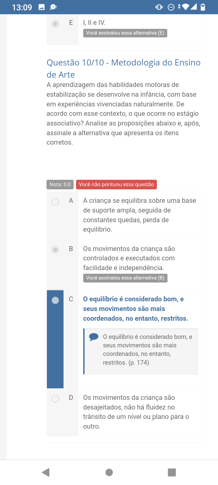 <p>13:09 E I, e IV. Você assinalou essa alternativa (E) Questão 10/10 - Metodologia do Ensino de Arte A aprendizagem das habilidades motoras de estabilização se desenvolve na infância, com base em experiências vivenciadas naturalmente. De acordo com esse contexto, o que ocorre no estágio associativo? Analise as proposições abaixo e, após, assinale a alternativa que apresenta os itens corretos. Nota: 0.0 Você não pontuou essa questão A A criança se equilibra sobre uma base de suporte ampla, seguida de constantes quedas, perda de equilíbrio. B Os movimentos da criança são controlados e executados com facilidade e independência. Você assinalou essa alternativa (B) C o equilíbrio é considerado bom, e seus movimentos são mais coordenados, no entanto, restritos. equilíbrio é considerado bom, e seus movimentos são mais coordenados, no entanto, restritos. (p. 174) D Os movimentos da criança são desajeitados, não há fluidez no trânsito de um nível ou plano para o outro</p>