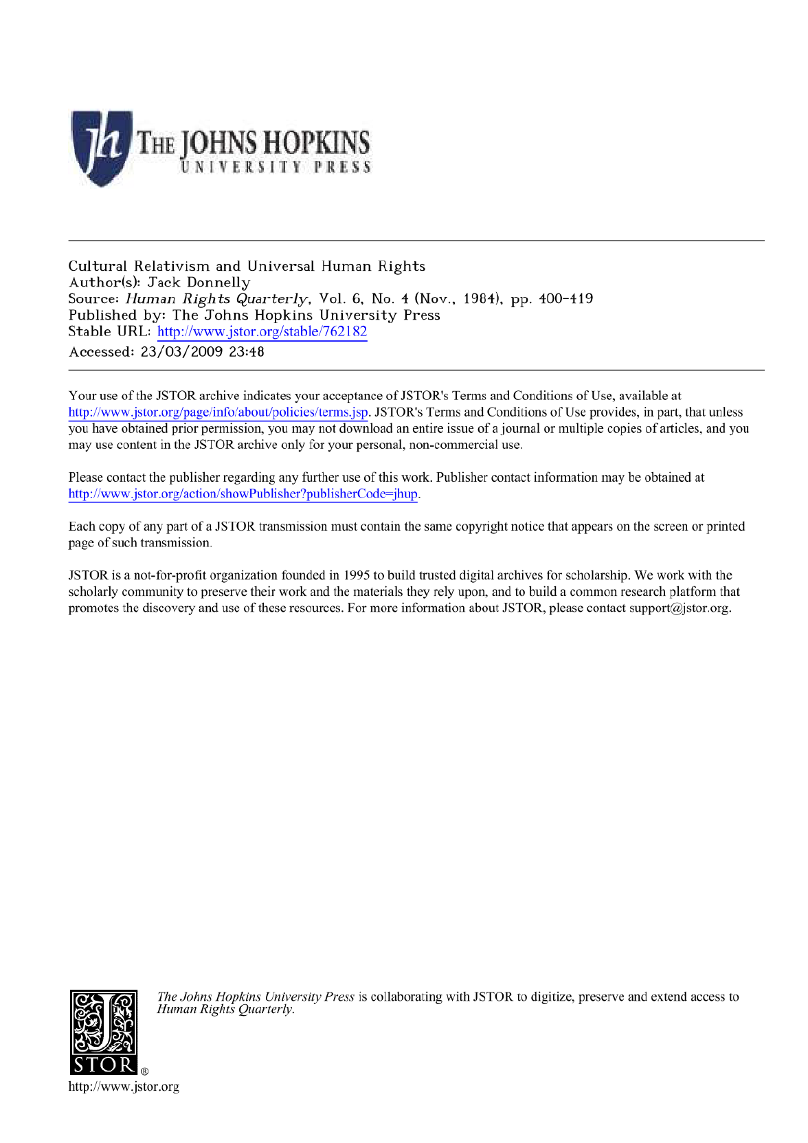 <p>VJTHEJÚHNS HOPKINS</p><p>UNIVERSITY PRESS</p><p>Cultural Relativism and Universal Human Rights</p><p>Author(s): Tack Donnelly</p><p>Source: Human Rights Quarterly, Vol. 6, No. 4 (Nov., 1984), pp. 400-419</p><p>Published by: The Tohns Hopkins University Press</p><p>Stable URL: http://www.jstor.org/stable/762182</p><p>Accessed: 23/03/2009 23:48</p><p>Your use of the JSTOR archive indicates your acceptance of JSTOR's Terms and Conditions of Use, available at</p><p>http://www.jstor.org/page/info/about/policies/terms.jsp. JSTOR's Terms and Conditions of Use provides, in part, that unless</p><p>you have obtained prior permission, you may not download an entire issue of a journal or multiple copies of articles, and you</p><p>may use content in the JSTOR archive only for your personal, non-commercial use.</p><p>Please contact the publisher regarding any further use of this work. Publisher contact information may be obtained at</p><p>http://www.jstor.org/action/showPublisher?publisherCode=jhup.</p><p>Each copy of any part of a JSTOR transmission must contain the same copyright notice that appears on the screen or printed</p><p>page of such transmission.</p><p>JSTOR is a not-for-profit organization founded in 1995 to build trusted digital archives for scholarship. We work with the</p><p>scholarly community to preserve their work and the materials they rely upon, and to build a common research platform that</p><p>promotes the discovery and use of these resources. For more information about JSTOR, please contact support@jstor.org.</p><p>The Johns Hopkins University Press is collaborating with JSTOR to digitize, preserve and extend access to</p><p>Human Rights Quarterly.</p><p>http://www.jstor.org</p><p>HUMAN RIGHTS QUARTERLY</p><p>Cultural Relativism and</p><p>Universal Human Rights</p><p>Jack Donnelly *</p><p>Cultural relativity is an undeniable fact; moral rules and social institutions</p><p>evidence an astonishing cultural and historical variability. Cultural relativism</p><p>is a doctrine that holds that (at least some) such variations are exempt from</p><p>legitimate criticism by outsiders, a doctrine that is strongly supported by</p><p>notions of communal autonomy and self-determination. Moral judgments,</p><p>however, would seem to be essentially universal, as suggested not only by</p><p>Kant's categorical imperative but also by the common sense distinction</p><p>between principled and self-interested action. And if human rights are,</p><p>literally, the rights (every)one has simply because one is a human being, they</p><p>would seem to be universal by definition.</p><p>How can the competing claims of cultural relativism and universal</p><p>human rights be reconciled? In this article | shall try to specify the nature of</p><p>their relationship, and argue for an approach that preserves the tension</p><p>between, and the insights of, both relativism and universalism.</p><p>DEFINING “CULTURAL RELATIVISM”</p><p>The two extreme positions on cultural relativism can be called radical</p><p>cultural relativism and radical universalism. Radical cultural relativism would</p><p>hold that culture is the sole source of the validity of a moral right or rule.</p><p>Radical universalism would hold that culture is irrelevant to the validity of</p><p>moral rights and rules, which are universally valid.</p><p>* Rhoda Howard's criticisms of earlier drafts forced me to greater clarity and precision, and</p><p>saved me from several errors — although | have stubbornly insisted on leaving a few in</p><p>here. John Vincent started me thinking along these lines and provided helpful comments</p><p>on an earlier draft. Ted Lewellen offered useful observations from an anthropologist's</p><p>point of view. | am grateful to them for their help.</p><p>400</p><p>Cultural Relativism 401</p><p>These radical views are ideal types that mark the end points of a con-</p><p>tinuum. The body of that continuum, those positions involving varying</p><p>mixes of relativism and universalism, can be roughly divided into what we</p><p>can call strong and weak cultural relativism.</p><p>Strong cultural relativism holds that culture is the principal source of the</p><p>validity of a moral right or rule. In other words, the presumption is that rights</p><p>(and other social practices, values, and moral rules) are culturally deter-</p><p>mined, but the universality of human nature and rights serves as a check on</p><p>the potential excesses of relativism. At its furthest extreme, just short of</p><p>radical relativism, strong cultural relativism would accept a few basic rights</p><p>with virtually universal application, but allow such a wide range of variation</p><p>for most rights that two entirely justifiable sets might overlap only slightly.</p><p>Weak cultural relativism holds that culture may be an important source</p><p>of the validity of a moral right or rule. In other words, there is a weak</p><p>presumption of universality, but the relativity of human nature, com-</p><p>munities, and rights serves as a check on potential excesses of universalism.</p><p>At its furthest extreme, just short of radical universalism, weak cultural</p><p>relativism would recognize a comprehensive set of prima facie universal</p><p>human rights and allow only relatively rare and strictly limited local varia-</p><p>tions and exceptions.</p><p>Strong and weak are relative terms referring to the extent of cultural</p><p>variation permitted. We must be careful, however, not to use merely quan-</p><p>titative measures of relativism; qualitative judgments of the significance of</p><p>different cultural variations must also be incorporated.</p><p>Across the continuum of strong and weak relativisms there are several</p><p>levels or types of relativity. In a rough way, three hierarchical levels of varia-</p><p>tion can be distinguished, involving cultural relativity in the substance of lists</p><p>of human rights, in the interpretation of individual rights