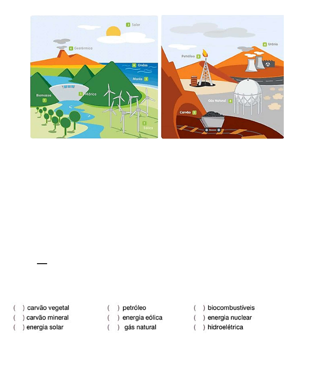 <p>E. E. PROFESSOR ERASTO CASTANHO DE ANDRADE</p><p>Nome: _____________________________________________ N°____ Série/ano: 7A</p><p>Professora: TALÍSIA Disciplina: CIÊNCIAS Data: ___________</p><p>ATIVIDADE DO 2° BIMESTRE</p><p>1. Identifique e escreva abaixo qual imagem corresponde a fontes renováveis de energia e qual são não renováveis.</p><p>_____________________ _____________________</p><p>2. Energia renovável é aquela que vem de recursos naturais que são naturalmente reabastecidos, provenientes de fontes</p><p>inesgotáveis. Faça a associação correta abaixo entre os tipos de energia e sua origem.</p><p>TIPO DE ENERGIA ORIGEM</p><p>Hidrelétrica Ondas do mar</p><p>Solar Cana-de-açúcar</p><p>Eólica Água</p><p>Das ondas Sol</p><p>Biocombustível (etanol) Vento</p><p>3. As fontes não renováveis de energia são aquelas que apresentam reservas naturais esgotáveis, finitas. Cite dois</p><p>exemplos desse tipo de fonte de energia.</p><p>4. Coloque (R) para fontes de energia renováveis e (NR) para fontes não renováveis.</p><p>5. Qual das seguintes fontes de produção de energia é a mais recomendável para a diminuição dos gases causadores do</p><p>aquecimento global?</p><p>a) Gasolina.</p><p>b) Carvão mineral.</p><p>c) Gás natural.</p><p>d) Vento.</p>