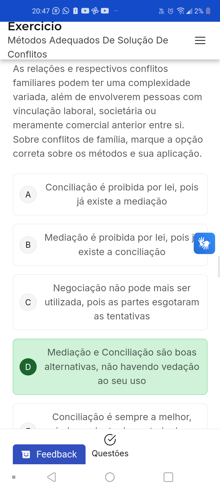 <p>20:47 B ! Vo LTE 2% ! Exercicio Métodos Adequados De Solução De Conflitos As relações e respectivos conflitos familiares podem ter uma complexidade variada, além de envolverem pessoas com vinculação laboral, societária ou meramente comercial anterior entre si. Sobre conflitos de família, marque a opção correta sobre os métodos e sua aplicação. Conciliação é proibida por lei, pois A já existe a mediação Mediação é proibida por lei, pois B existe a conciliação Negociação não pode mais ser C utilizada, pois as partes esgotaram as tentativas Mediação e Conciliação são boas D alternativas, não havendo vedação ao seu uso Conciliação é sempre a melhor, . Feedback Questões</p>