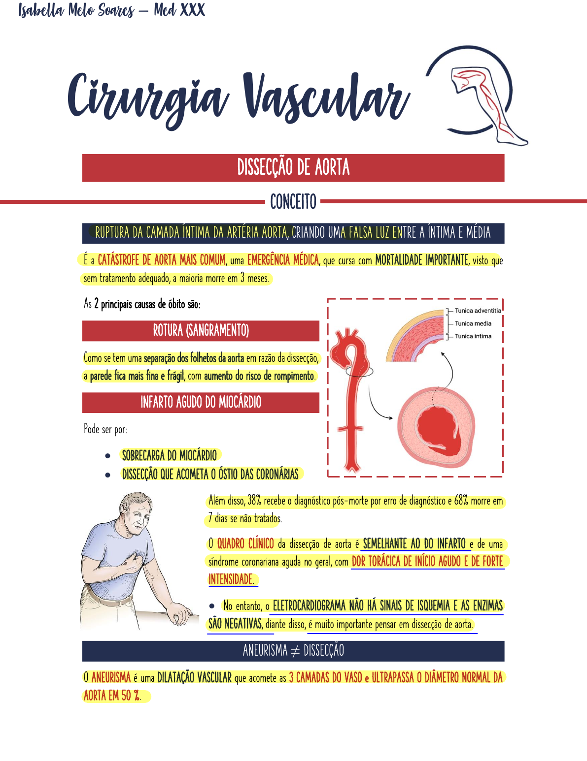 <p>Isabella Melo Soares – Med XXX</p><p>DISSECÇÃO DE AORTA</p><p>CONCEITO</p><p>RUPTURA DA CAMADA ÍNTIMA DA ARTÉRIA AORTA, CRIANDO UMA FALSA LUZ ENTRE A ÍNTIMA E MÉDIA</p><p>É a CATÁSTROFE DE AORTA MAIS COMUM, uma EMERGÊNCIA MÉDICA, que cursa com MORTALIDADE IMPORTANTE, visto que</p><p>sem tratamento adequado, a maioria morre em 3 meses.</p><p>As 2 principais causas de óbito são:</p><p>ROTURA (SANGRAMENTO)</p><p>Como se tem uma separação dos folhetos da aorta em razão da dissecção,</p><p>a parede fica mais fina e frágil, com aumento do risco de rompimento.</p><p>INFARTO AGUDO DO MIOCÁRDIO</p><p>Pode ser por:</p><p>x SOBRECARGA DO MIOCÁRDIO</p><p>x DISSECÇÃO QUE ACOMETA O ÓSTIO DAS CORONÁRIAS</p><p>Além disso, 38% recebe o diagnóstico pós-morte por erro de diagnóstico e 68% morre em</p><p>7 dias se não tratados.</p><p>O QUADRO CLÍNICO da dissecção de aorta é SEMELHANTE AO DO INFARTO e de uma</p><p>síndrome coronariana aguda no geral, com DOR TORÁCICA DE INÍCIO AGUDO E DE FORTE</p><p>INTENSIDADE.</p><p>x No entanto, o ELETROCARDIOGRAMA NÃO HÁ SINAIS DE ISQUEMIA E AS ENZIMAS</p><p>SÃO NEGATIVAS, diante disso, é muito importante pensar em dissecção de aorta.</p><p>ANEURISMA � DISSECÇÃO</p><p>O ANEURISMA é uma DILATAÇÃO VASCULAR que acomete as 3 CAMADAS DO VASO e ULTRAPASSA O DIÂMETRO NORMAL DA</p><p>AORTA EM 50 %.</p><p>Cirurgia Vascular</p><p>Isabella Melo Soares – Med XXX</p><p>A DISSECÇÃO é uma emergência médica caracterizada pela SEPARAÇÃO DOS FOLHETOS, separando a camada média e interna da</p><p>média e externa, criando DUAS LUZES e um SEPTO (FLAP).</p><p>x LUZ VERDADEIRA</p><p>Ö É o lúmen vascular que existia anteriormente.</p><p>x LUZ FALSA</p><p>Ö Criada pela separação de folhetos.</p><p>Ö Mais fina, mais frágil e tem maior risco de sangramento.</p><p>Por isso, não se utiliza o termo “aneurisma dissecante”, pois para ser considerado um aneurisma é preciso que haja envolvimento</p><p>das três camadas da artéria e a dissecção separa essas camadas.</p><p>VARIANTES PATOLÓGICAS</p><p>Existem DUAS variantes patológicas da dissecção de aorta.</p><p>HEMATOMA INTRAMURAL</p><p>Ocorre RUPTURA DOS VASA VASORUM da aorta com HEMORRAGIA NA PAREDE DA</p><p>AORTA.</p><p>x Ocorre na AORTA DESCENDENTE.</p><p>ÚLCERA ATEROSCLERÓTICA PENETRANTE</p><p>Ocorre EROSÃO DE UMA PLACA EM DIREÇÃO À TÚNICA MÉDIA da artéria, provocando</p><p>HEMATOMA DESSA CAMADA.</p><p>CLASSIFICAÇÃO</p><p>PODEM SER CLASSIFICADOS EM RELAÇÃO AO TEMPO E EM RELAÇÃO À ANATOMIA</p><p>Classificação Temporal</p><p>Aguda</p><p>Quando o período de início da dor for MENOR OU IGUAL A 14 DIAS.</p><p>x Responsável por 74% dos óbitos.</p><p>Crônica</p><p>Quando o primeiro sintoma ocorreu HÁ MAIS DE 14 DIAS.</p><p>-</p><p>-</p><p>ok !</p><p>Isabella Melo Soares – Med XXX</p><p>Classificação Anatômica de Stanford</p><p>Tipo A</p><p>Ocorre ACOMETIMENTO DO ARCO ASCENDENTE.</p><p>x Nesse caso, é MANDATÓRIO REALIZAR INTERVENÇÃO CIRÚRGICA.</p><p>Tipo B</p><p>O acometimento NÃO ENVOLVE O ARCO ASCENDENTE.</p><p>x É da ARTÉRIA SUBCLÁVIA ESQUERDA PARA BAIXO, é acometimento de</p><p>DESCENDENTE OU RAMOS.</p><p>Classificação Anatômica de DeBakey</p><p>Tipo I; II e III</p><p>x TIPO I</p><p>Ö Dissecção de aorta ascendente, arco aórtico e aorta descendente.</p><p>x TIPO II</p><p>Ö Dissecção de aorta ascendente.</p><p>x TIPO III</p><p>Ö Dissecção de aorta descendente.</p><p>o IIIA – restrita a aorta descendente</p><p>torácica</p><p>o IIIB – aorta descendente torácica e</p><p>aorta abdominal</p><p>EPIDEMIOLOGIA</p><p>3 MIL CASOS PARA CADA 100 MIL PESSOAS POR ANO</p><p>É mais comum em HOMENS (4:1) e a principal comorbidade associada é a HIPERTENSÃO, então, é mais comum que ocorra em</p><p>um PICO PRESSÓRICO (70%).</p><p>60% dos casos são TIPO A</p><p>x TIPO A</p><p>Ö Pico entre 50 e 60 anos.</p><p>x TIPO B</p><p>Ö Pico entre 60 e 70 anos.</p><p>L</p><p>-</p><p>Isabella Melo Soares – Med XXX</p><p>FATORES DE RISCO</p><p>CONDIÇÕES CARDIOVASCULARES</p><p>x ALTERAÇÃO DA PAREDE AÓRTICA</p><p>x COARCTAÇÃO</p><p>Ö Estreitamento do lúmen da aorta.</p><p>x VÁLVULA BICÚSPIDE</p><p>Ö A válvula aórtica, que separa o ventrículo esquerdo da aorta normalmente é</p><p>tricúspide, os pacientes que possuem a anatomia bicúspide têm mais risco de sofrer</p><p>dissecção.</p><p>x SD. DE TURNER; MARFAN; EHLERS-DANLOS</p><p>Ö São as doenças do tecido conjuntivo.</p><p>o Marfan é a principal causa de dissecção de aorta em pacientes com menos</p><p>de 40 anos.</p><p>GRAVIDEZ</p><p>Há uma grande relação de dissecção de aorta com eclâmpsia, então, DISSECÇÃO DE AORTA em MULHERES JOVENS, geralmente,</p><p>ocorre em GRAVIDEZ COMPLICADA POR ECLÂMPSIA ou PRÉ-ECLÂMPSIA.</p><p>x MULHERES COM MENOS DE 40 ANOS</p><p>x PRÊ-ECLÂMPSIA</p><p>USO DE COCAÍNA</p><p>Em razão dos PICOS HIPERTENSIVOS causados pela LIBERAÇÃO ADRENÉRGICA.</p><p>x Além disso, a cocaína estimula VASOCONSTRICÇÃO e isso faz com que haja ISQUEMIA DA PAREDE.</p><p>FISIOPATOLOGIA</p><p>O EVENTO PRIMÁRIO É O SURGIMENTO DE UM “RASGO” TRANSVERSO NA ÍNTIMA DA AORTA</p><p>A degeneração da túnica média, conhecida como NECROSE CÍSTICA DA MÉDIA, é um PRÉ-</p><p>REQUISITO que está presente em TODOS os casos de dissecção não traumática do vaso.</p><p>x E o SANGUE, impulsionado pela contratilidade miocárdica, PENETRA PARA A TÚNICA</p><p>MÉDIA através desse rasgo, promovendo uma FENDA LONGITUDINAL nessa camada.</p><p>O resultado disso é a formação de um FALSO LÚMEN, ou seja, o SANGUE A CADA SÍSTOLE</p><p>VENTRICULAR CORRE POR ESSA FENDA da túnica média e o comprometimento dessa camada pode</p><p>levar ao ENFRAQUECIMENTO DA PAREDE DA AORTA, que pode dilatar, causando um ANEURISMA.</p><p>* importante</p><p>Isabella Melo Soares – Med XXX</p><p>Quando o RASGO OCORRE PARA BAIXO, ou seja, A FAVOR DO FLUXO (anterogradament