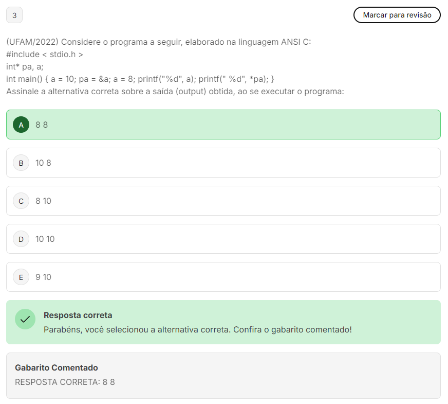 <p>3 Marcar para revisão (UFAM/2022) Considere programa a seguir, elaborado na linguagem ANSI C: #include int* pa, a; int main() = &a; a=8; printf("%d", a); printf(" %d", *pa); } Assinale a alternativa correta sobre a saída (output) obtida, ao se executar programa: A 88 B 10 8 C 8 10 D 10 10 E 9 10 Resposta correta você selecionou a alternativa correta. Confira gabarito comentado! Gabarito Comentado RESPOSTA CORRETA: 88</p>