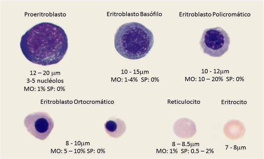 <p>Proeritroblasto Eritroblasto Basófilo Eritroblasto Policromático 12 - 20 um 10 - 15um 10 12um 3-5 nucléolos MO: 1-4% SP: 0% MO: 10 - 20% SP: 0% MO: 1% SP: 0% Eritroblasto Ortocromático Reticulocito Eritrocito 8 10um 8-8.5um MO: 5 - 10% SP: 0% MO: 1% SP: - 2% 7 8um</p>