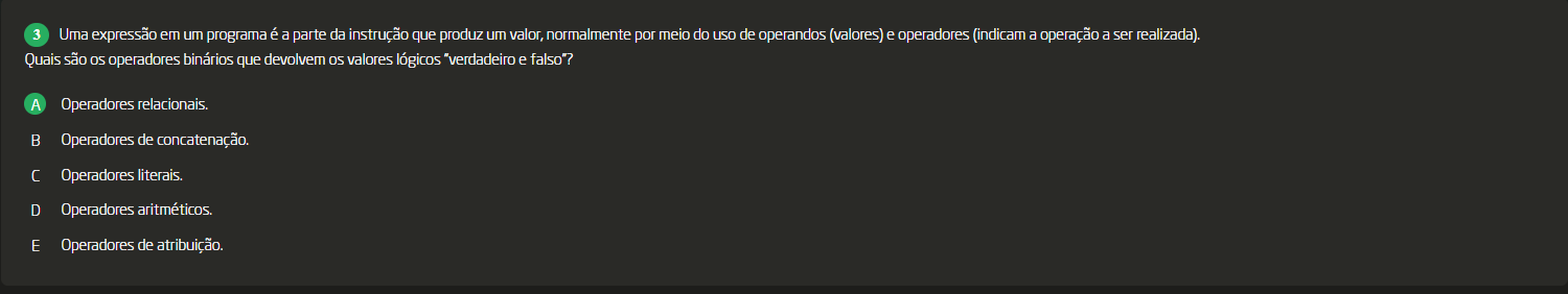 <p>3 Uma expressão em um programa é a parte da instrução que produz um valor, normalmente por meio do USO de operandos (valores) e operadores (indicam a operação a ser realizada). Quais são os operadores binários que devolvem valores lógicos "verdadeiro e A Operadores relacionais. B Operadores de concatenação. C Operadores literais. D Operadores aritméticos E Operadores de atribuição.</p>