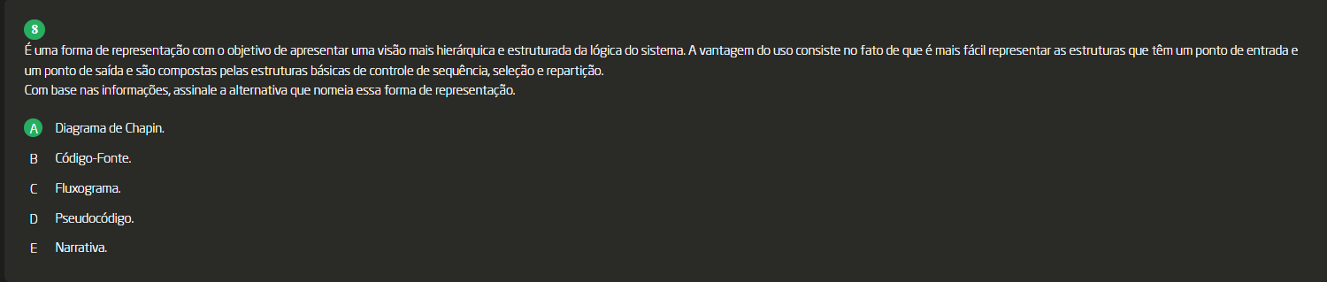 <p>8 É uma forma de representação com objetivo de apresentar uma visão mais hierárquica e estruturada da lógica do sistema. A vantagem do USO consiste no fato de que é mais fácil representar as estruturas que têm um ponto de entrada e um ponto de saída e são compostas pelas estruturas básicas de controle de seleção e repartição. Com base nas informações, assinale a alternativa que nomeia essa forma de representação. A Diagrama de Chapin. B Código-Fonte C Fluxograma. D Pseudocódigo. E</p>