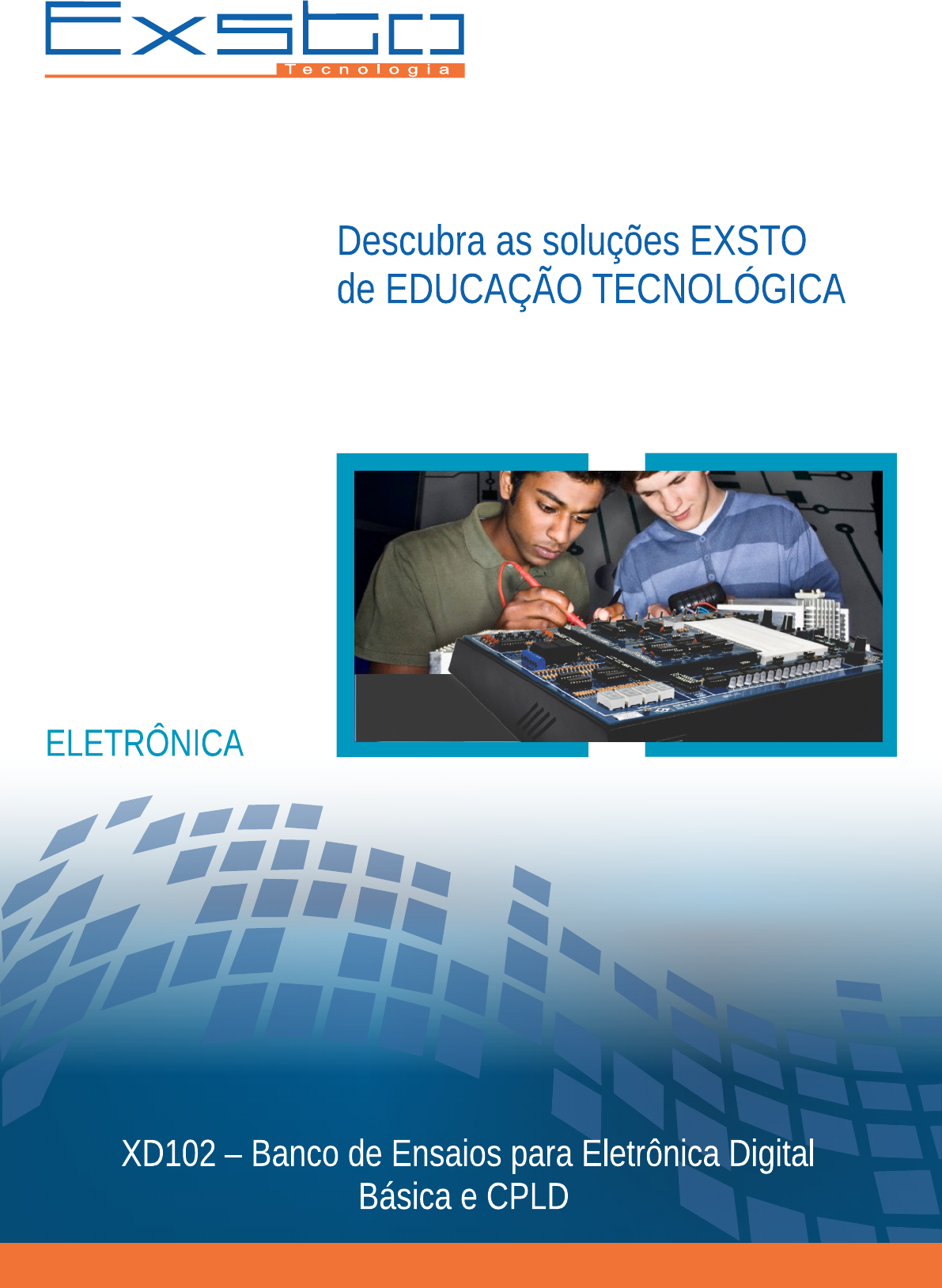 <p>Tecnologia Descubra as soluções EXSTO de EDUCAÇÃO TECNOLÓGICA ELETRÔNICA XD102 - Banco de Ensaios para Eletrônica Digital Básica e CPLD</p><p>A EXSTO Tecnologia Instalada em Santa Rita do Sapucaí, o Vale da Eletrônica, região reconhecida pela constante evolução tecnológica e de grande sucesso empreendedor, a EXSTO TECNOLOGIA foi fundada em 11/06/2001, para atender as necessidades de equipamentos voltados para o ramo de didática tecnológica focada no desenvolvimento de soluções que possam agregar maior qualidade no ensino de novas tecnologias em instituições nacionais e internacionais. A empresa hoje conta com uma equipe altamente capacitada e é reconhecida pelos seguintes diferenciais: - Produto de qualidade e alta tecnologia; - Bom atendimento; - Assistência técnica especializada; - Suporte ao cliente através de email, telefone e skype; - Diferentes formas de parcelamento das compras para maior comodidade; - Acompanhamento da satisfação de seus clientes através de Pós-Vendas. Conte com a Exsto Tecnologia como seu parceiro no mundo digital. Tecnologia</p><p>DESCRIÇÃO XD 102 - Banco de Ensaios para Eletrônica Digital Básica e CPLD As tecnologias digitais hoje estão presentes em todas as áreas da eletrônica e da atuação humana. Muitos dos equipamentos tradicionalmente analógicos têm sido substituídos por dispositivos digitais, trazendo grandes vantagens. o conhecimento dos princípios dessas técnicas digitais é de fundamental importância para que o estudante possa compreender os equipamentos que encontrará em sua atividade profissional. Por esse motivo, o estudo da eletrônica digital é assunto obrigatório nos cursos de eletrônica, automação, informática e telecomunicações. o kit XD102 traz em sua placa base recursos que permitem realizar diversas experiências em eletrônica digital e dispositivos lógicos programáveis. A proposta desse kit é que as experiências sejam montadas em matriz de contatos (protoboard) e conectados aos recursos de estímulos e análise da placa base. Acompanha o kit um conjunto de componentes para o desenvolvimento de todas as experiências propostas. Um módulo contendo um CPLD e recursos de aplicação permite ir além dos circuitos baseados em componentes discretos e explorar os conceitos de lógica programável e linguagem VHDL. Tecnologia</p><p>CARACTERÍSTICAS XD 102 Banco de Ensaios para Eletrônica Digital Básica e CPLD o XD102 é provido de uma grande área de montagem (2 matrizes de contatos de 550 pontos cada uma) que permitem a construção das experiências às mais complexas. Os recursos do kit incluem chaves geradoras de níveis lógicos pulsativas e retentivas, geradores de sinais, LEDs para monitoramento dos estados das saídas, displays de LED de sete segmentos, e relés para acionamento de cargas externas. o kit é alojado em um robusto bastidor de aço e possui fontes protegidas contra curto e sobrecorrente. Foi equipado com um módulo CPLD, isto é, um dispositivo lógico programável. Esses componentes são a nova geração de circuitos lógicos, que permitem a implementação em hardware dos projetos de usuários, pela reconfiguração dos seus circuitos internos. o kit é acompanhado por um gravador USB e os terminais do CPLD são acessíveis para conexão a todos os recursos do kit. Além, o CPLD pode interagir com o circuito montado em matriz de contato; pode ser programado tanto com esquemáticos como através da linguagem VHDL, e o software para desenvolvimento dos projetos é fornecido junto ao produto. o detector de nível lógico é composto por uma ponta de prova capaz de analisar o sinal dos pontos de vista TTL e CMOS. Sob o padrão TTL, o detector possui um display de LEDs que indica nível lógico baixo ("L"), nível lógico alto ("H"), aberto ") e pulsante ("P"), isto é, quando o sinal varia com uma frequência acima de 10Hz. Sob o padrão CMOS, dois LEDs indicadores de nível lógico alto e baixo são acionados conforme a histerese típica de entrada schmitt trigger comum nesse padrão de componentes. o detector é implementado através de microcontrolador. o conjunto de componentes que acompanha o kit permite tratar assuntos desde os fundamentos de portas lógicas, passando por circuitos combinacionais, aritméticos e sequenciais, chegando a conversor A/D e memórias. o material didático do kit trata desde os conceitos fundamentais, como sistema de numeração e álgebra de boole, até tópicos como memórias e conversores A/D e D/A. São abordados os aspectos teóricos e práticos de cada assunto. O conteúdo específico de CPLD apresenta as ferramentas de desenvolvimento, o ciclo de projeto e os fundamentos desses componentes, abordando sua programação por circuitos esquemáticos e por linguagem VHDL. wwwww.exsto.com.br Tecnologia</p><p>MATERIAL DIDÁTICO XD 102 - Banco de Ensaios para Eletrônica Digital Básica e CPLD Conteúdo teórico Eletrônica Digital 1. Introdução à eletrônica digital - Diferenciações entre analógico e digital - Vantagens da eletrônica digital 2. Sistemas de numeração e conversões - Sistema de numeração decimal - Sistema de numeração binária - Sistema de numeração hexadecimal 3. Álgebra de Boole - Introdução - Níveis lógicos - Elementos lógicos básicos - Propriedades das operações lógicas - Mapa de Karnaugh - Conclusão 4. Família de circuitos lógicos digitais - Família RTL e DTL - Família TTL - Família CMOS - Interfaceamento entre as famílias TTL e CMOS 5. Circuitos lógicos combinatórios - Passos para montagem de um circuito combinacional 6. Multiplexadores e codificadores - Codificadores/Decodificadores - Multiplexadores/Demultiplexadores 7. Circuitos Aritméticos 8. Circuitos Seqüenciais - Flip-flop's 9. Contadores 10. Registradores de deslocamento 11. Conversores Analógico/Digital e Digital/Analógico - Conversor D/A - Conversor A/D 12. Buffer's latch's e barramentos 13. Memórias wwww.exsto.com.