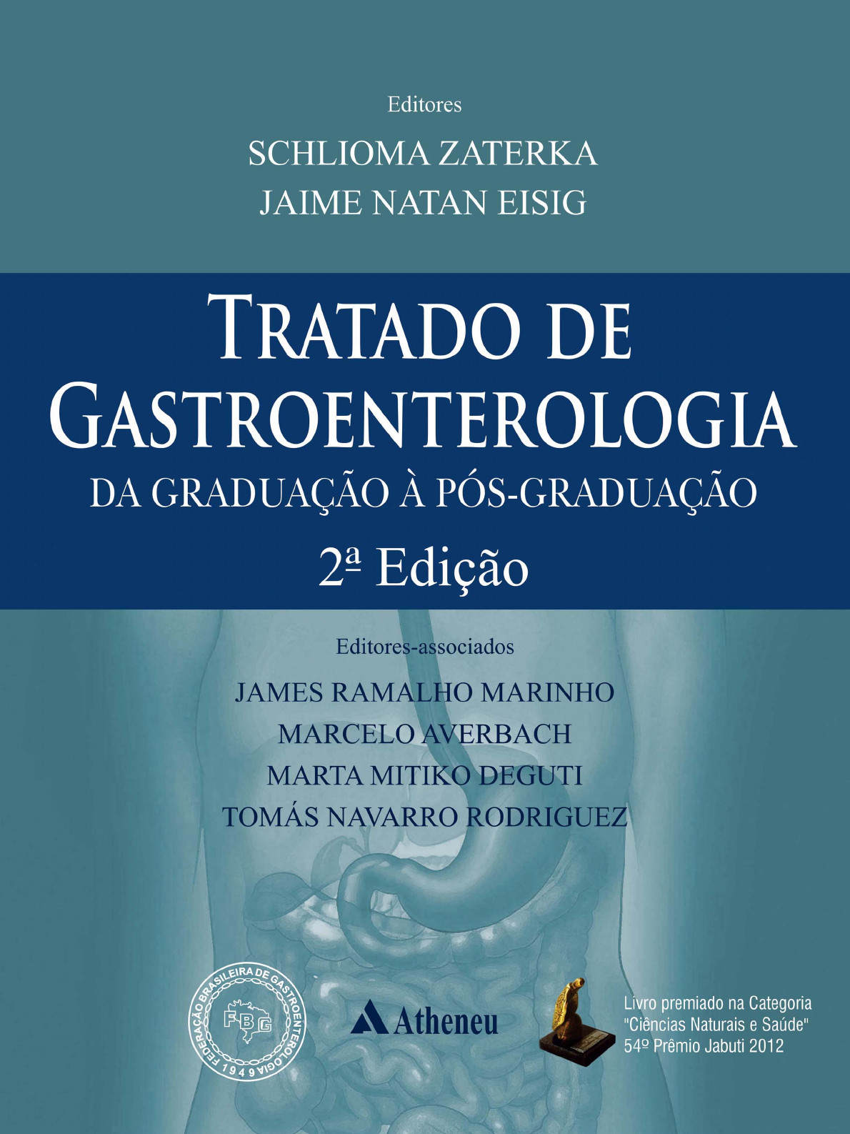 <p>Tratado de</p><p>Gastroenterologia</p><p>da Graduação à Pós-graduação</p><p>2a Edição</p><p>Presidente</p><p>Maria do Carmo Friche Passos (MG)</p><p>Vice-presidente</p><p>James Ramalho Marinho (AL)</p><p>Secretário-geral</p><p>Ricardo Correa Barbuti (SP)</p><p>1a Secretária</p><p>Eponina Maria de Oliveira Lemme (RJ)</p><p>Diretor Financeiro</p><p>Celso Mirra de Paula e Silva (MG)</p><p>Coordenadora do FAPEGE</p><p>Luciana Dias Moretzsohn (MG)</p><p>Presidente Eleito</p><p>Gestão 2017-2018</p><p>Flávio Antonio Quilici (SP)</p><p>DIRETORIA FBG</p><p>GESTÃO 2015-2016</p><p>Editores-associados</p><p>JamEs Ramalho maRinho</p><p>maRcElo avERbach</p><p>maRTa miTiko DEGuTi</p><p>Tomás navaRRo RoDRiGuEz</p><p>Editores</p><p>schlioma zaTERka</p><p>JaimE naTan EisiG</p><p>Tratado de</p><p>Gastroenterologia</p><p>da Graduação à Pós-graduação</p><p>2a Edição</p><p>creo</p><p>EDITORA ATHENEU</p><p>São Paulo — Rua Jesuíno Pascoal, 30</p><p>Tel.: (11) 2858-8750</p><p>Fax: (11) 2858-8766</p><p>E-mail: atheneu@atheneu.com.br</p><p>Rio de Janeiro — Rua Bambina, 74</p><p>Tel.: (21) 3094-1295</p><p>Fax.: (21) 3094-1284</p><p>E-mail: atheneu@atheneu.com.br</p><p>Belo Horizonte — Rua Domingos Vieira, 319 – conj. 1.104</p><p>PRODUÇÃO EDITORIAL: Angélica Cunha</p><p>CAPA: Paulo Verardo</p><p>PREPARAÇÃO DE TEXTO: Renata Truyts/Marina Takeda</p><p>REVISÃO: Rafael Faber</p><p>DIAGRAMAÇÃO: Dirceu Ferri</p><p>Tratado de gastroenterologia : da graduação à</p><p>pós-graduação / editores Schlioma Zaterka, Jaime</p><p>Natan Eisig. -- 2. ed. -- São Paulo : Editora</p><p>Atheneu, 2016.</p><p>Vários autores</p><p>Bibliografia</p><p>ISBN 978-85-388-0716-2</p><p>1. Gastroenterologia - Diagnóstico</p><p>2. Gastroenterologia - Tratamento I. Zaterka,</p><p>Schlioma. II. Eisig, Jaime Natan.</p><p>CDD-616.33</p><p>16-04338 NLM-WI 141</p><p>© Direitos reservados à EDITORA ATHENEU – São Paulo, Rio de Janeiro, Belo Horizonte, 2016</p><p>Índice para catálogo sistemático:</p><p>1. Gastroenterologia : Diagnóstico e tratamento : Medicina 616.33</p><p>Dados Internacionais de Catalogação na Publicação (CIP)</p><p>(Câmara Brasileira do Livro, SP, Brasil)</p><p>SECRETARIA-EXECUTIVA DA FBG</p><p>End.: Brigadeiro Faria Lima, 2.391 – 10o andar</p><p>01452-001 – São Paulo, SP – Brasil</p><p>Tel./Fax: (55) (11) 3813-1610 – 3813-1690</p><p>E-mail: fbg@fbg.org.br</p><p>Site: www.fbg.org.br</p><p>EQUIPE ADMINISTRATIVA</p><p>Jaider Henrique Silva – Gerente</p><p>Fátima Lombadi – Coordenadora de Comunicação e Marketing</p><p>Martha Sylvio – Coordenadora Administrativa e Financeira</p><p>Denise Gimenez – Analista de Eventos</p><p>Nívea Dolores Campos – Assistente Administrativa</p><p>Neusa Rodrigues - Auxiliar Administrativa</p><p>Esta edição do Tratado de Gastroenterologia:</p><p>da Graduação à Pós-graduação é uma</p><p>homenagem ao Professor Doutor Jaime Natan</p><p>Eisig, incansável colaborador da Federação</p><p>Brasileira de Gastroenterologia e mestre de</p><p>todos nós.</p><p>EDITORES</p><p>Schlioma Zaterka</p><p>Professor Doutor de Gastroenterologia pela Faculdade de Medicina da Universidade de São Paulo</p><p>(FMUSP). Ex-chefe do Grupo de Estômago e Duodeno e do Laboratório de Provas Funcionais do</p><p>Departamento de Gastroenterologia do Hospital das Clínicas da FMUSP. Ex-professor Convidado do</p><p>Gastrocentro da Universidade Estadual de Campinas (Unicamp). Ex-fellow do Veterans Administration</p><p>Center de Los Angeles, California. Presidente Honorário do Núcleo Brasileiro para o Estudo do</p><p>Helicobacter pylori e Microbiota.</p><p>Jaime Natan Eisig (in memoriam)</p><p>Mestre e Doutor em Gastroenterologia pela Faculdade de Medicina da Universidade de São Paulo</p><p>(FMUSP). Médico-assistente da Disciplina de Gastroenterologia Clínica do Departamento de</p><p>Gastroenterologia do Hospital das Clínicas da FMUSP. Ex-presidente da Federação Brasileira</p><p>de Gastroenterologia (FBG) (2008-2010).</p><p>EDITORES-ASSOCIADOS</p><p>James Ramalho Marinho</p><p>Professor-adjunto e Coordenador da Disciplina de Doenças Infecciosas e Parasitárias da Universidade</p><p>Estadual de Ciências da Saúde de Alagoas (UNCISAL). Sócio Titular da Federação Brasileira de</p><p>Gastroenterologia (FBG). Sócio Titular da Sociedade Brasileira de Hepatologia (SBH). Vice-presidente</p><p>da FBG, biênio 2014-2016.</p><p>Marcelo Averbach</p><p>Doutor em Cirurgia pela Faculdade de Medicina da Universidade de São Paulo (FMUSP). Cirurgião e</p><p>Colonoscopista do Hospital Sírio-Libanês, São Paulo-SP.</p><p>Marta Mitiko Deguti</p><p>Título de Gastroenterologista pela Federação Brasileira de Gastroenterologia (FBG). Título de</p><p>Hepatologista pela Sociedade Brasileira de Hepatologia (SBH). Mestre em Medicina pela Faculdade</p><p>de Medicina da Universidade de São Paulo (FMUSP). Doutora em Ciências pela FMUSP.</p><p>Tomás Navarro Rodriguez</p><p>Livre-docente em Gastroenterologia pela Faculdade de Medicina da Universidade de São Paulo (FMUSP).</p><p>AUTORES</p><p>Adérson Omar Mourão Cintra Damião</p><p>Professor-assistente Doutor do Departamento de Gastroenterologia da Faculdade de Medicina da</p><p>Universidade de São Paulo (FMUSP). Membro do Grupo de Doenças Intestinais e do Laboratório</p><p>de Pesquisa em Gastroenterologia (LIM-07) da Divisão de Gastroenterologia e Hepatologia do</p><p>Hospital das Clínicas da FMUSP. Membro Titular da Federação Brasileira de Gastroenterologia (FBG).</p><p>Presidente do Grupo de Estudos da Doença Inflamatória Intestinal do Brasil (GEDIIB).</p><p>Adriana Nogueira da Silva Catapani</p><p>Mestre em Gastroenterologia Pediátrica pela Universidade Federal de São Paulo (Unifesp). Membro</p><p>Titular do Grupo de Estudos da Doença Inflamatória Intestinal no Brasil (GEDIIB). Gastropediatra da</p><p>Fundação ABC.</p><p>Adriana Vaz Safatle-Ribeiro</p><p>Professora Livre-docente em Cirurgia d