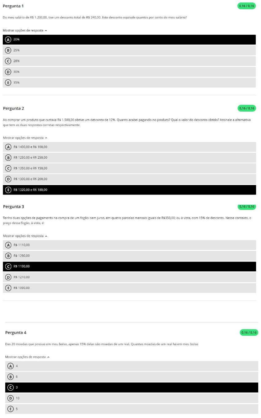 <p>Pergunta 1 0,16/0,16 Do meu salário de R$ 1.200,00, tive um desconto total de R$ 240,00. Este desconto equivale quantos por cento do meu Mostrar opções de resposta A 20% B 25% C 28% D 30% E 35% Pergunta 2 0,16/0,16 Ao comprar um produto que custava R$ 1.500,00 obtive um desconto de Quanto acabei pagando no produto? Qual o valor do desconto obtido? Assinale a alternativa que tem as duas respostas corretas respectivamente. Mostrar opções de resposta A R$ 1400,00 e R$ 100,00 B R$ 1250,00 e R$ 250,00 R$ 1350,00 e R$ 150,00 D R$ 1300,00 e R$ 200,00 E R$ 1320.00 e R$ 180,00 Pergunta 3 Tenho duas opções de pagamento na compra de um fogão: sem juros, em quatro parcelas mensais iguais de R$350,00; ou à vista, com 15% de desconto. Nesse contexto, preço desse fogão, à vista, é: Mostrar opções de resposta A R$ 1110,00 B R$ 1290,00 R$ 1190,00 D R$ 1210,00 E R$ 1090,00 Pergunta 4 0,16/0,16 Das 20 moedas que possuo em meu bolso, apenas 15% delas são moedas de um real. Quantas moedas de um real há em meu bolso Mostrar opções de resposta A 4 B 6 3 D 10 E 5</p>