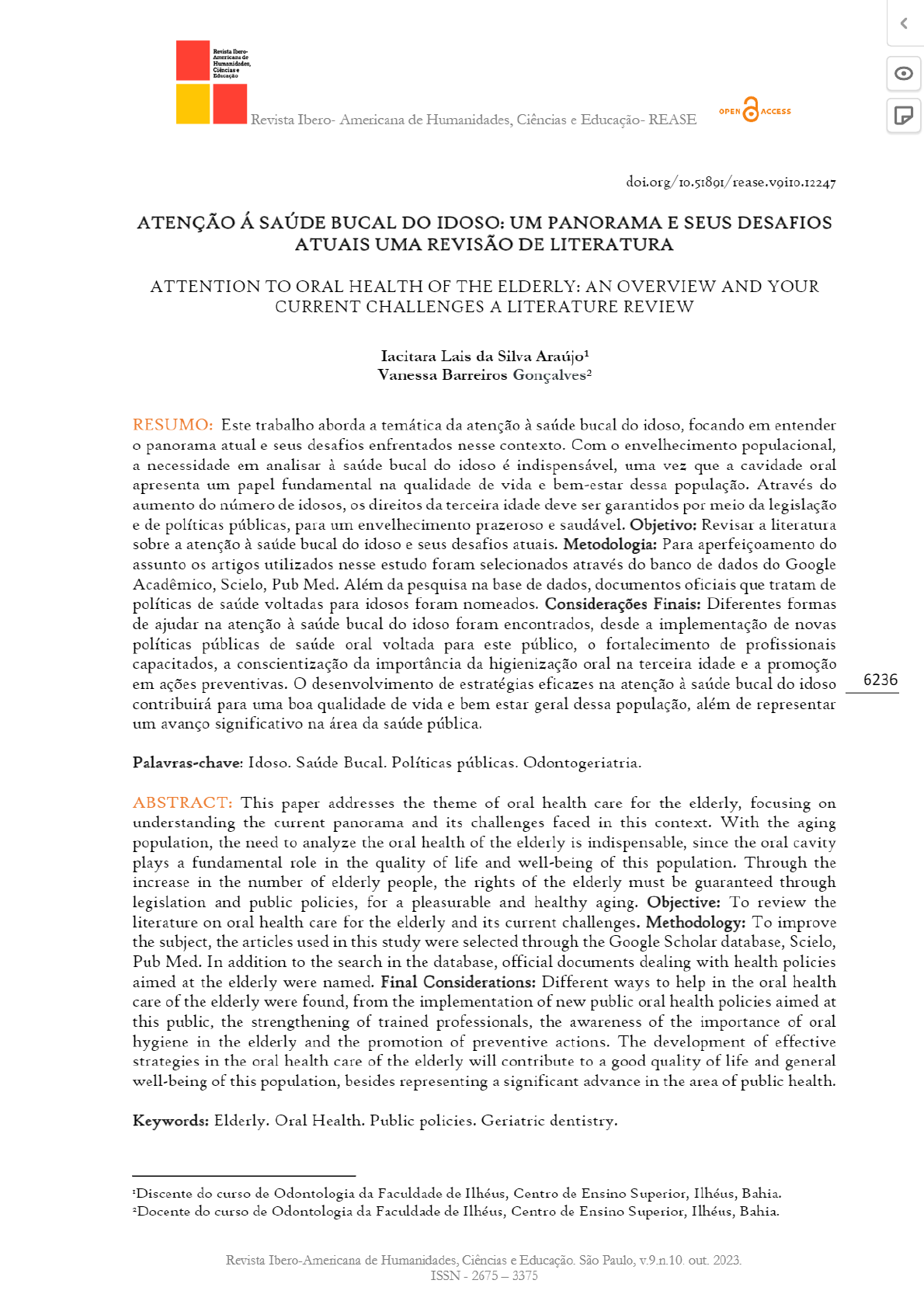 <p>Revista Americanade Ciênciase Educação OPEN ACCESS Revista Ibero- Americana de Humanidades, Ciências e Educação- REASE doi.org/10.51891/rease.v9i10.12247 ATENÇÃO SAÚDE BUCAL DO IDOSO: UM PANORAMA E SEUS DESAFIOS ATUAIS UMA REVISÃO DE LITERATURA ATTENTION TO ORAL HEALTH OF THE ELDERLY: AN OVERVIEW AND YOUR CURRENT CHALLENGES A LITERATURE REVIEW Iacitara Lais da Silva Vanessa Barreiros RESUMO: Este trabalho aborda a temática da atenção à saúde bucal do idoso, focando em entender o panorama atual e seus desafios enfrentados nesse contexto. Com o envelhecimento populacional, a necessidade em analisar à saúde bucal do idoso é indispensável, uma vez que a cavidade oral apresenta um papel fundamental na qualidade de vida e bem-estar dessa população. Através do aumento do número de idosos, os direitos da terceira idade deve ser garantidos por meio da legislação e de políticas públicas, para um envelhecimento prazeroso e saudável. Objetivo: Revisar a literatura sobre a atenção à saúde bucal do idoso e seus desafios atuais. Metodologia: Para aperfeiçoamento do assunto os artigos utilizados nesse estudo foram selecionados através do banco de dados do Google Acadêmico, Scielo, Pub Med. Além da pesquisa na base de dados, documentos oficiais que tratam de políticas de saúde voltadas para idosos foram nomeados. Considerações Finais: Diferentes formas de ajudar na atenção à saúde bucal do idoso foram encontrados, desde a implementação de novas políticas públicas de saúde oral voltada para este público, o fortalecimento de profissionais capacitados, a conscientização da importância da higienização oral na terceira idade e a promoção em ações preventivas. O desenvolvimento de estratégias eficazes na atenção à saúde bucal do idoso 6236 contribuirá para uma boa qualidade de vida e bem estar geral dessa população, além de representar um avanço significativo na área da saúde pública. Palavras-chave: Idoso. Saúde Bucal. Políticas públicas. Odontogeriatria. ABSTRACT: This paper addresses the theme of oral health care for the elderly, focusing on understanding the current panorama and its challenges faced in this context. With the aging population, the need to analyze the oral health of the elderly is indispensable, since the oral cavity plays a fundamental role in the quality of life and well-being of this population. Through the increase in the number of elderly people, the rights of the elderly must be guaranteed through legislation and public policies, for a pleasurable and healthy aging. Objective: To review the literature on oral health care for the elderly and its current challenges. Methodology: To improve the subject, the articles used in this study were selected through the Google Scholar database, Scielo, Pub Med. In addition to the search in the database, official documents dealing with health policies aimed at the elderly were named. Final Considerations: Different ways to help in the oral health care of the elderly were found, from the implementation of new public oral health policies aimed at this public, the strengthening of trained professionals, the awareness of the importance of oral hygiene in the elderly and the promotion of preventive actions. The development of effective strategies in the oral health care of the elderly will contribute to a good quality of life and general well-being of this population, besides representing a significant advance in the area of public health. Keywords: Elderly. Oral Health. Public policies. Geriatric dentistry. do curso de Odontologia da Faculdade de Ilhéus, Centro de Ensino Superior, Ilhéus, Bahia. do curso de Odontologia da Faculdade de Ilhéus, Centro de Ensino Superior, Ilhéus, Bahia. Revista Ibero-Americana de Humanidades, Ciências e Educação. São Paulo, v.9.n.10. 2023. ISSN 2675 3375</p><p>Revista Educação OPEN ACCESS Revista Ibero- Americana de Humanidades, Ciências e Educação- REASE A atenção à saúde bucal do idoso é uma questão de extrema importância no contexto atual da saúde pública. Com o envelhecimento da população, é essencial compreender e abordar as necessidades específicas dos idosos no que diz respeito à saúde oral. De acordo com estudos recentes, a saúde bucal precária em idosos está associada a vários problemas de saúde incluindo hipertensão, doenças cardiovasculares, diabetes, reumatismo, osteoporose, colesterol alto entre outras. Diante disso, o desenvolvimento de estratégias eficazes é fundamental para promoção da saúde bucal, proporcionando melhorias na qualidade de vida e bem estar desses indivíduos (Macentee,1985). No entanto, a sociedade enfrenta diversos desafios na atenção à saúde bucal do idoso. Um dos principais é a falta de acesso a serviços odontológicos adequados, especialmente para os idosos que vivem em regiões remotas ou possuem baixa renda. Além disso, a falta de conhecimento e conscientização sobre a importância da saúde bucal na terceira idade é um significativo. Muitos idosos não recebem educação suficiente sobre a necessidade de cuidados bucais regulares e acabam negligenciando sua saúde oral. Além disso, condições médicas 6237 subjacentes, como doenças crônicas e limitações físicas, podem dificultar a higiene oral adequada, levando a um maior risco de doenças periodontais e perda dentária. Portanto, superar esses desafios requer uma abordagem abrangente, que envolva políticas públicas eficazes, investimentos em serviços odontológicos acessíveis e programas de conscientização direcionados aos idosos e seus cuidadores (Pucca Jr, 1996). Diante dos desafios mencionados, a relevância deste trabalho se destaca ao abordar a atenção à saúde bucal do idoso. Compreender e promover a saúde oral nessa fase da vida é crucial para o bem-estar dos idosos na saúde geral e qualidade de vida. Investir na saúde bucal dos idosos pode contribuir para a prevenção de doenças