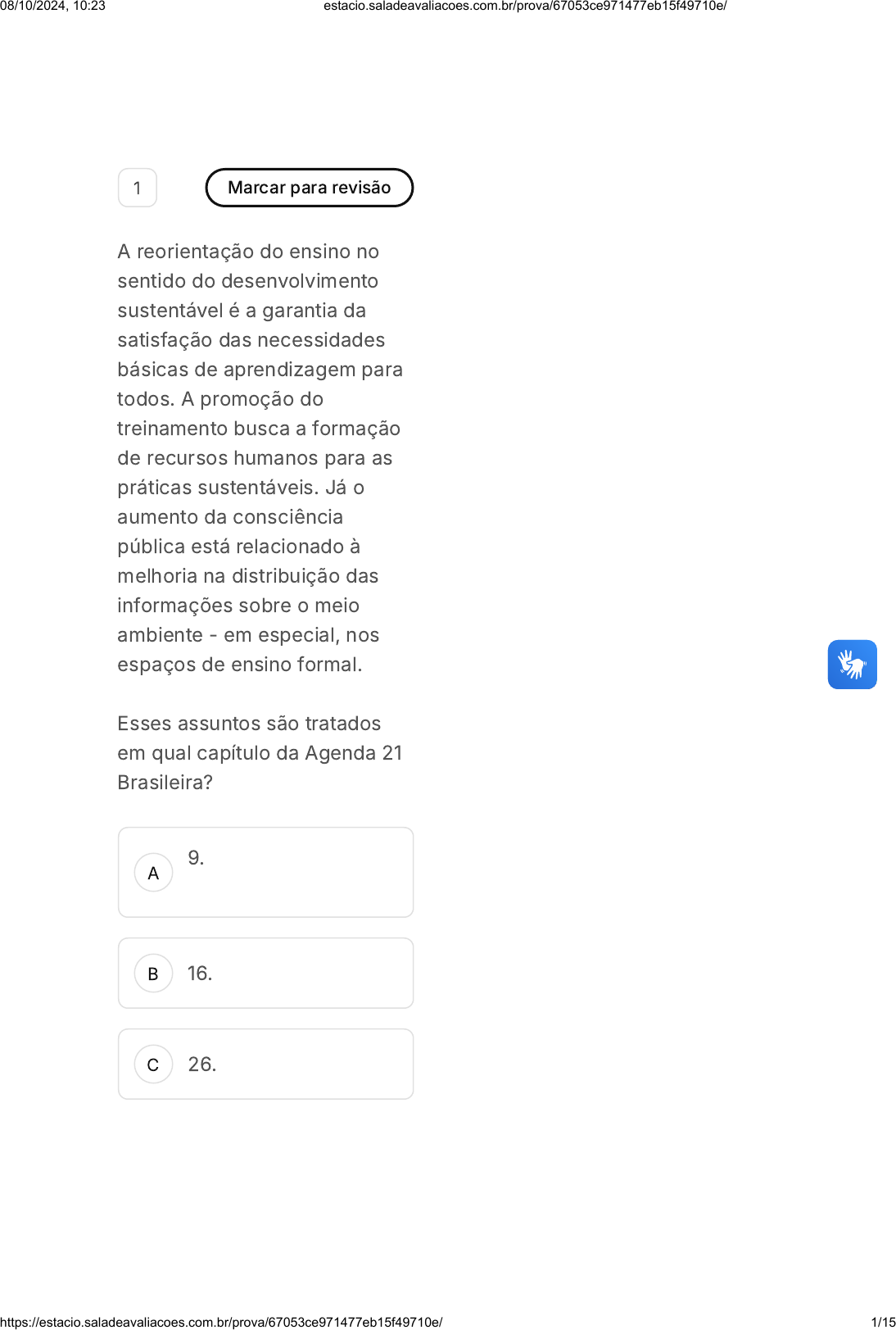 <p>A</p><p>B</p><p>C</p><p>1 Marcar para revisão</p><p>A reorientação do ensino no</p><p>sentido do desenvolvimento</p><p>sustentável é a garantia da</p><p>satisfação das necessidades</p><p>básicas de aprendizagem para</p><p>todos. A promoção do</p><p>treinamento busca a formação</p><p>de recursos humanos para as</p><p>práticas sustentáveis. Já o</p><p>aumento da consciência</p><p>pública está relacionado à</p><p>melhoria na distribuição das</p><p>informações sobre o meio</p><p>ambiente - em especial, nos</p><p>espaços de ensino formal.</p><p>Esses assuntos são tratados</p><p>em qual capítulo da Agenda 21</p><p>Brasileira?</p><p>9.</p><p>16.</p><p>26.</p><p>08/10/2024, 10:23 estacio.saladeavaliacoes.com.br/prova/67053ce971477eb15f49710e/</p><p>https://estacio.saladeavaliacoes.com.br/prova/67053ce971477eb15f49710e/ 1/15</p><p>D</p><p>E</p><p>A</p><p>B</p><p>C</p><p>36.</p><p>30.</p><p>2 Marcar para revisão</p><p>A seção III da Agenda 2021</p><p>trata do "fortalecimento do</p><p>papel dos grupos principais".</p><p>Ela tem o objetivo de envolver</p><p>grupos sociais nas tomadas de</p><p>decisão em que estejam</p><p>envolvidos interesses ou</p><p>políticas públicas.</p><p>Dentro dessa seção, são</p><p>considerados "grupos</p><p>principais" nas tomadas de</p><p>decisão:</p><p>As comunidades</p><p>tradicionais.</p><p>Os representantes</p><p>das indústrias e</p><p>comércio locais.</p><p>Os principais</p><p>representantes da</p><p>economia nacional.</p><p>08/10/2024, 10:23 estacio.saladeavaliacoes.com.br/prova/67053ce971477eb15f49710e/</p><p>https://estacio.saladeavaliacoes.com.br/prova/67053ce971477eb15f49710e/ 2/15</p><p>D</p><p>E</p><p>Os representantes</p><p>indígenas.</p><p>Representantes de</p><p>todas as camadas</p><p>sociais.</p><p>3 Marcar para revisão</p><p>¿O investimento em cidades</p><p>sustentáveis pode neutralizar</p><p>emissões de carbono. De</p><p>acordo com o estudo, um dos</p><p>primeiros passos é mudar a</p><p>matriz energética. Segundo os</p><p>dados apresentados, as</p><p>cidades consomem cerca de</p><p>78% das fontes primárias de</p><p>energia do planeta. Nos</p><p>Estados Unidos, 67,5% da</p><p>energia primária é</p><p>desperdiçada. Com a queima</p><p>de combustíveis fósseis, calor</p><p>é gerado durante o processo e</p><p>há demanda por consumo</p><p>adicional de energia para a</p><p>extração e o transporte dos</p><p>combustíveis. Com a transição</p><p>para energias renováveis como</p><p>fonte primária, há menos</p><p>desperdício ao longo do</p><p>processo. Em relação ao Brasil,</p><p>o relatório apontou que é</p><p>possível atingir benefícios</p><p>econômicos e ambientais até</p><p>2025 com mudanças nas</p><p>cidades. Há um potencial de</p><p>redução de 45 milhões de</p><p>08/10/2024, 10:23 estacio.saladeavaliacoes.com.br/prova/67053ce971477eb15f49710e/</p><p>https://estacio.saladeavaliacoes.com.br/prova/67053ce971477eb15f49710e/ 3/15</p><p>A</p><p>B</p><p>toneladas de CO2 em emissões</p><p>até 2025 com um ganho de 7%</p><p>na eficiência energética com</p><p>equipamentos mais modernos,</p><p>serviços públicos, mobilidade</p><p>elétrica e geração distribuída.¿</p><p>Fonte: THOMAS, J. A.</p><p>Investimento em cidades</p><p>sustentáveis pode neutralizar</p><p>emissões de carbono. Veja.</p><p>Publicado em: 8 jun. 2021.</p><p>Consultado na internet em: 30</p><p>jun. 2021.</p><p>Nessa reportagem, podemos</p><p>entender um pouco da</p><p>importância de se mudar</p><p>hábitos e transformar o nosso</p><p>entorno com práticas mais</p><p>sustentáveis. Algumas cidades</p><p>ao redor do mundo possuem</p><p>algumas estratégias para isso,</p><p>como o uso de ciclovias e o</p><p>planejamento de áreas verdes.</p><p>O desenvolvimento de cidades</p><p>sustentáveis no Brasil é um dos</p><p>eixos temáticos de um</p><p>importante documento redigido</p><p>no país. Indique a seguir o</p><p>nome dele.</p><p>Agenda 21 Brasileira.</p><p>Conferência sobre</p><p>Meio Ambiente e</p><p>Desenvolvimento.</p><p>08/10/2024, 10:23 estacio.saladeavaliacoes.com.br/prova/67053ce971477eb15f49710e/</p><p>https://estacio.saladeavaliacoes.com.br/prova/67053ce971477eb15f49710e/ 4/15</p><p>C</p><p>D</p><p>E</p><p>Operação LimpaOca.</p><p>Conferência das</p><p>Cidades e</p><p>Conferência da</p><p>Saúde.</p><p>Conferência Nacional</p><p>de Meio Ambiente.</p><p>4 Marcar para revisão</p><p>É comum que as ideias e os</p><p>conceitos sobre determinado</p><p>tema evoluam e sofram</p><p>modificações ao longo do</p><p>tempo na ciência. Um exemplo</p><p>é o conceito de espécie, que</p><p>foi - e ainda é - tema de muita</p><p>discussão entre os cientistas. O</p><p>campo da educação ambiental</p><p>também passou por mudanças,</p><p>estando no começo mais</p><p>relacionado à ideia de uma</p><p>natureza intocada e alheia ao</p><p>ser humano. Contudo, o</p><p>conhecimento acerca dela foi</p><p>sendo aprimorado ao passo</p><p>que a sociedade foi se</p><p>tornando mais crítica.</p><p>Marque a alternativa</p><p>relacionada ao conceito atual</p><p>de educação ambiental.</p><p>08/10/2024, 10:23 estacio.saladeavaliacoes.com.br/prova/67053ce971477eb15f49710e/</p><p>https://estacio.saladeavaliacoes.com.br/prova/67053ce971477eb15f49710e/ 5/15</p><p>A</p><p>B</p><p>C</p><p>D</p><p>E</p><p>Ela está relacionada</p><p>apenas aos impactos</p><p>ambientais negativos</p><p>que os seres humanos</p><p>provocam nos</p><p>ambientes</p><p>construídos por eles</p><p>(ambientes artificiais).</p><p>Ela está relacionada</p><p>somente aos impactos</p><p>positivos que os seres</p><p>humanos podem</p><p>gerar nas escolas.</p><p>Ela está relacionada</p><p>aos impactos</p><p>ambientais que os</p><p>seres humanos</p><p>podem causar no</p><p>meio ambiente natural</p><p>e nos ambientes</p><p>artificiais.</p><p>Ela está relacionada</p><p>aos impactos</p><p>ambientais que os</p><p>seres humanos</p><p>podem causar apenas</p><p>no ambiente