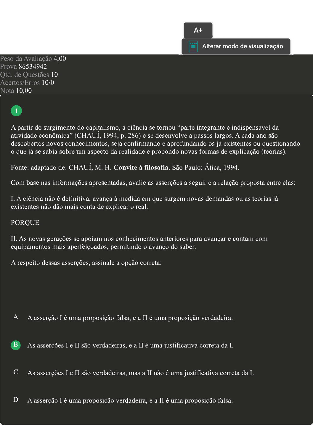 <p>A+ Alterar modo de visualização Peso da Avaliação 4,00 Prova 86534942 Qtd. de Questões 10 Acertos/Erros 10/0 Nota 10,00 1 A partir do surgimento do capitalismo, a ciência se tornou "parte integrante e indispensável da atividade econômica" (CHAUÍ, 1994, p. 286) e se desenvolve a passos largos. A cada ano são descobertos novos conhecimentos, seja confirmando e aprofundando os já existentes ou questionando que já se sabia sobre um aspecto da realidade e propondo novas formas de explicação (teorias). Fonte: adaptado de: CHAUÍ, M. H. Convite à filosofia São Paulo: Ática, 1994. Com base nas informações apresentadas, avalie as asserções a seguir e a relação proposta entre elas: I. A ciência não é definitiva, avança à medida em que surgem novas demandas ou as teorias já existentes não dão mais conta de explicar real. PORQUE II. As novas gerações se apoiam nos conhecimentos anteriores para avançar e contam com equipamentos mais aperfeiçoados, permitindo avanço do saber. A respeito dessas asserções, assinale a opção correta: A A asserção I é uma proposição falsa, e a II é uma proposição verdadeira. B As asserções I e II são verdadeiras, e a II é uma justificativa correta da I. C As asserções I e II são verdadeiras, mas a II não é uma justificativa correta da I. D A asserção I é uma proposição verdadeira, e a II é uma proposição falsa.</p><p>2 "Enquetes de intenção de voto, conduzidas on-line, aparecem com frequência em períodos eleitorais. Não raro, esses levantamentos, compartilhados em pequenos círculos de amizade, discordam de resultados das pesquisas realizadas pelos grandes institutos, que têm ampla divulgação na mídia. Pesquisas eleitorais são parte do jogo político e podem, de fato, retratar que seria resultado da eleição no momento da consulta. Mas precisam ser bem conduzidas. O que se busca em uma pesquisa de opinião é que ela se aproxime máximo possível do que a população realmente pensa: neste caso, dos votos que serão dados no dia da eleição. Para isso, é essencial que as pessoas selecionadas para responder às perguntas sejam representativas da totalidade dos eleitores [...]. Mesmo considerando que as pesquisas sejam feitas de modo absolutamente correto, ainda é possível que duas delas, tentando retratar mesmo momento, deem resultados diferentes. A apresentação da pesquisa depende de uma análise estatística de dados, e erro estatístico, gerado pelo acaso, sempre pode aparecer apesar de a probabilidade ser baixa, é possível, por exemplo, ao lançar dez dados perfeitamente honestos, obter dez faces com mesmo número e concluir (falsamente, no caso) que os dados estão viciados. Essa incerteza da própria medida é descrita pela margem de erro que acompanha os resultados [...]". Fonte: YAMASHITA, M. Pesquisas são mais confiáveis do que qualquer "Datapovo". Questão de Ciência, 2022. Disponível em: https://bit.ly/424VT9f. Acesso em: 5 jan. 2023. Com base no texto, assinale a alternativa correta: O texto discute a necessidade da adoção de uma metodologia de amostragem que reflita a realidade dos fatos. Isso só é possível adotando uma metodologia estatística para a conversão de dados qualitativos em dados quantitativos, e que a amostragem também seja representativa do O texto discute a necessidade da adoção de uma metodologia de amostragem que reflita os B interesses do contratante da pesquisa, assim a metodologia estatística deve ser ajustada para que maximize a amostragem em locais onde um determinado candidato será escolhido. O texto discute a necessidade de proibir que os institutos de pesquisa realizem os levantamentos C utilizando método estatístico, uma vez que esse método é incapaz de verificar a realidade com confiabilidade aceitável pelos parâmetros científicos. O texto discute a necessidade da adoção de uma metodologia de amostragem que reflita os D anseios dos eleitores que estão mais atentos ao que acontece nas redes sociais. Dessa forma, modelo de pesquisa eleitoral deve refletir a realidade das redes e não da população em 3 O método dialético, usualmente aplicado nas pesquisas qualitativas, sustenta a visão de que os fatos devem ser analisados dentro de um contexto social e que as contradições emergentes desses fatos levarão à criação de novas contradições que requerem soluções inovadoras.</p><p>Considerando dado fragmento de texto sobre as leis que regem a dialética, assinale a alternativa correta: A lei da ação recíproca estabelece que tudo no universo é um processo dinâmico e que cada coisa está em constante relação com as outras, formando uma unidade polar de contrários que se complementam e se transformam. B A passagem da quantidade à qualidade não implica em qualquer mudança significativa nos fenômenos ou fatos estudados. C A mudança dialética se caracteriza pela confirmação constante de uma afirmação, sem haver conflitos ou transformações. D A ação recíproca defende a ideia de que todas as coisas no universo são estáticas e não interagem umas com as outras. 4 Esses métodos, que incluem uma variedade de procedimentos mais tangíveis de pesquisa, são frequentemente utilizados em conjunto nas Ciências Sociais, além disso esses métodos implicam uma abordagem mais prática com relação ao fenômeno e estão restritos a um domínio específico. Sobre diferentes métodos de pesquisa científica, analise as afirmativas a seguir: I. O método ativo envolve estudo de semelhanças e diferenças entre vários grupos ou sociedades para melhorar a compreensão do comportamento humano. II. O método monográfico se concentra no estudo de um aspecto específico, como um grupo étnico ou um período, respeitando a totalidade dos grupos. III. O método estatístico é usado para coletar e analisar dados numéricos para entender as características mais comuns em um determinado grupo. IV. O método experimental e