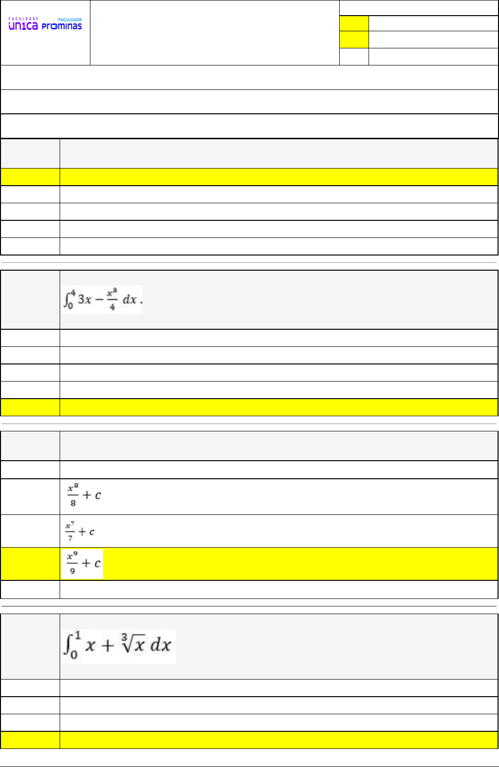 <p>Pincel Atômico - 13/08/2024 17:52:45 1/3</p><p>TASSIO CEDRYCK DE</p><p>OLIVEIRA PEREIRA</p><p>Exercício Caminho do Conhecimento - Etapa 16 (17296)</p><p>Atividade finalizada em 13/08/2024 17:52:16 (2463430 / 1)</p><p>LEGENDA</p><p>Resposta correta na questão</p><p># Resposta correta - Questão Anulada</p><p>X Resposta selecionada pelo Aluno</p><p>Disciplina:</p><p>CÁLCULO DIFERENCIAL E INTEGRAL I E II [1192357] - Avaliação com 8 questões, com o peso total de 1,67 pontos [capítulos - 2]</p><p>Turma:</p><p>Segunda Graduação: Segunda Graduação 6 meses - Licenciatura em Física - Grupo: FPD-JUN/2024 - SGegu0A030724 [133320]</p><p>Aluno(a):</p><p>91640306 - TASSIO CEDRYCK DE OLIVEIRA PEREIRA - Respondeu 8 questões corretas, obtendo um total de 1,67 pontos como nota</p><p>[356432_70965]</p><p>Questão</p><p>001</p><p>Calculando a antiderivada de ∫sen x – cos x dx encontraremos</p><p>X - cos x - sen x + c</p><p>- cos x + senx + c</p><p>tgx + c</p><p>cos x - senx + c</p><p>cos x + senx + c</p><p>[356432_70934]</p><p>Questão</p><p>002</p><p>Por meio o teorema Fundamental do Cálculo (parte 2) pode-se calcular o valor de</p><p>Dessa forma, o valor encontrado é :</p><p>9</p><p>10</p><p>7</p><p>11</p><p>X 8</p><p>[356432_175507]</p><p>Questão</p><p>003</p><p>Calculando a antiderivada de ∫ x8 dx encontraremos</p><p>x8+c</p><p>X</p><p>x9 + c</p><p>[356432_70109]</p><p>Questão</p><p>004</p><p>Por meio o teorema Fundamental do Cálculo (parte 2) pode-se calcular o valor de</p><p>Dessa forma, o valor encontrado é :</p><p>3/4</p><p>1/2</p><p>4/3</p><p>X 5/4</p><p>Pincel Atômico - 13/08/2024 17:52:45 2/3</p><p>4/5</p><p>[356434_70116]</p><p>Questão</p><p>005 Calculando a antiderivada de encontraremos :</p><p>X</p><p>[356434_70119]</p><p>Questão</p><p>006</p><p>Calculando a integral a antiderivada encontrada é :</p><p>X</p><p>[356432_70111]</p><p>Questão</p><p>007 Calculando a antiderivada de encontramos :</p><p>Pincel Atômico - 13/08/2024 17:52:45 3/3</p><p>X</p><p>[356432_70929]</p><p>Questão</p><p>008</p><p>Por meio o teorema Fundamental do Cálculo (parte 2) pode-se calcular o valor de</p><p>Dessa forma, o valor encontrado é :</p><p>3</p><p>7</p><p>X 6</p><p>5</p><p>4</p>