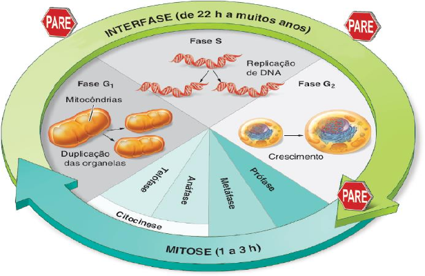 <p>Câncer de Pulmão</p><p>OBJ: 01 Entender o processo de carcinogênese</p><p>ciclo celular é uma sequência ordenada de eventos que ocorrem à medida que uma</p><p>célula duplica o seu conteúdo e se divide (Figura 6.1). Durante o ciclo celular a</p><p>informação genética é duplicada, e os cromossomos duplicados são devidamente</p><p>alinhados para distribuição entre duas células-filhas geneticamente idênticas.</p><p>O ciclo celular é dividido em quatro fases, conhecidas como G1, S, G2 e M. A fase 1</p><p>(G1, de gap 1, em inglês) vem depois da fase pós-mitótica, quando a síntese de DNA é</p><p>interrompida e se inicia a síntese de RNA (ácido ribonucleico) e proteínas, quando</p><p>começa o crescimento celular.5,6 Durante a fase S (síntese), ocorre a síntese de DNA,</p><p>quando se formam dois conjuntos separados de cromossomos, um para cada célula-</p><p>filha. A fase 2 (G2) representa a fase pré-mitótica e é semelhante à G1, no sentido em</p><p>que interrompe a síntese de DNA, porém mantém a síntese de RNA e de proteínas. As</p><p>fases G1, S e G2 são chamadas de interfase. A fase M (mitose) é a fase de divisão</p><p>nuclear, ou mitose, e divisão do citoplasma. Células continuamente em divisão, como</p><p>o epitélio escamoso estratificado da pele, mantêm ininterrupto o ciclo de divisão</p><p>mitótica. Quando as condições ambientais são adversas, como pode acontecer por</p><p>indisponibilidade de nutriente ou fator de crescimento, ou quando são altamente</p><p>especializadas, as células podem deixar o ciclo celular, tornando-se mitoticamente</p><p>quiescentes ou permanecer em um estado de repouso conhecido como G0. As células</p><p>em G0 podem tornar a entrar no ciclo celular em resposta à existência de nutrientes</p><p>extracelulares, fatores de crescimento, hormônios e outros sinais, como perda</p><p>sanguínea ou lesão tecidual que dispara o mecanismo de crescimento celular.7</p><p>Células altamente especializadas e diferenciadas, como os neurônios, podem</p><p>permanecer indefinidamente em G0.</p><p>Dentro do ciclo celular, podem ser efetuadas pausas, se eventos específicos de cada</p><p>fase do ciclo celular não tiverem sido completados. Por exemplo, a mitose é impedida</p><p>até que o DNA seja replicado adequadamente. Além disso, a separação dos</p><p>cromossomos na mitose é adiada até que todas as fibras do fuso se liguem aos</p><p>cromossomos. Estas são oportunidades para verificar a precisão do processo de</p><p>replicação do DNA. Esses pontos de controle de danos ao DNA possibilitam a</p><p>identificação de defeitos e os reparos, garantindo que cada célula-filha receba um</p><p>conjunto completo de informação genética, idêntico ao da célula-mãe.6</p><p>As ciclinas são um grupo de proteínas que controlam a entrada e a progressão das</p><p>células mediante o ciclo celular. As ciclinas se conectam a proteínas chamadas</p><p>quinases dependentes da ciclina (CDK). As quinases são enzimas que fosforilam</p><p>proteínas. As CDK fosforilam proteínas-alvo específicas e são expressas de modo</p><p>contínuo ao longo do ciclo celular, mas em uma forma inativa, enquanto as ciclinas</p><p>são sintetizadas durante fases específicas do ciclo celular e, em seguida, degradadas</p><p>pela via da ubiquitinação assim que sua tarefa é completada. Embora cada uma das</p><p>fases do ciclo celular seja cuidadosamente controlada, a transição de G2 para M é</p><p>considerada um dos pontos mais importantes de controle do ciclo celular. Além da</p><p>síntese e degradação das ciclinas, os complexos de ciclina-CDK são regulados pela</p><p>ligação de inibidores de CDK (CKI). Os CKI são particularmente importantes na</p><p>regulação de pontos de controle do ciclo celular durante os quais são reparados erros</p><p>na replicação do DNA.8 A manipulação de ciclinas, CDK e CKI é a base para o</p><p>desenvolvimento de novas formas de terapia medicamentosa possíveis de serem</p><p>utilizadas no tratamento do câncer</p><p>Proliferação celular</p><p>Proliferação celular é o processo de aumento no número de células por divisão</p><p>mitótica. Em tecidos normais, a proliferação celular é regulada de modo que o número</p><p>de células em divisão ativa é equivalente ao número de células mortas ou perdidas.</p><p>Nos seres humanos, existem duas grandes categorias de células: os gametas e as</p><p>células somáticas. Os gametas (óvulo e espermatozoide) são células haploides, com</p><p>apenas um conjunto de cromossomos de um dos pais, e são projetados</p><p>especificamente para a fusão sexual. Após a fusão, é formada uma célula diploide</p><p>contendo os dois conjuntos de cromossomos. Essa é a célula somática, que passa a</p><p>formar o resto do organismo.</p><p>Em termos de proliferação celular, os 200 diferentes tipos de células que compõem o</p><p>organismo podem ser divididos em três grandes grupos:</p><p>•Neurônios e células da musculatura esquelética e do músculo cardíaco, que são bem</p><p>diferenciados e raramente se dividem e se reproduzem</p><p>Tipos de crescimento celular</p><p>↠ A proliferação celular pode ser controlada ou não controlada (INCA, 2011)</p><p>. ↠ No crescimento controlado, tem-se um aumento localizado e autolimitado do</p><p>número de células de tecidos normais que formam o organismo, causado por</p><p>estímulos fisiológicos ou patológicos. Nele, as células são normais ou com pequenas</p><p>alterações na sua forma e função, podendo ser iguais ou diferentes do tecido onde se</p><p>instalam. O efeito é reversível após o término dos estímulos que o provocaram</p><p>↠ No crescimento não controlado, tem-se uma massa anormal de tecido, cujo</p><p>crescimento é quase autônomo, persistindo dessa maneira excessiva após o término</p><p>dos estímulos que o provocaram. As neoplasias (câncer in situ e câncer invasivo)</
