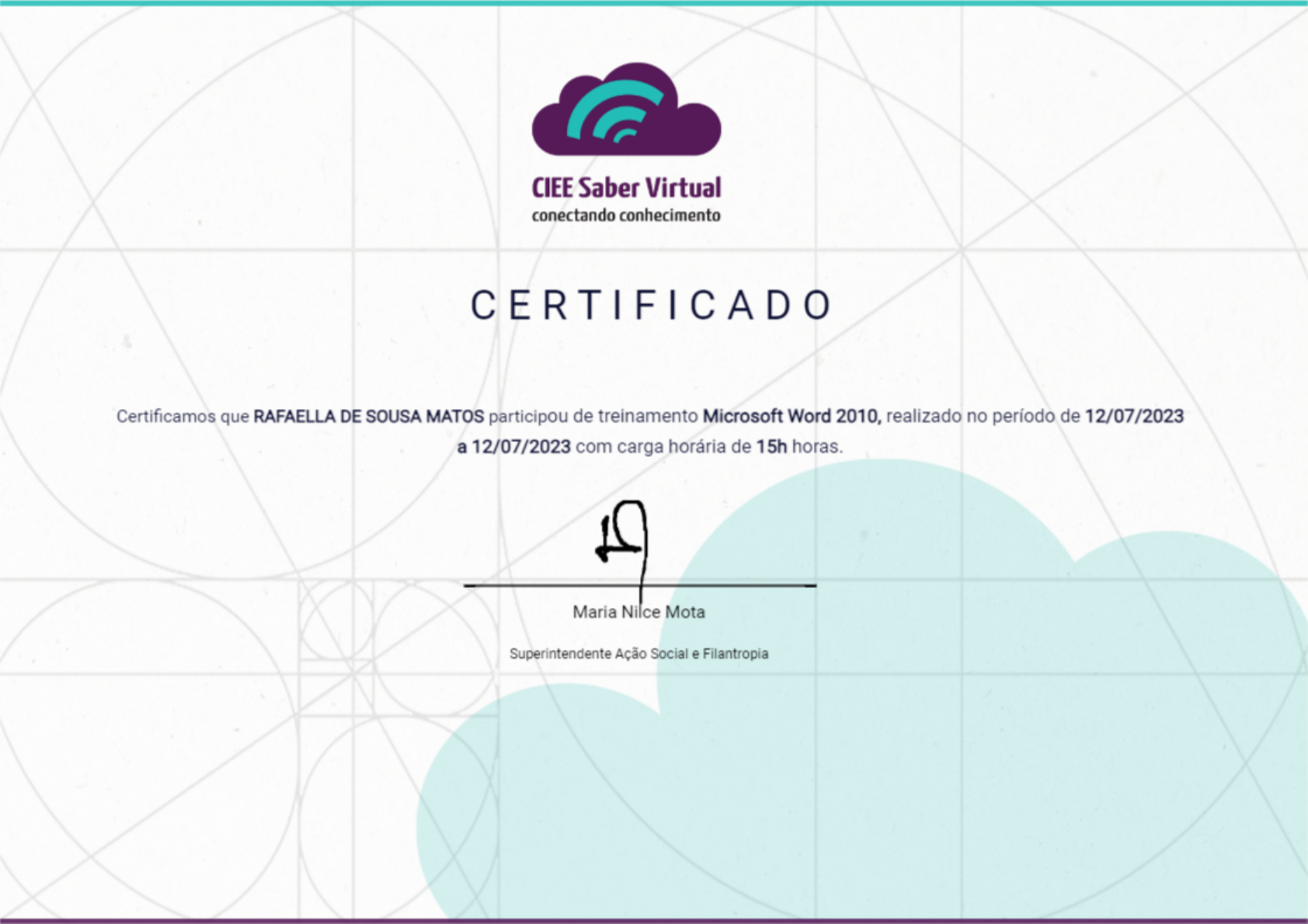 <p>CIEE Saber Virtual conectando conhecimento CERTIFICADO Certificamos que RAFAELLA DE SOUSA MATOS participou de treinamento Microsoft Word 2010, realizado no período de 12/07/2023 a 12/07/2023 com carga horária de 15h horas. Maria Nilce Mota Superintendente Ação Social e Filantropia</p>