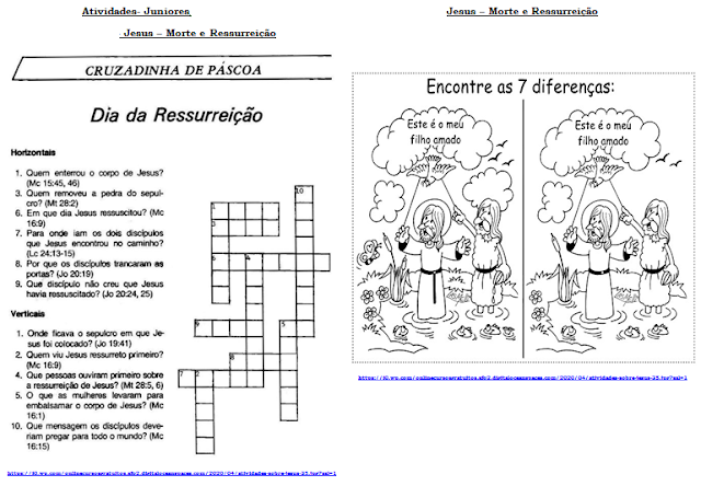 <p>Atividades Juniores - Morte e Jesus - Morte Ressurreição CRUZADINHA DE PASCOA Encontre as 7 diferenças: Dia da Ressurreição Este é Este é 0 filho filho 1. Quem enterrou o corpo de Jesus? (Mc 15:45, 3. removeu a pedra do cro? (Mt 28:2) 6. Em que dia Jesus (Mc 16:9) 7. Para onde os dois discipulos que Jesus no caminho? 24:13-15) 8. Por que os trancaram as portas? (Jo 20:19) 9. Que não que Jesus havia (Jo 20:24, 25) Verticais 1. Onde ficava o em que Je foi colocado? (Jo 19:41) Quem viu Jesus ressurreto primeiro? (Mc 4. Que pessoas primeiro sobre a de Jesus? 6) 5. que as para embalsaman o corpo de Jesus? (Mc 16:1)</p>