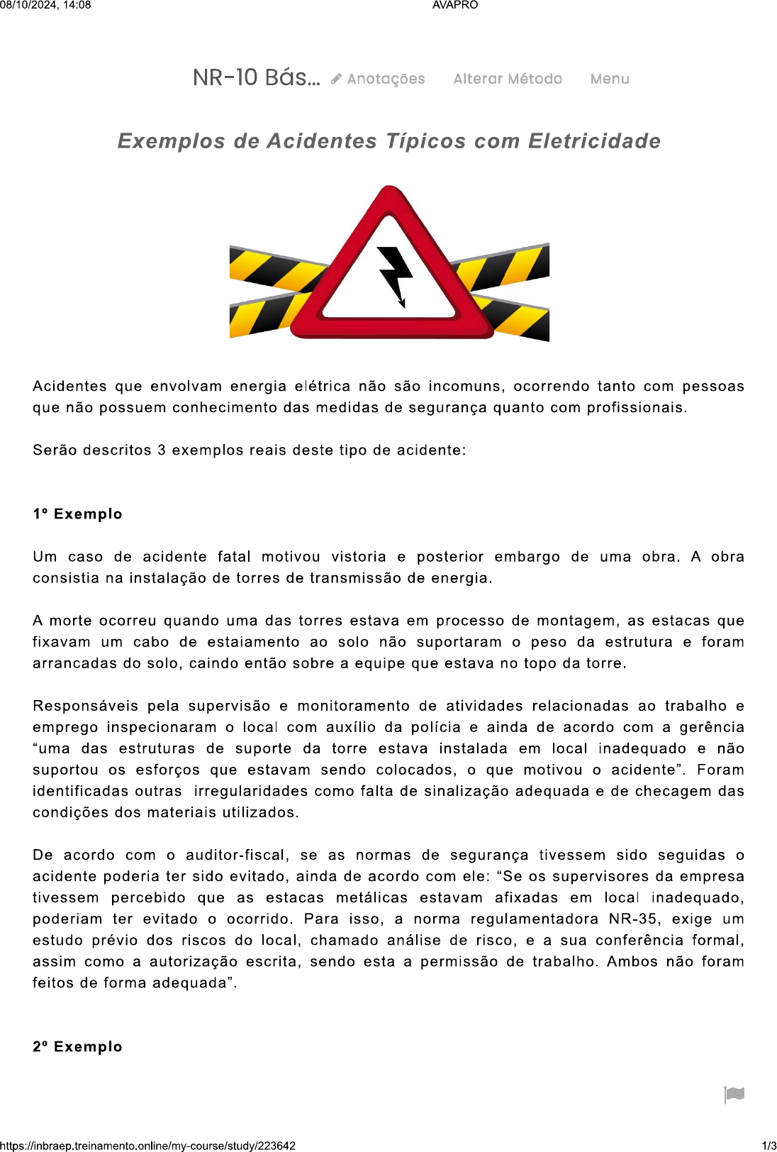 <p>08/10/2024, 14:08 AVAPRO NR-10 Bás.. Anotações Alterar Método Menu Exemplos de Acidentes Típicos com Eletricidade Acidentes que envolvam energia elétrica não são incomuns, ocorrendo tanto com pessoas que não possuem conhecimento das medidas de segurança quanto com profissionais. Serão descritos 3 exemplos reais deste tipo de acidente: 1° Exemplo Um caso de acidente fatal motivou vistoria e posterior embargo de uma obra. A obra consistia na instalação de torres de transmissão de energia. A morte ocorreu quando uma das torres estava em processo de montagem, as estacas que fixavam um cabo de ao solo não suportaram o peso da estrutura e foram arrancadas do solo, caindo então sobre a equipe que estava no topo da torre. Responsáveis pela supervisão e monitoramento de atividades relacionadas ao trabalho e emprego inspecionaram o local com auxílio da polícia e ainda de acordo com a gerência "uma das estruturas de suporte da torre estava instalada em local inadequado e não suportou os esforços que estavam sendo colocados, o que motivou o acidente". Foram identificadas outras irregularidades como falta de sinalização adequada e de checagem das condições dos materiais utilizados. De acordo com o auditor-fiscal, se as normas de segurança tivessem sido seguidas o acidente poderia ter sido evitado, ainda de acordo com ele: "Se os supervisores da empresa tivessem percebido que as estacas metálicas estavam afixadas em local inadequado, poderiam ter evitado o ocorrido. Para isso, a norma regulamentadora NR-35, exige um estudo prévio dos riscos do local, chamado análise de risco, e a sua conferência formal, assim como a autorização escrita, sendo esta a permissão de trabalho. Ambos não foram feitos de forma adequada". 2° Exemplo https://inbraep.treinamento.online/my-course/study/223642 1/3</p><p>14:08 AVAPRO Outro acidente aconteceu em Sorocaba, onde o Corpo de Bombeiros socorreu dois homens, funcionários de uma empresa de outdoors, que tiveram um acidente com rede elétrica. Os dois homens encostaram uma barra metálica na rede de alta tensão. Antes da chegada dos Bombeiros, um terceiro funcionário conseguiu retirá-los da zona energizada, porém as vítimas já estavam com nível de consciência reduzido, tendo sofrido queimaduras de terceiro grau na região dos braços e pés e um deles estava expelindo sangue pelas vias aéreas superiores. A empresa responsável pela energia elétrica da cidade apoiou no atendimento e as vítimas seguiram em observação após o atendimento. 3° Exemplo Como último exemplo temos o que ocorreu quando um homem veio a óbito enquanto trabalhava no telhado de zinco de um restaurante em Parauapebas. A vítima sofreu uma carga de 13.800 volts ao encostar em um fio da rede elétrica que passa no local. A proximidade do corpo e do telhado de zinco, que é um forte condutor elétrico, com a rede elétrica, dificultou a remoção do corpo, que só foi possível após desligamento da eletricidade do local por uma equipe especializada, o que ocorreu somente após algumas horas. ocorrido foi atendido pelos Bombeiros, Serviço de Atendimento Móvel de Urgência (SAMU), Polícia Militar (PM) e acompanhado por familiares e curiosos. Acidentes que envolvem energia elétrica são muito comuns, há várias pesquisas sobre o tema e os índices não são positivos. E a maioria destes acidentes podem ser evitados tomando as medidas de segurança necessárias, recomendadas e regulamentadas, bem como com o uso de EPI's. Só é necessário que os envolvidos se conscientizem e procurem as instruções necessárias. Avalie o Tema: Voltar Avançar Voltar Avalie o Tema: Referências Bibliográficas Comentários https://inbraep.treinamento.online/my-course/study/223642 2/3</p><p>08/10/2024, 14:08 AVAPRO Fechar Tema: Exemplos de Acidentes Típicos com Eletricidade Acidentes de Origem Elétrica 1 - Acidentes de Origem Elétrica - Causas Diretas e Indiretas de Acidentes Elétricos 3 - Exemplos de Acidentes Típicos com Eletricidade Técnicas de Análise de Riscos Medidas de Controle do Risco Elétrico Equipamentos de Proteção Coletiva - EPC Envie uma mensagem: Assunto* Mensagem Deixe sua sugestão, avaliação, crítica ou comentário aqui. Enviar Observação AVAPRO https://inbraep.treinamento.online/my-course/study/223642 3/3</p>